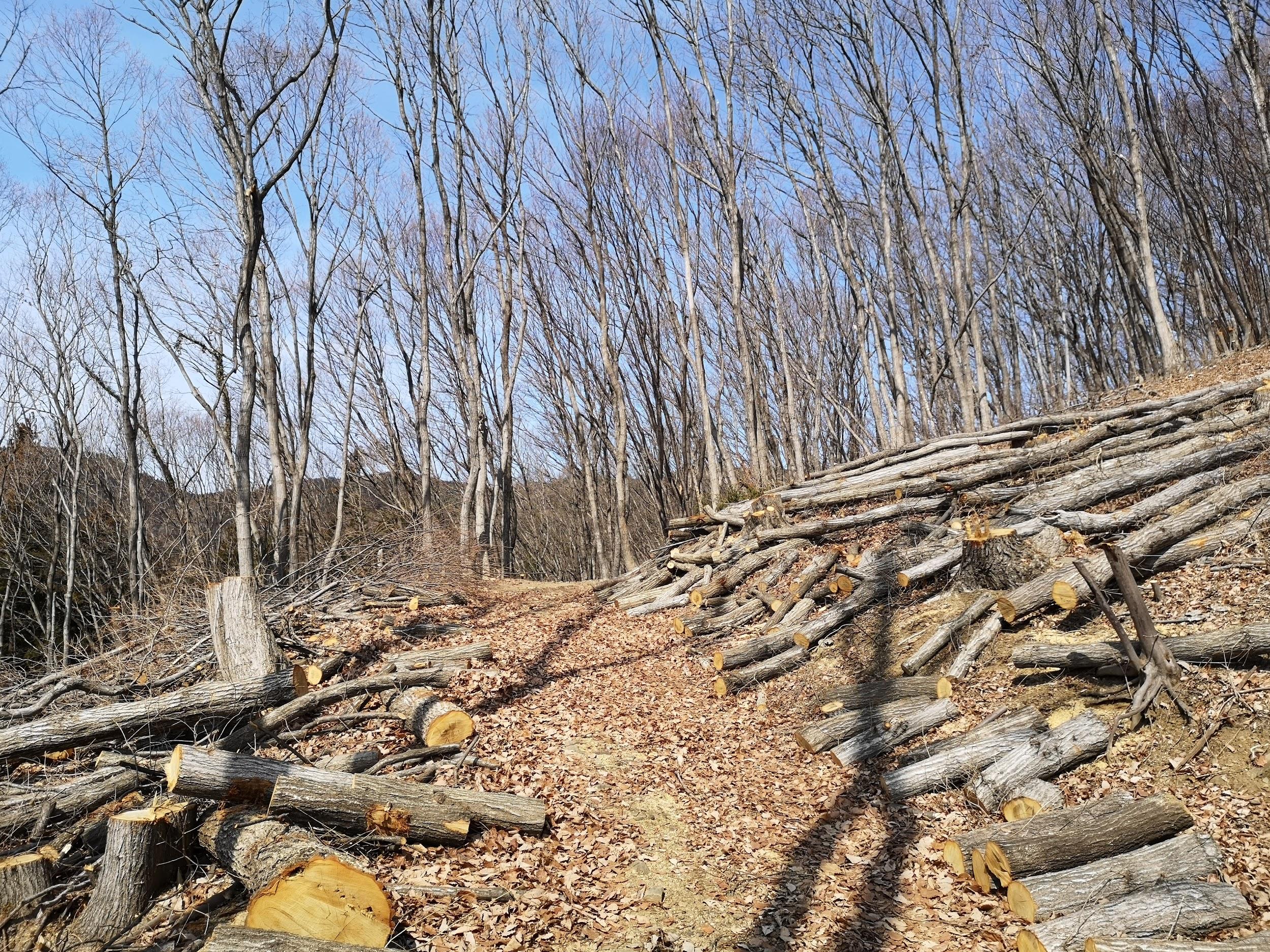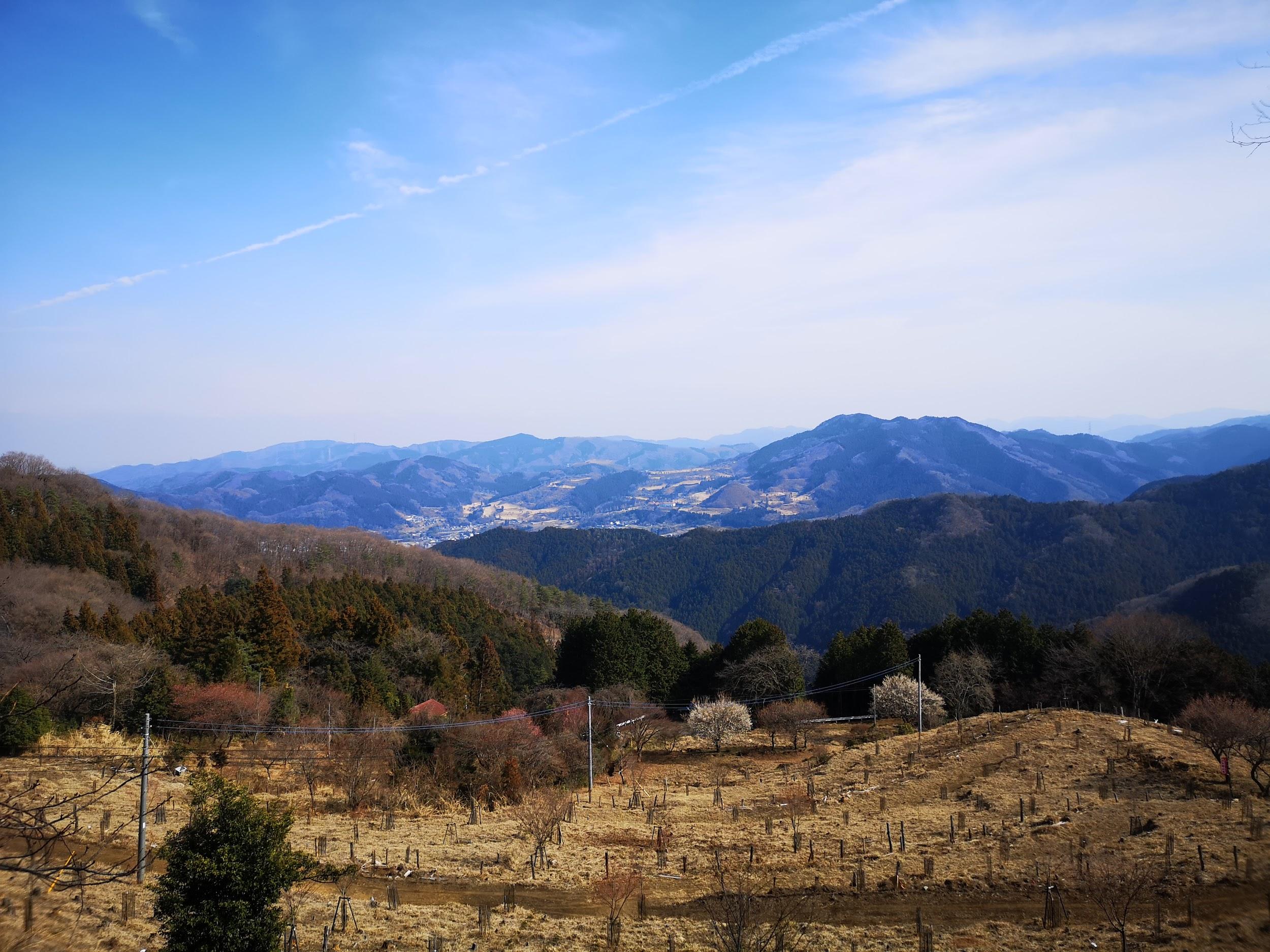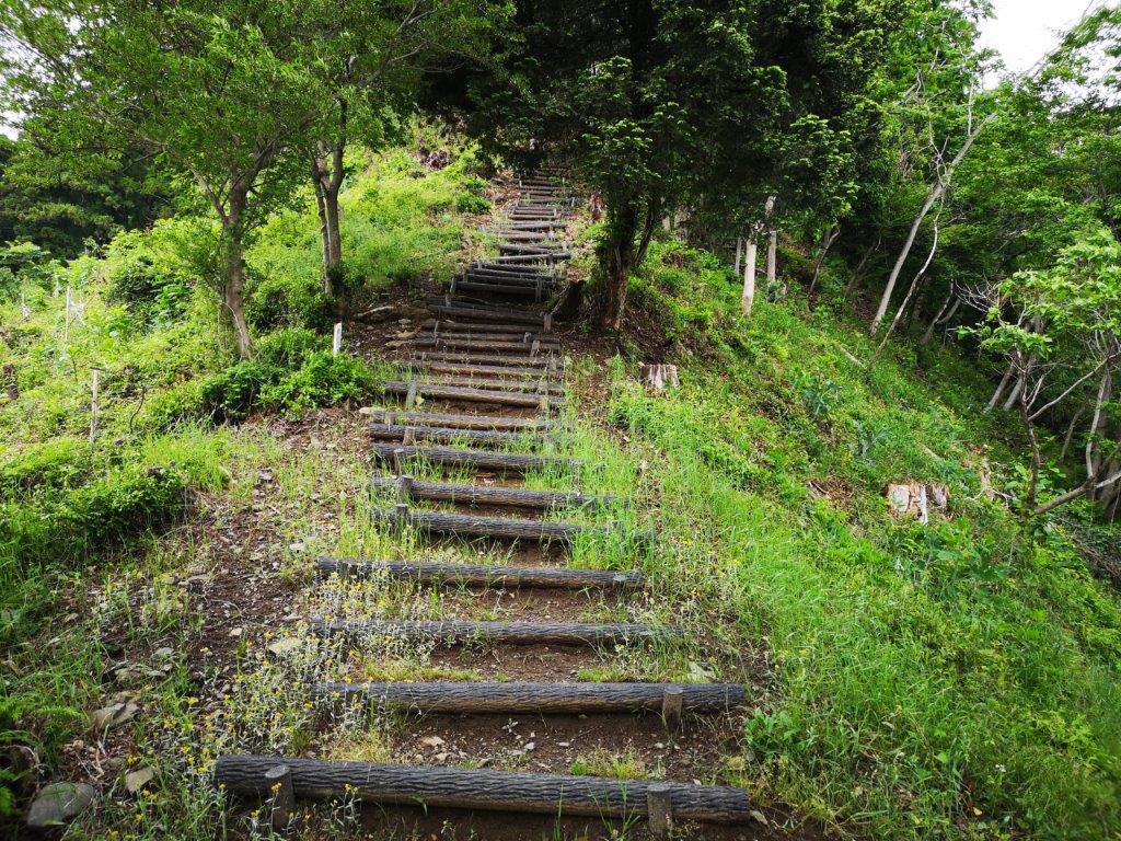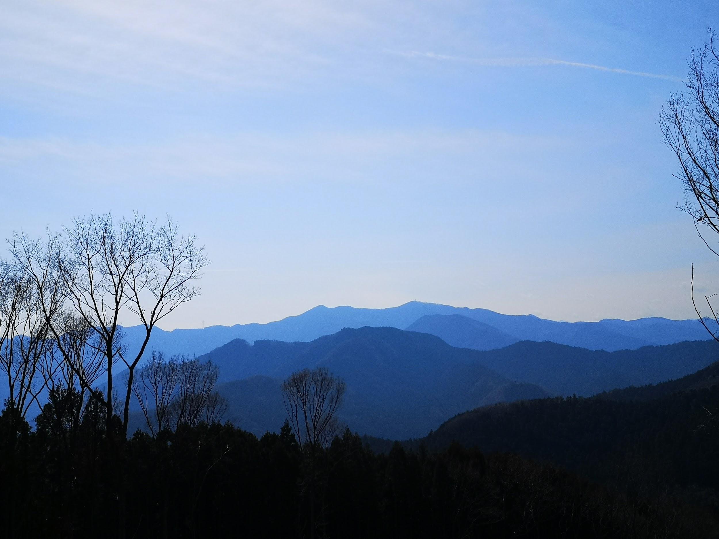 It was already quite warm as I got off the bus in the middle of the countryside. Since it was 11am, I started almost right away, up a winding road through fields and then forest. Half an hour later, I passed Ishiwari-zakura (石割桜), a massive cherry blossom tree I had hoped to catch in full bloom, but was already well into green leaves stage. After passing a junction where a steep road led down to a parking lot on the left side, I arrived at the official start of today’s hike, a dirt road hugging a deforested mountain side.