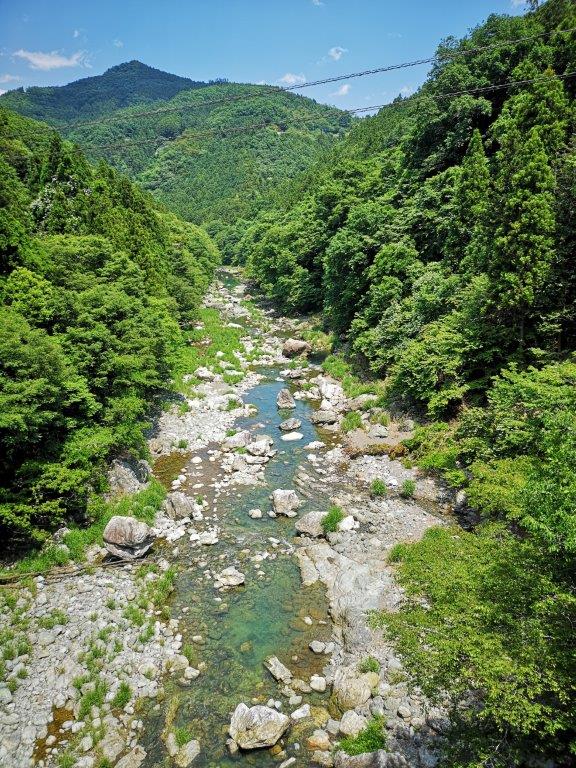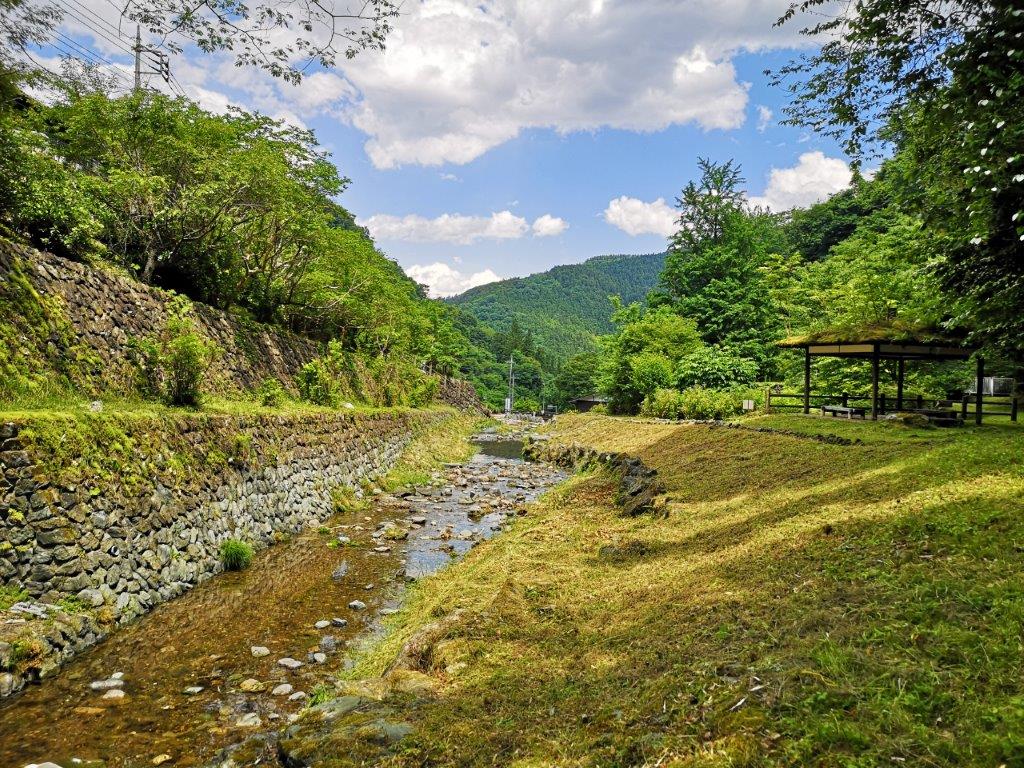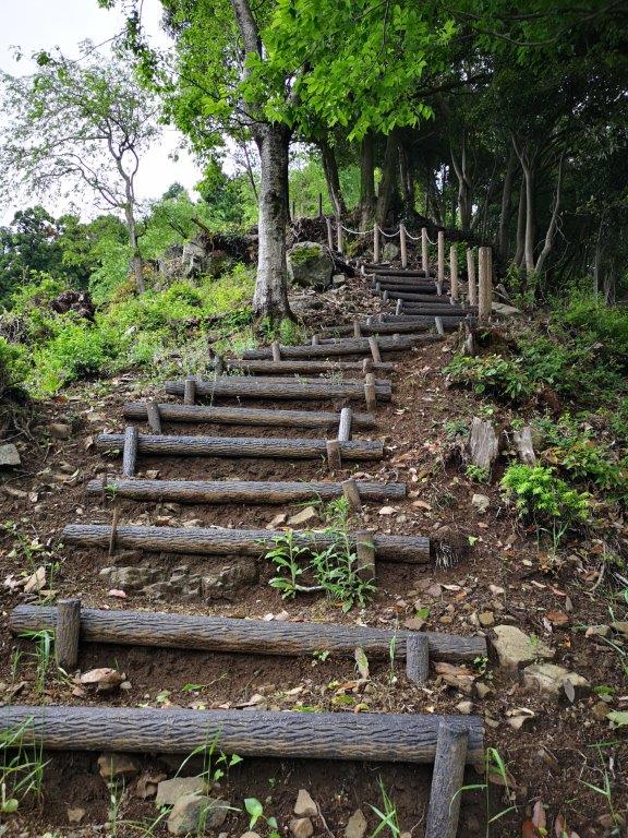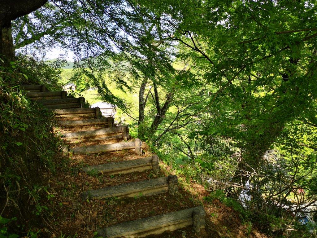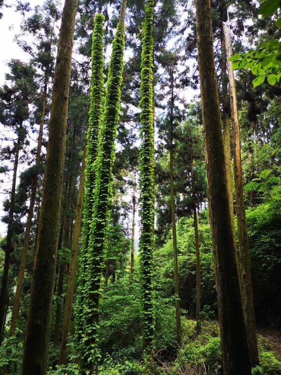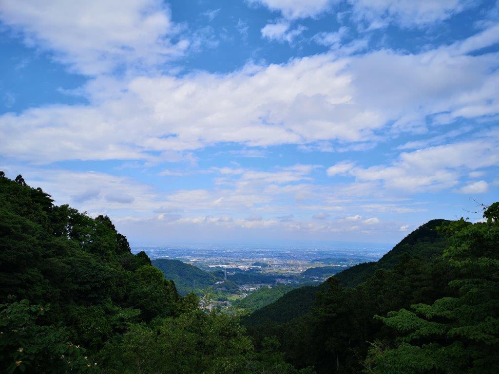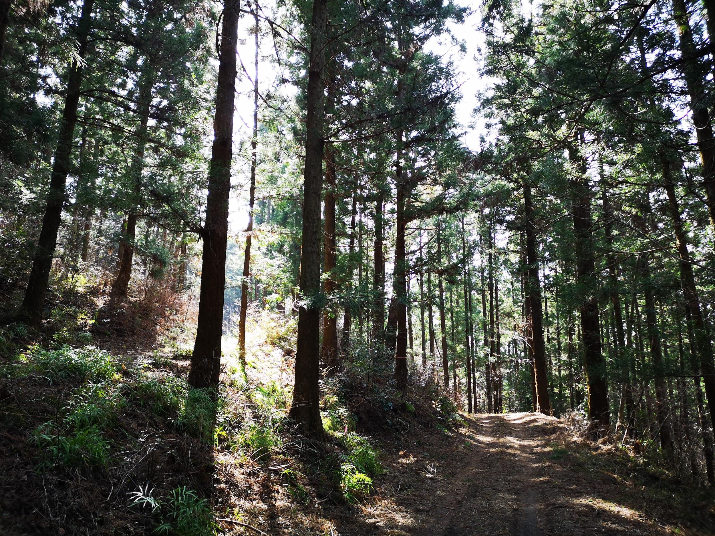 It was already quite warm as I got off the bus in the middle of the countryside. Since it was 11am, I started almost right away, up a winding road through fields and then forest. Half an hour later, I passed Ishiwari-zakura (石割桜), a massive cherry blossom tree I had hoped to catch in full bloom, but was already well into green leaves stage. After passing a junction where a steep road led down to a parking lot on the left side, I arrived at the official start of today’s hike, a dirt road hugging a deforested mountain side.