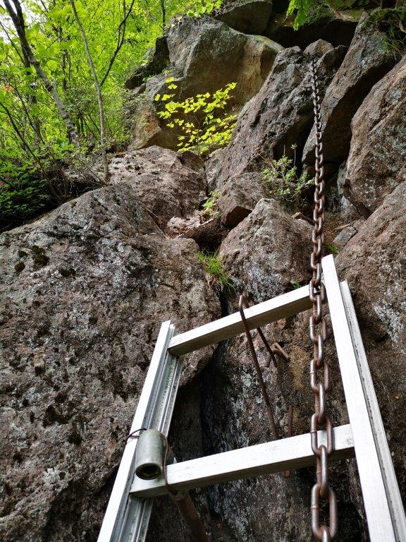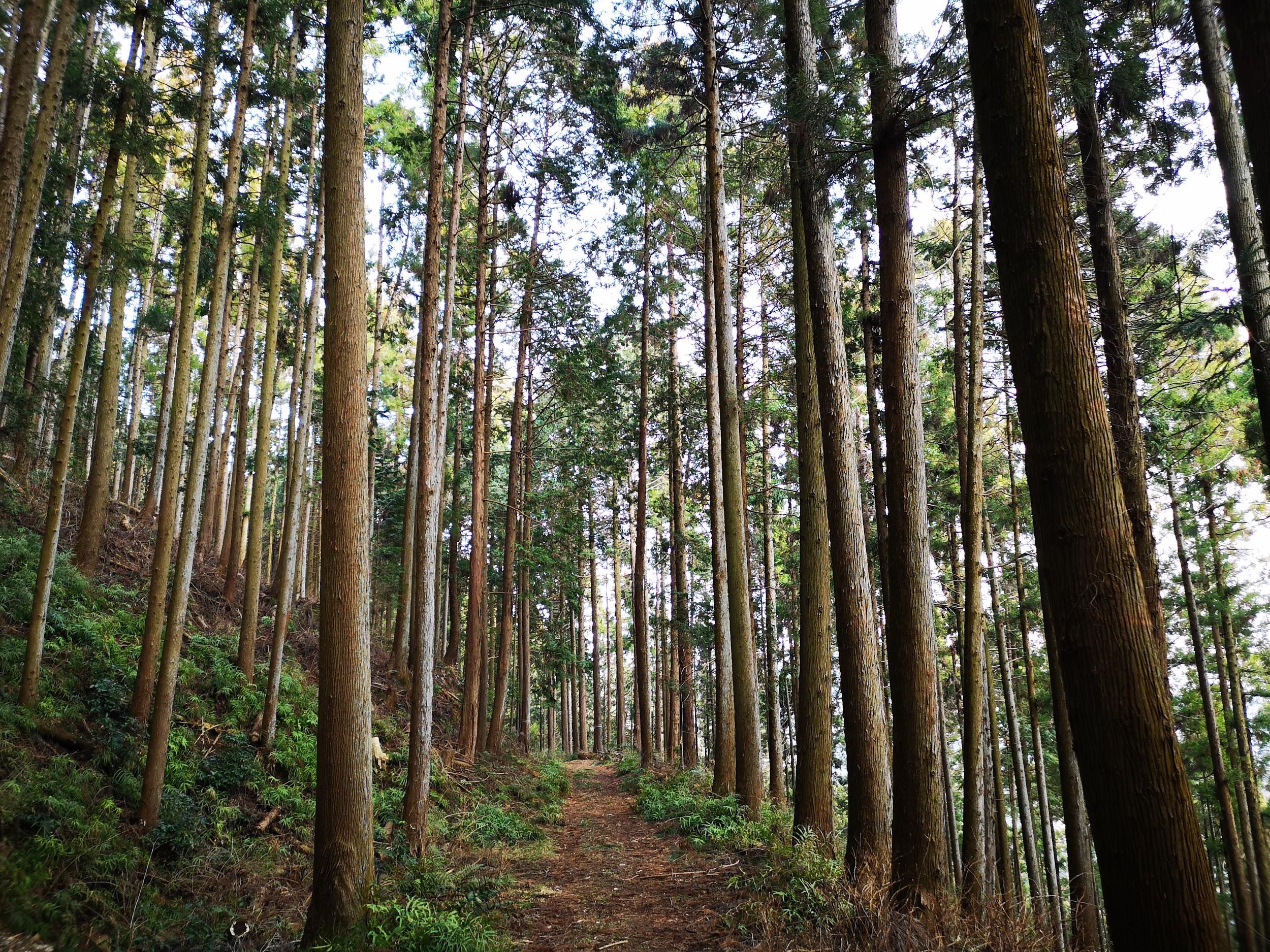 I was following a narrow ridge with tall red pines on my left and a deforested area on my right, allowing for plenty of views along the descent. I soon turned left, onto a path between two rows of fir trees, the end of the scenic descent. After a short while, I entered a mixed forest, and after a short section where the only trace of a path was again a helpful rope hung between trees, I reached a winding forest road heading down through tall cedars.