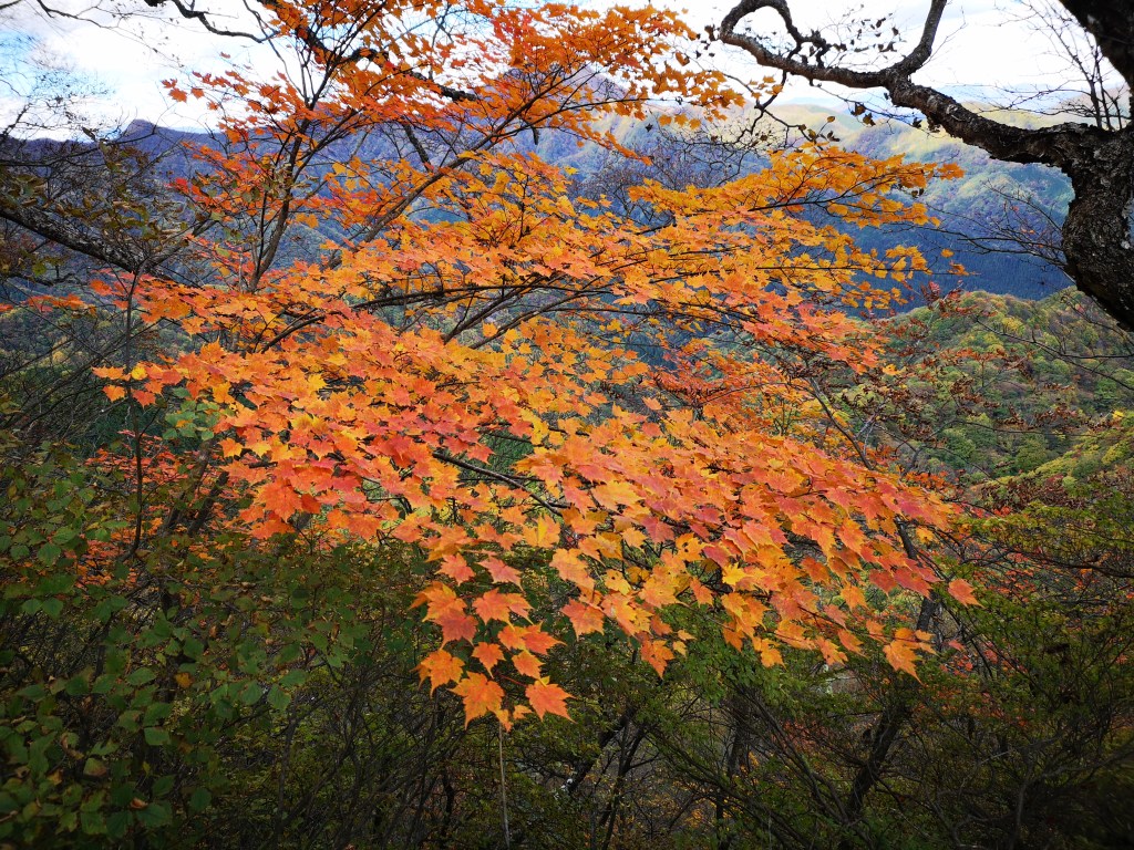 Here, the trail was buried under dead leaves and would have been hard to follow, if it weren’t for rope attached to nearby trees. I soon emerged from the trees and was greeted with a spectacular view on the northwest side. To my right, I had a better view of the snowy summit of Mt Hotaka, framed by mountain cherry trees. On the west side, I could once again see Mt Mitsumine and Mt Tanigawa. As I descended this valley surrounded by snow-capped mountains, I almost felt like I was walking in the Swiss Alps.