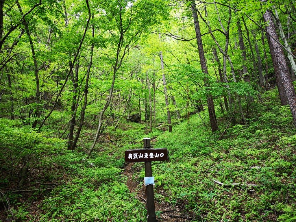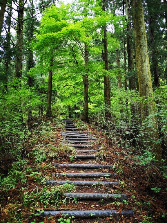 I was stunned by the profusion of the new green of Spring in all directions; at one point, I witnessed a flurry of white blossoms blowing across the path, coming from some unseen mountain cherry tree. After a short switchback section, I reached a flat section along a saddle on the mountain. Although I was now completely in the forest, I enjoyed the peaceful surroundings, few hikers venturing on this not so famous peak.