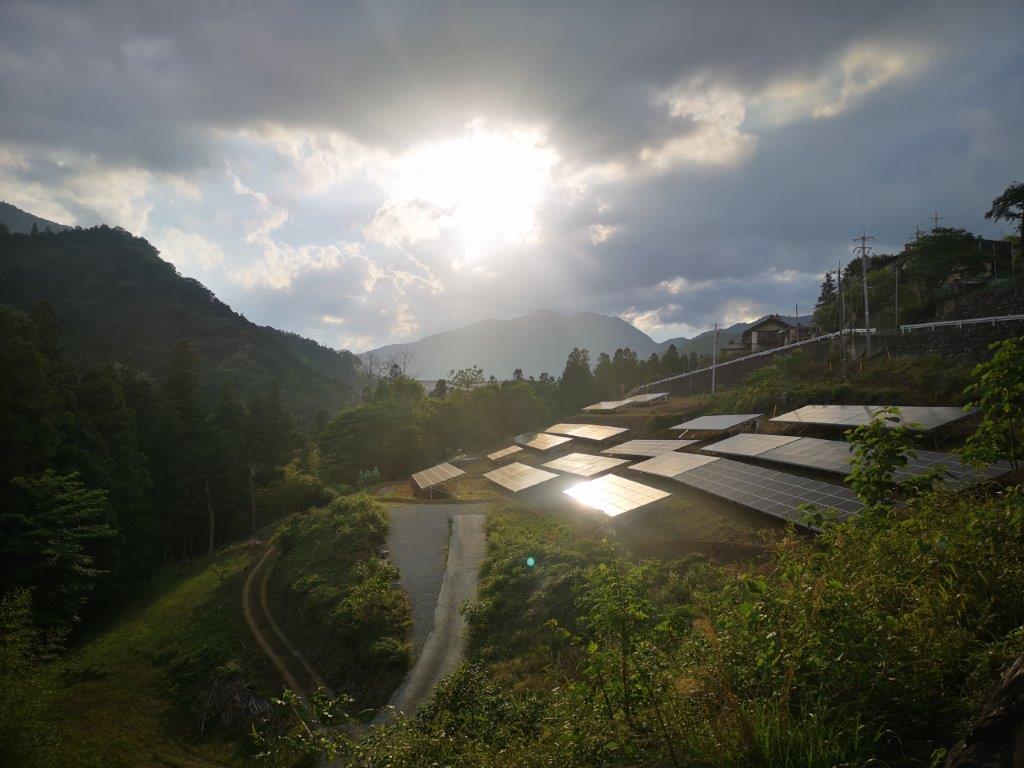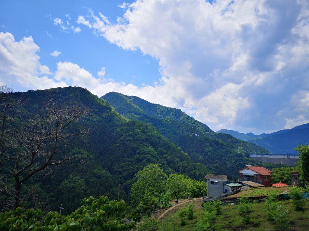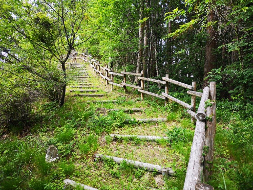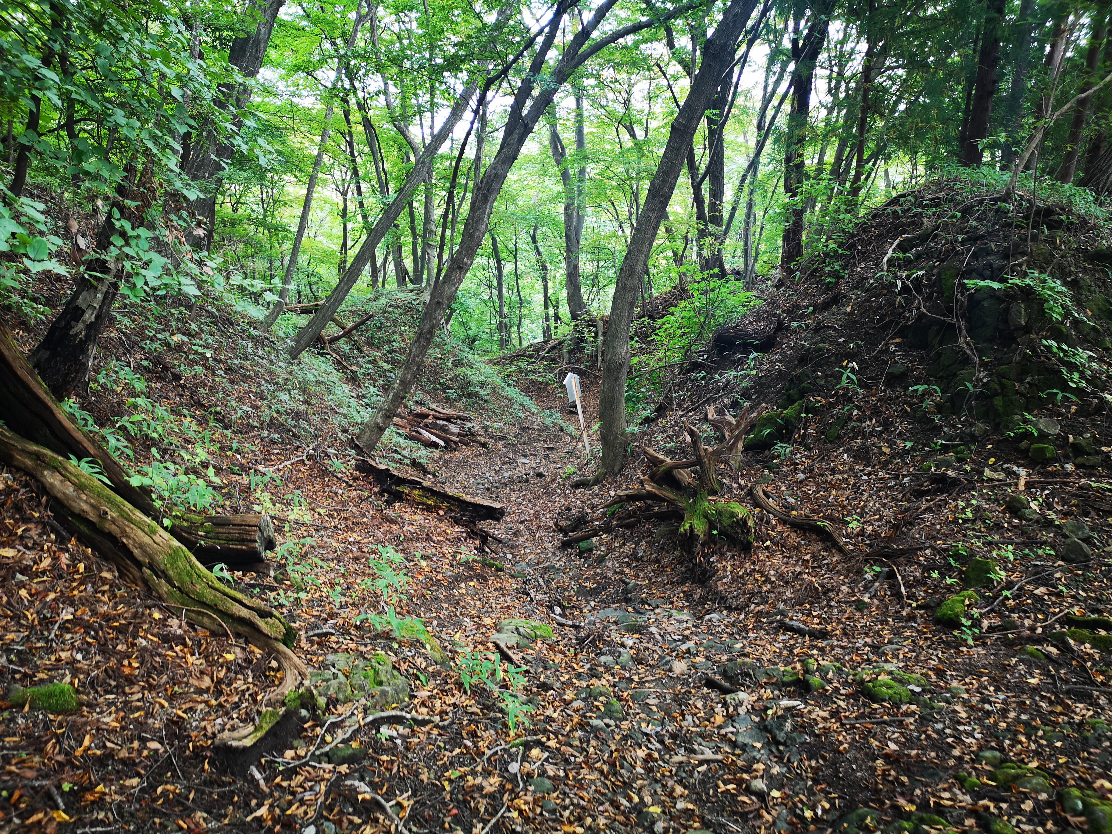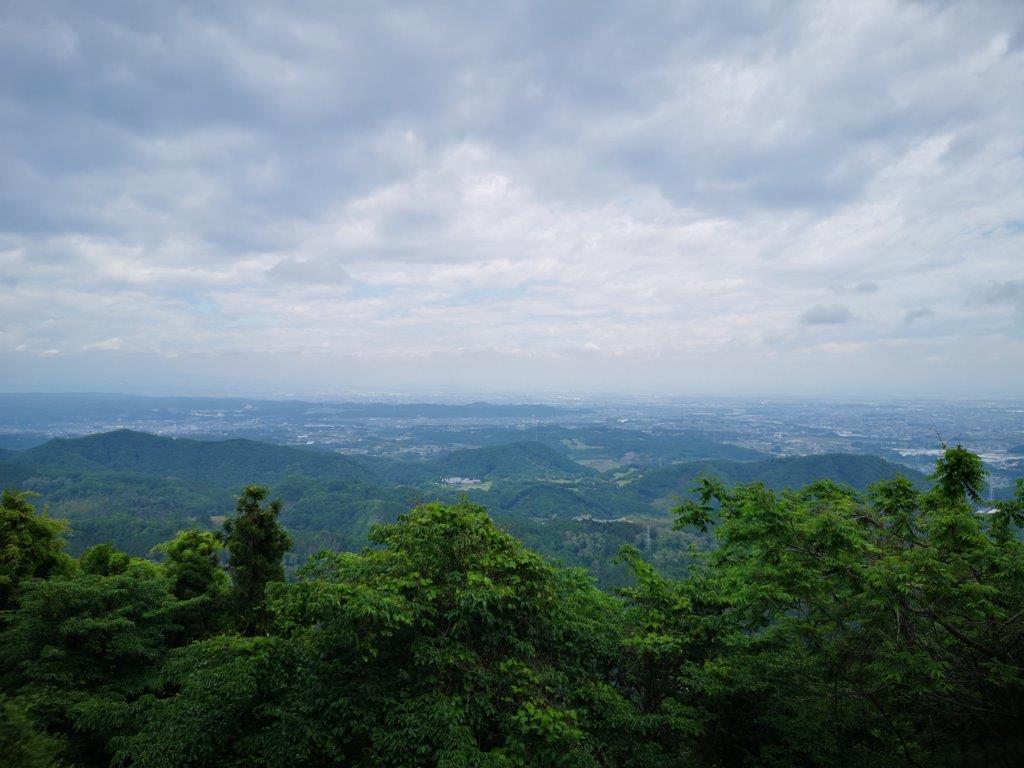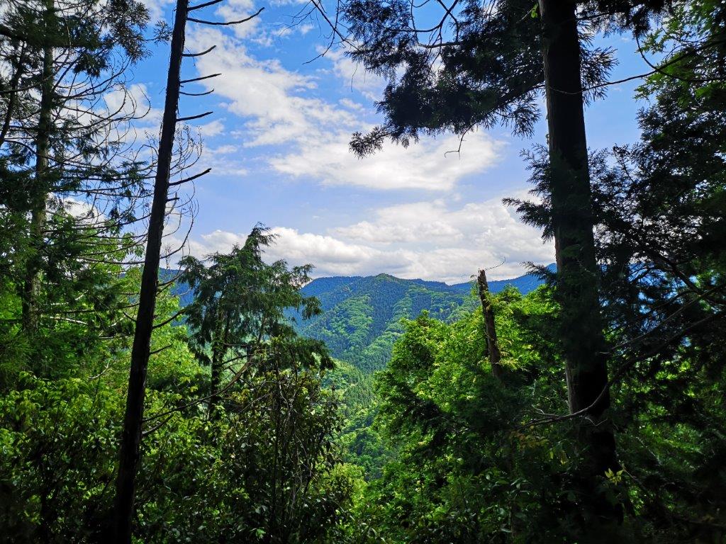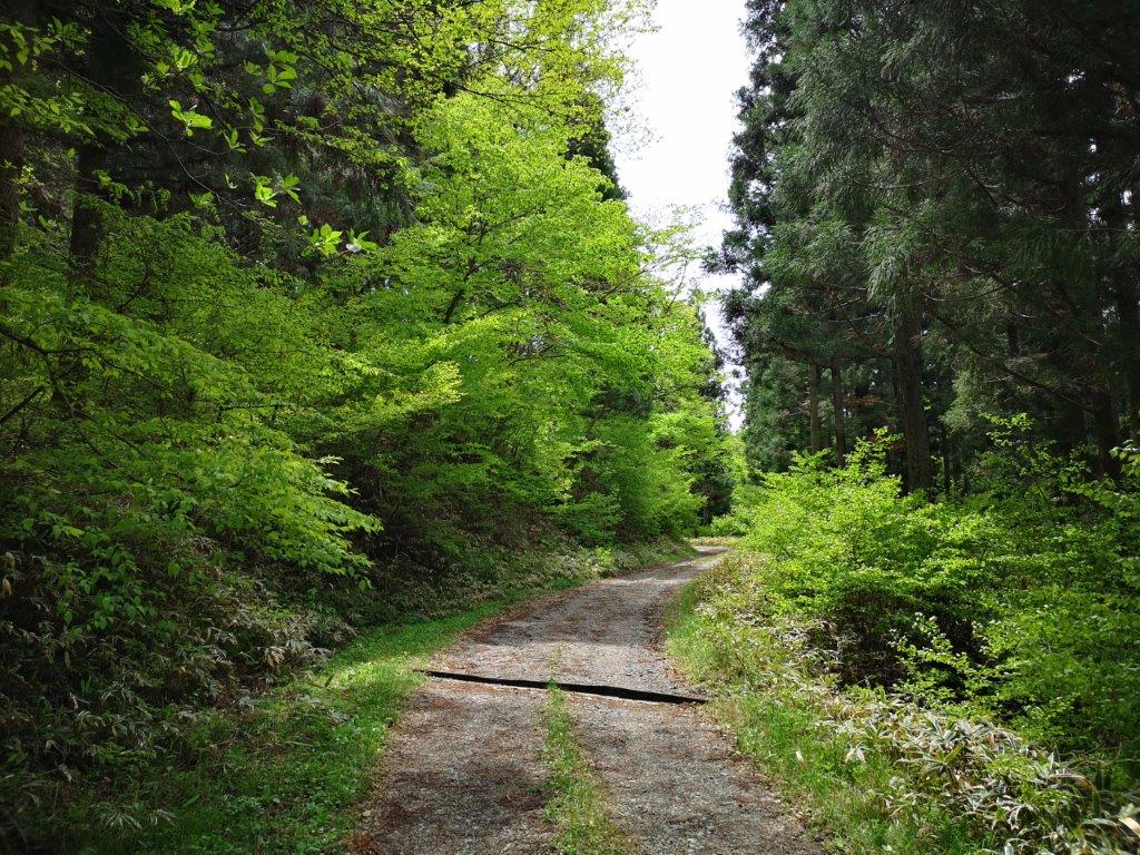 It was already quite warm as I got off the bus in the middle of the countryside. Since it was 11am, I started almost right away, up a winding road through fields and then forest. Half an hour later, I passed Ishiwari-zakura (石割桜), a massive cherry blossom tree I had hoped to catch in full bloom, but was already well into green leaves stage. After passing a junction where a steep road led down to a parking lot on the left side, I arrived at the official start of today’s hike, a dirt road hugging a deforested mountain side.