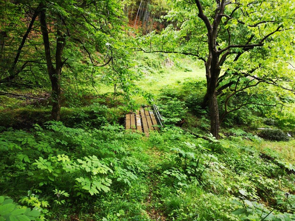 I was stunned by the profusion of the new green of Spring in all directions; at one point, I witnessed a flurry of white blossoms blowing across the path, coming from some unseen mountain cherry tree. After a short switchback section, I reached a flat section along a saddle on the mountain. Although I was now completely in the forest, I enjoyed the peaceful surroundings, few hikers venturing on this not so famous peak.