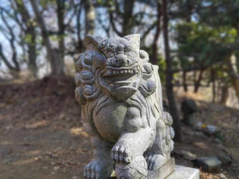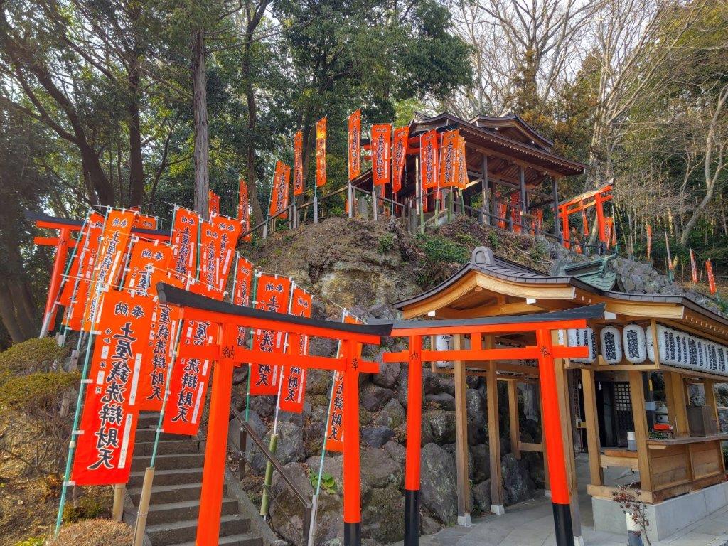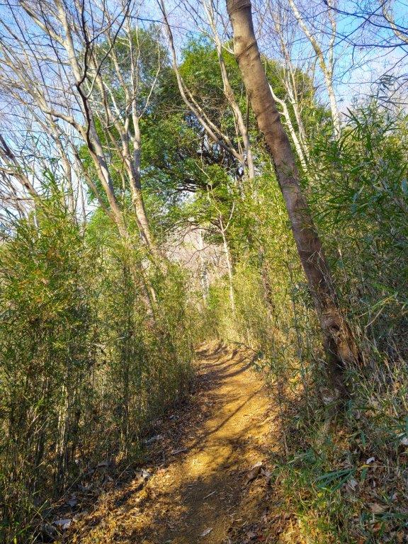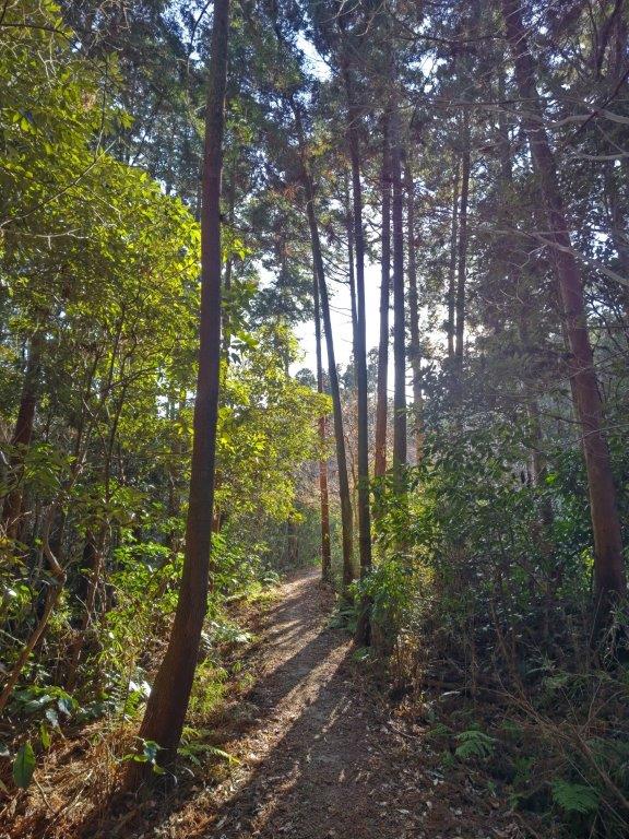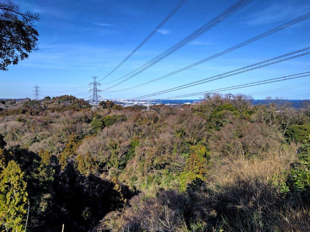 I sped south under blue skies comfortably seated on the “Romance Car”, arriving at Atsugi a little before 1030. There, I boarded a half-full bus for the half-hour ride to Tobio Danchi. After a short walk through a residential neighbourhood, I reached the start of the hiking trail at 1130 at the top of a long staircase. After following a level trail for a short while, I arrived at Sannosha (山王社), a Shinto Shrine at the edge of the forest with a view of the Kanto Plain on the eastern side.