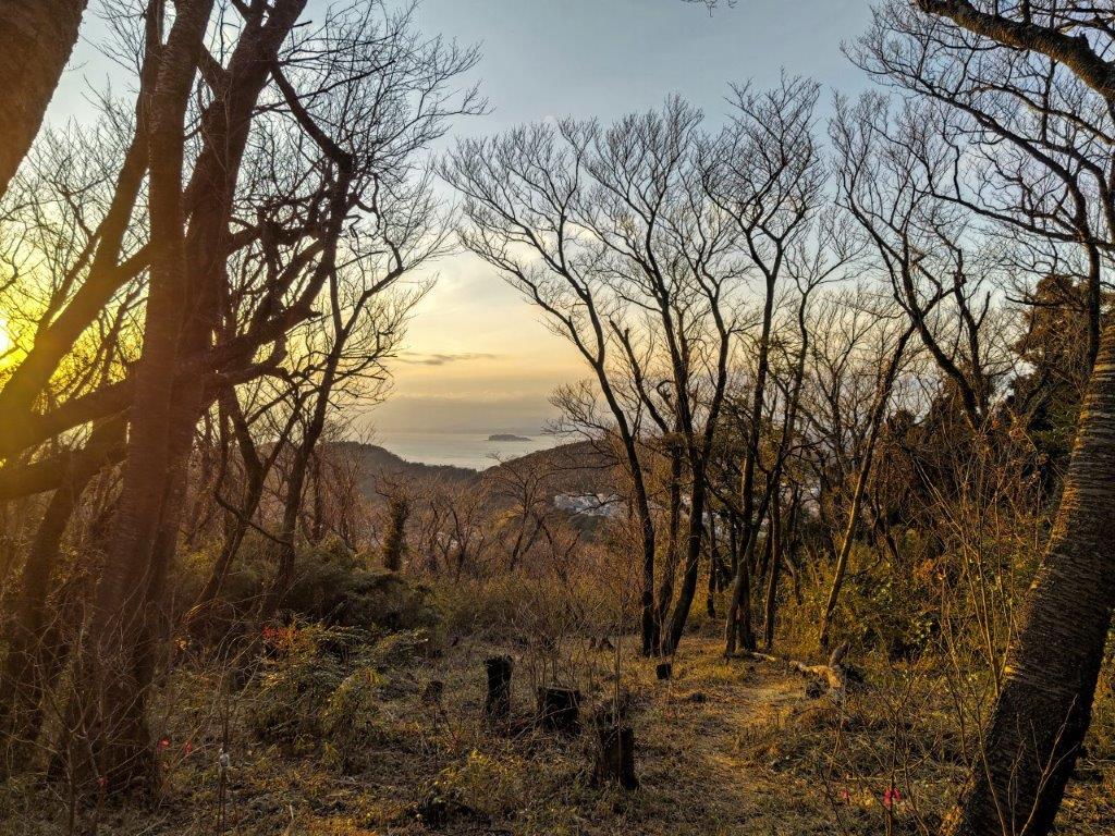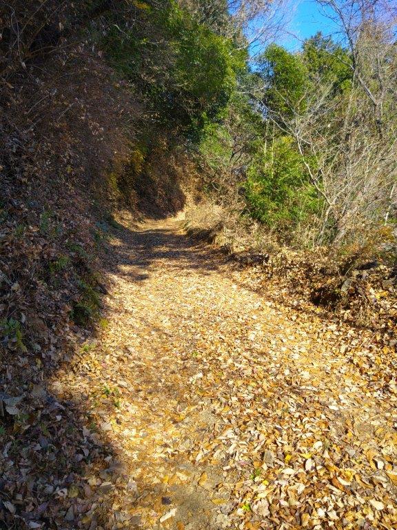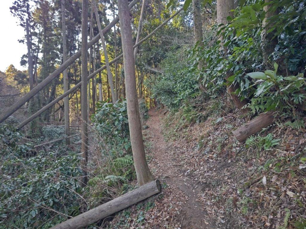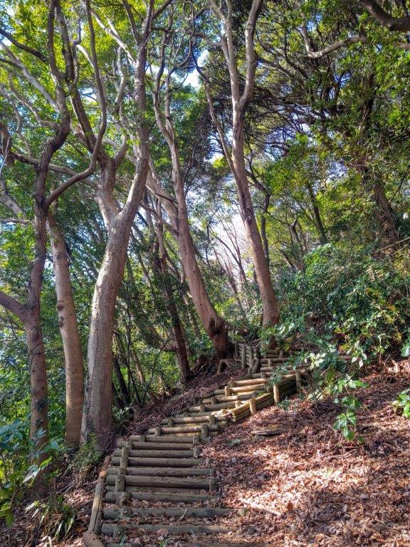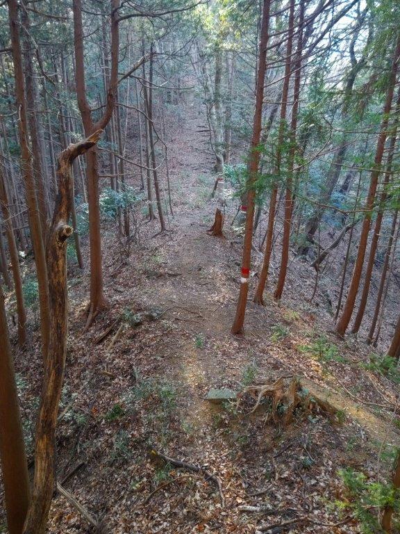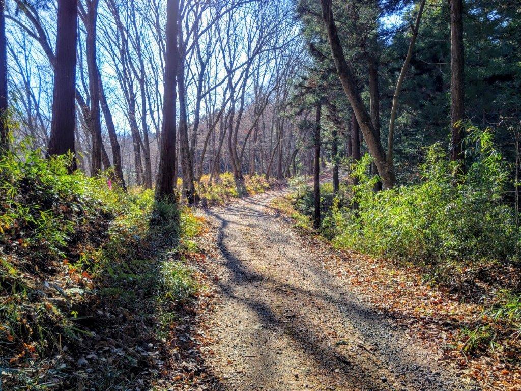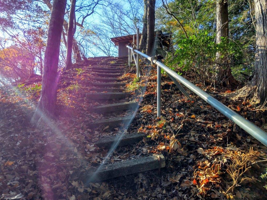 I followed a level trail surrounded by mixed forest, the most pleasant part of the hike so far, hiding the nearby city for a short while. I eventually reached a paved road at Yanami Pass (やなみ峠), the end of the Mt Tobio Hiking Trail. Here, I turned right onto the road as it descended gently through the forest. Just past a small creek at a bend, I spotted a series of log steps heading steeply up the mountain side. Clouds had covered the entire sky at an astonishing speed bringing a chill to what had been so far a pleasant winter day. I quickly made my way up the steps to warm my chilled body.