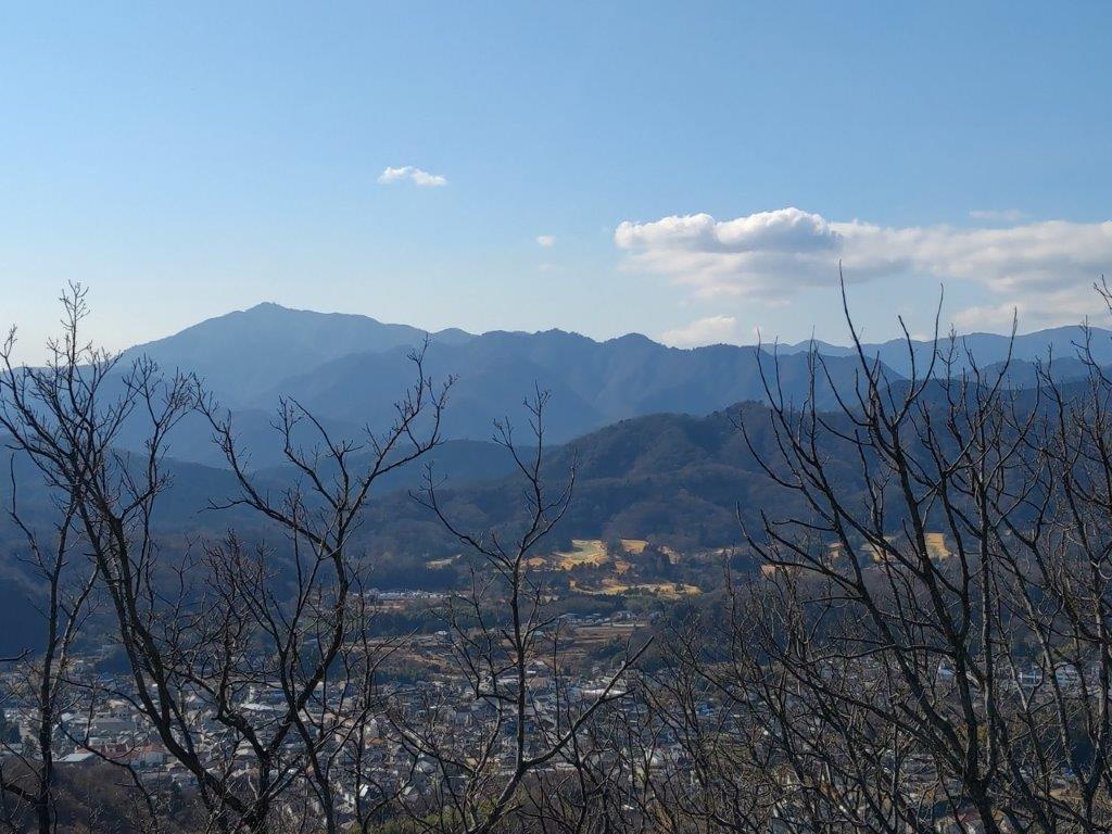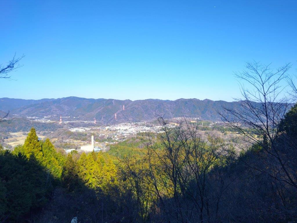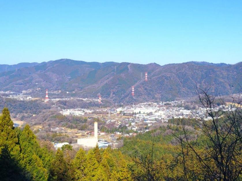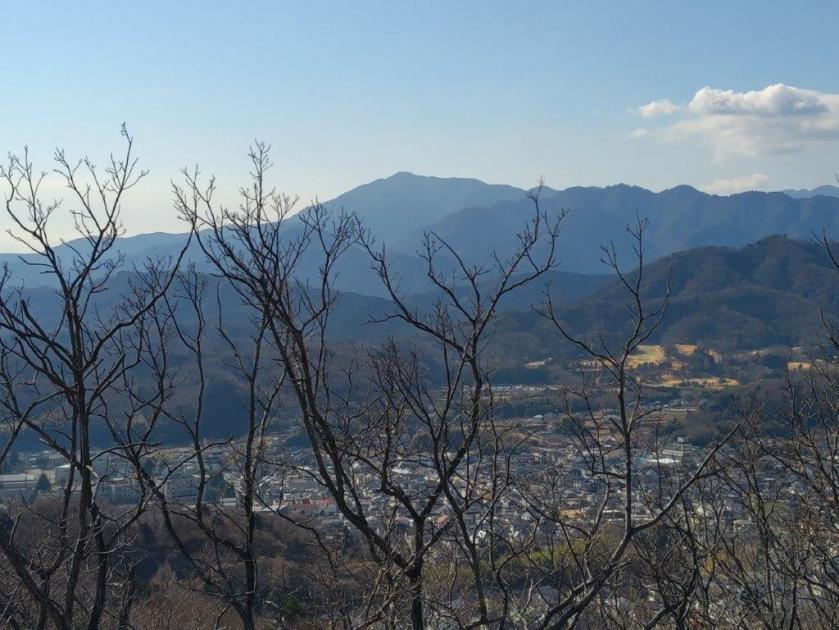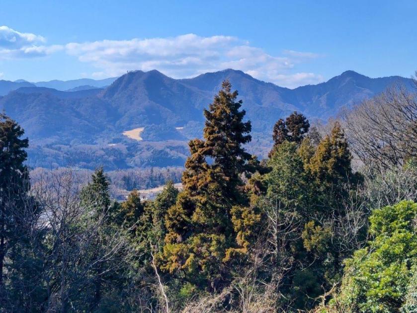 This was probably the best view of the day, and once satisfied, I headed down the stairs to continue my hike. The trail first went downhill, then became level near a rock mining area, before climbing steeply. Before I could break a sweat, I found myself at the top of Mt Tobio (鳶尾山 とびおさん tobio-san), known for its cherry blossoms trees, although in this season the branches were still bare. I had a view once again of the Kanto plain; northwards were the Okutama mountains, the distinctive shape of Mt Odake clearly visible in the far distance. Since it was just past 1pm, I sat on a sunny bench for lunch with a view. Once done, I set off again.