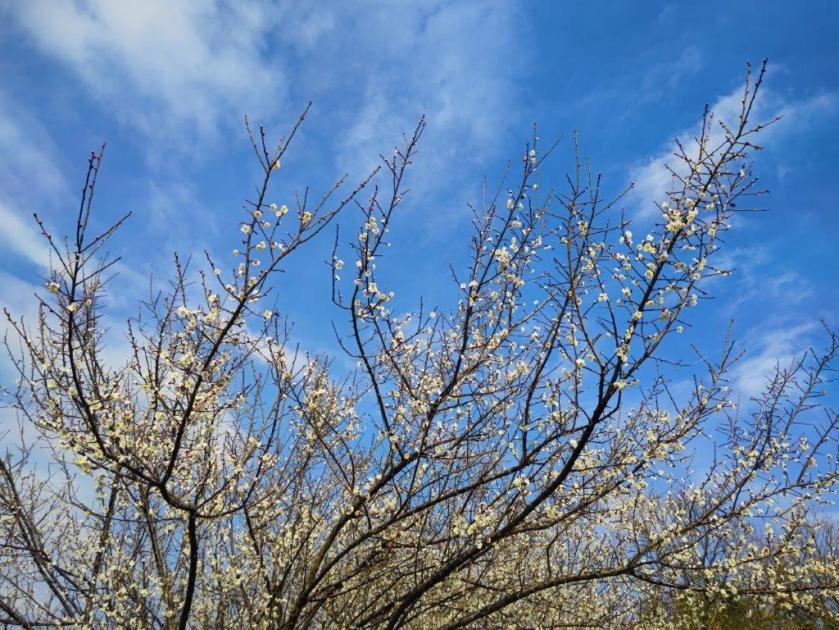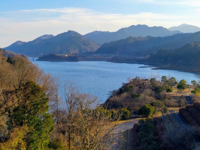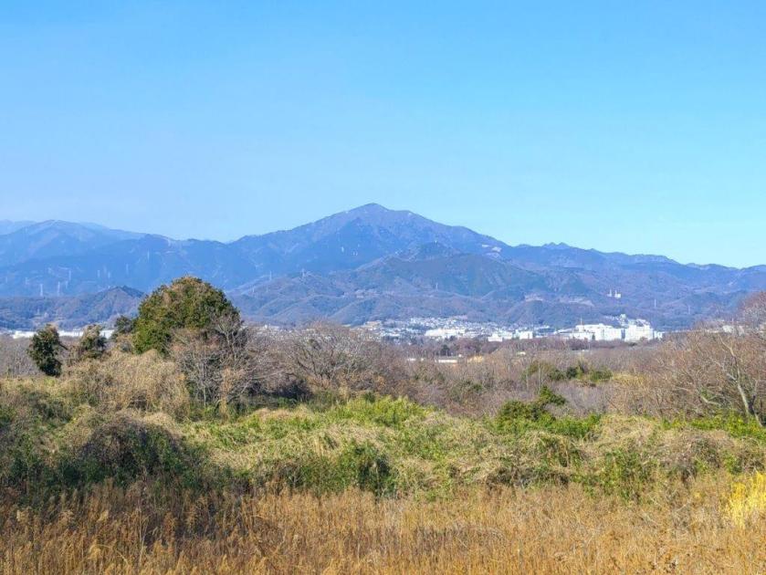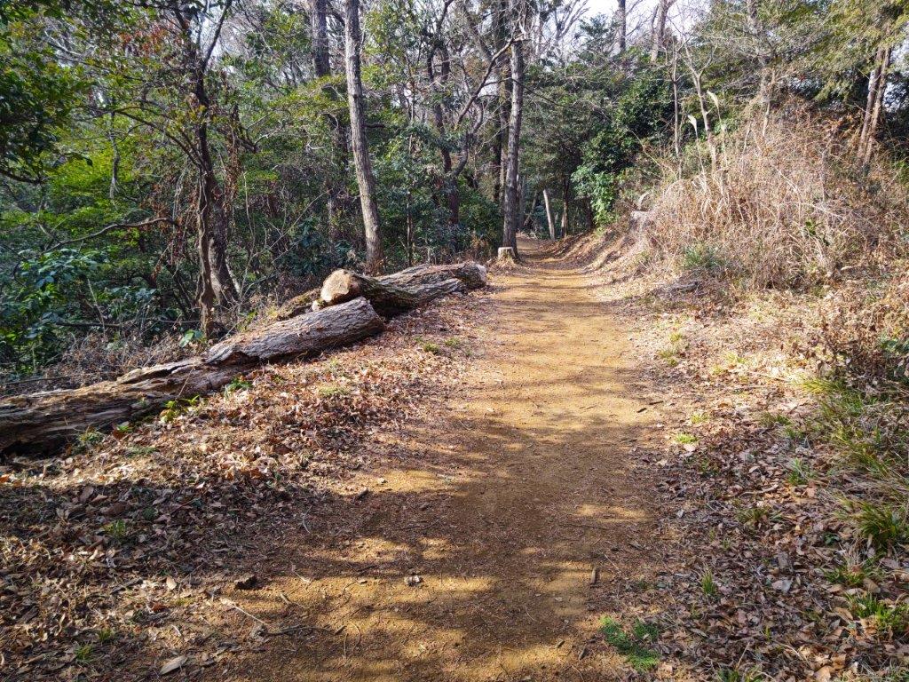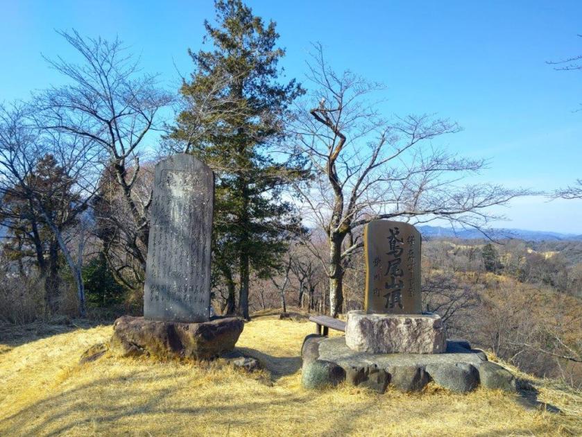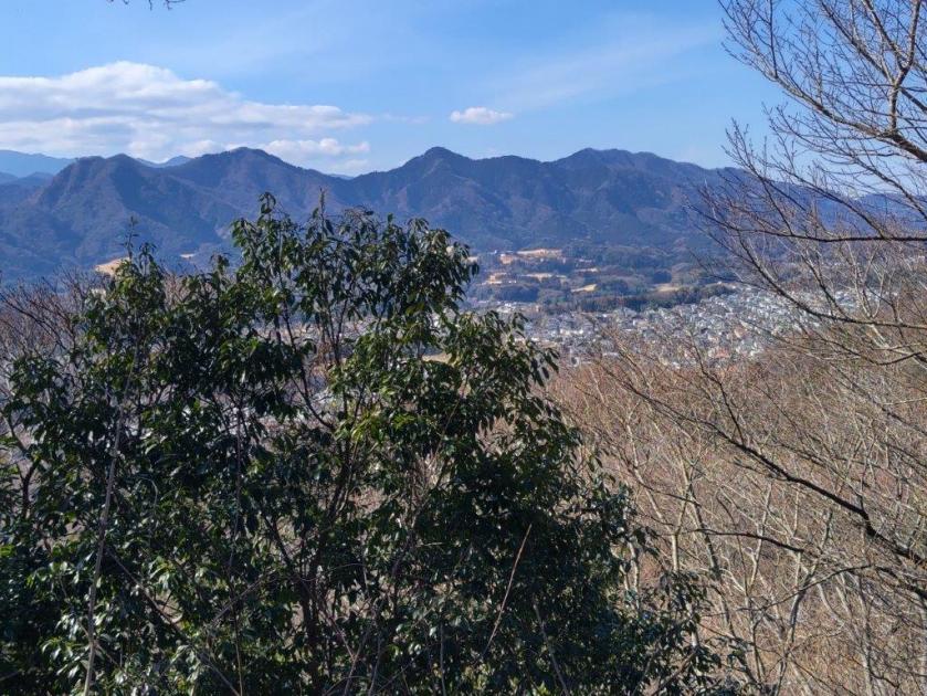 This was probably the best view of the day, and once satisfied, I headed down the stairs to continue my hike. The trail first went downhill, then became level near a rock mining area, before climbing steeply. Before I could break a sweat, I found myself at the top of Mt Tobio (鳶尾山 とびおさん tobio-san), known for its cherry blossoms trees, although in this season the branches were still bare. I had a view once again of the Kanto plain; northwards were the Okutama mountains, the distinctive shape of Mt Odake clearly visible in the far distance. Since it was just past 1pm, I sat on a sunny bench for lunch with a view. Once done, I set off again.