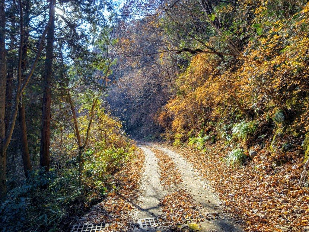 I followed a level trail surrounded by mixed forest, the most pleasant part of the hike so far, hiding the nearby city for a short while. I eventually reached a paved road at Yanami Pass (やなみ峠), the end of the Mt Tobio Hiking Trail. Here, I turned right onto the road as it descended gently through the forest. Just past a small creek at a bend, I spotted a series of log steps heading steeply up the mountain side. Clouds had covered the entire sky at an astonishing speed bringing a chill to what had been so far a pleasant winter day. I quickly made my way up the steps to warm my chilled body.