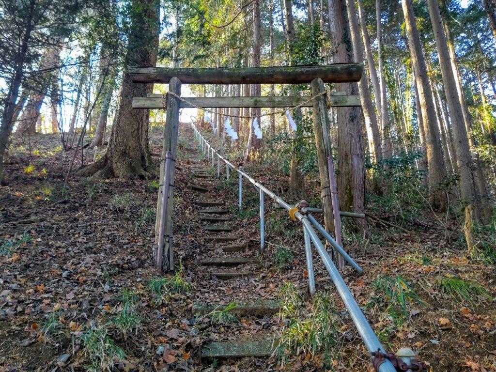 I sped south under blue skies comfortably seated on the “Romance Car”, arriving at Atsugi a little before 1030. There, I boarded a half-full bus for the half-hour ride to Tobio Danchi. After a short walk through a residential neighbourhood, I reached the start of the hiking trail at 1130 at the top of a long staircase. After following a level trail for a short while, I arrived at Sannosha (山王社), a Shinto Shrine at the edge of the forest with a view of the Kanto Plain on the eastern side.