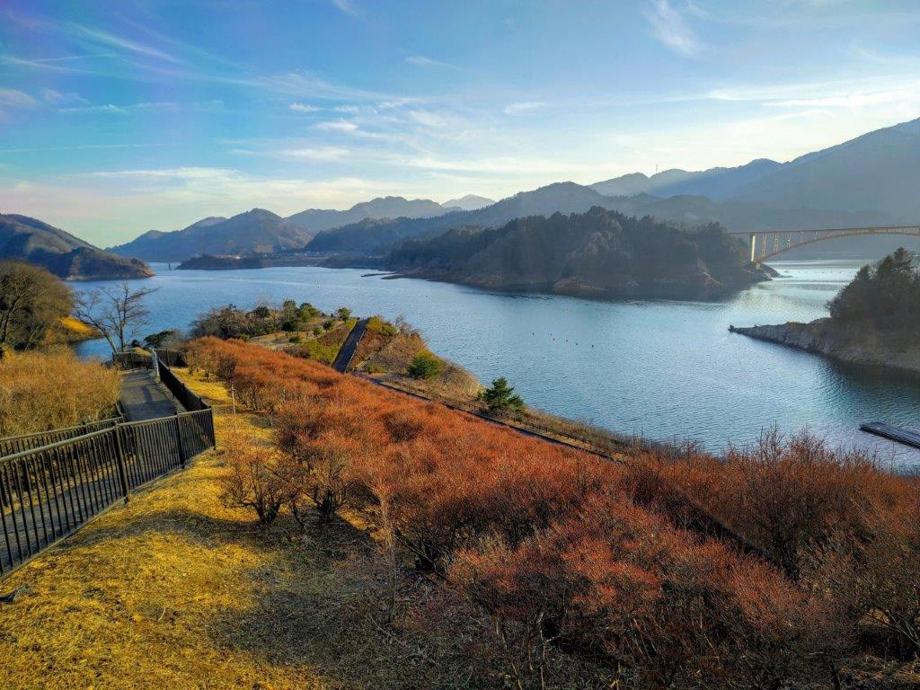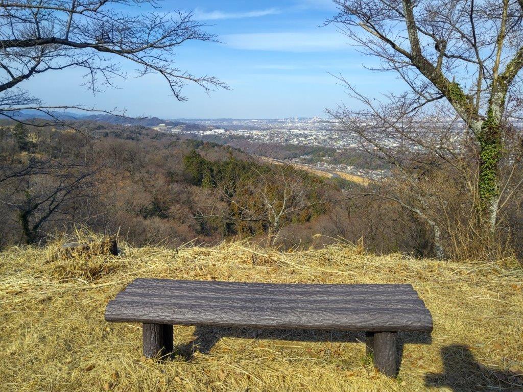 This was probably the best view of the day, and once satisfied, I headed down the stairs to continue my hike. The trail first went downhill, then became level near a rock mining area, before climbing steeply. Before I could break a sweat, I found myself at the top of Mt Tobio (鳶尾山 とびおさん tobio-san), known for its cherry blossoms trees, although in this season the branches were still bare. I had a view once again of the Kanto plain; northwards were the Okutama mountains, the distinctive shape of Mt Odake clearly visible in the far distance. Since it was just past 1pm, I sat on a sunny bench for lunch with a view. Once done, I set off again.