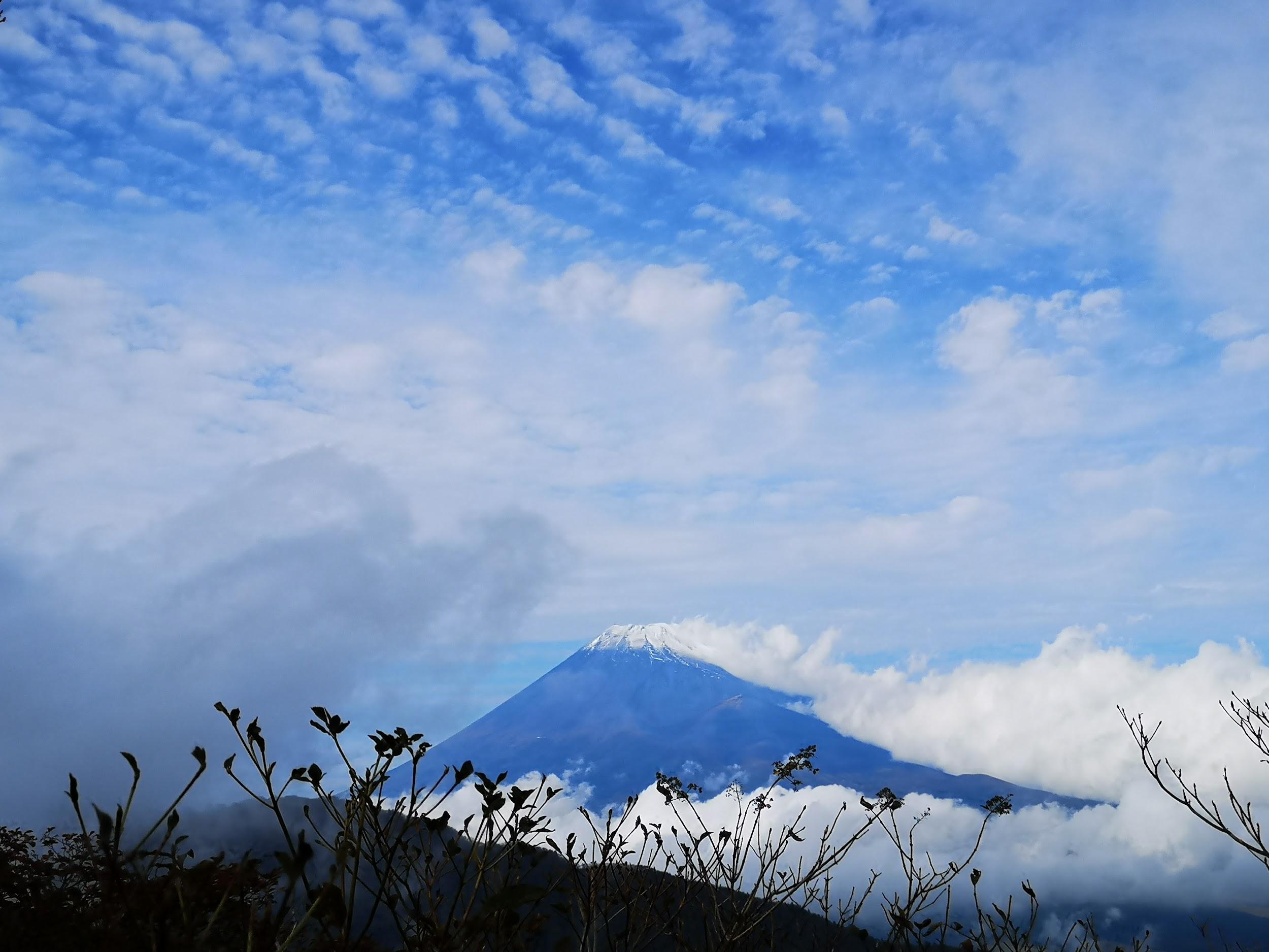 Even with this shorter route, I would barely make it to the bus stop on time. Very soon I reached an amazing viewpoint. Behind me, the top of Mt Fuji was visible from behind the ridge I had just climbed up, with a beautiful blue sky in the background. In front, the Hakone mountain range rose up from the valley in between. I had never seen Hakone from this angle – I was so fascinated that I stepped into some brambles, and I had to spend a few minutes putting bandaids on all the scratches (the weather was warm enough for shorts).