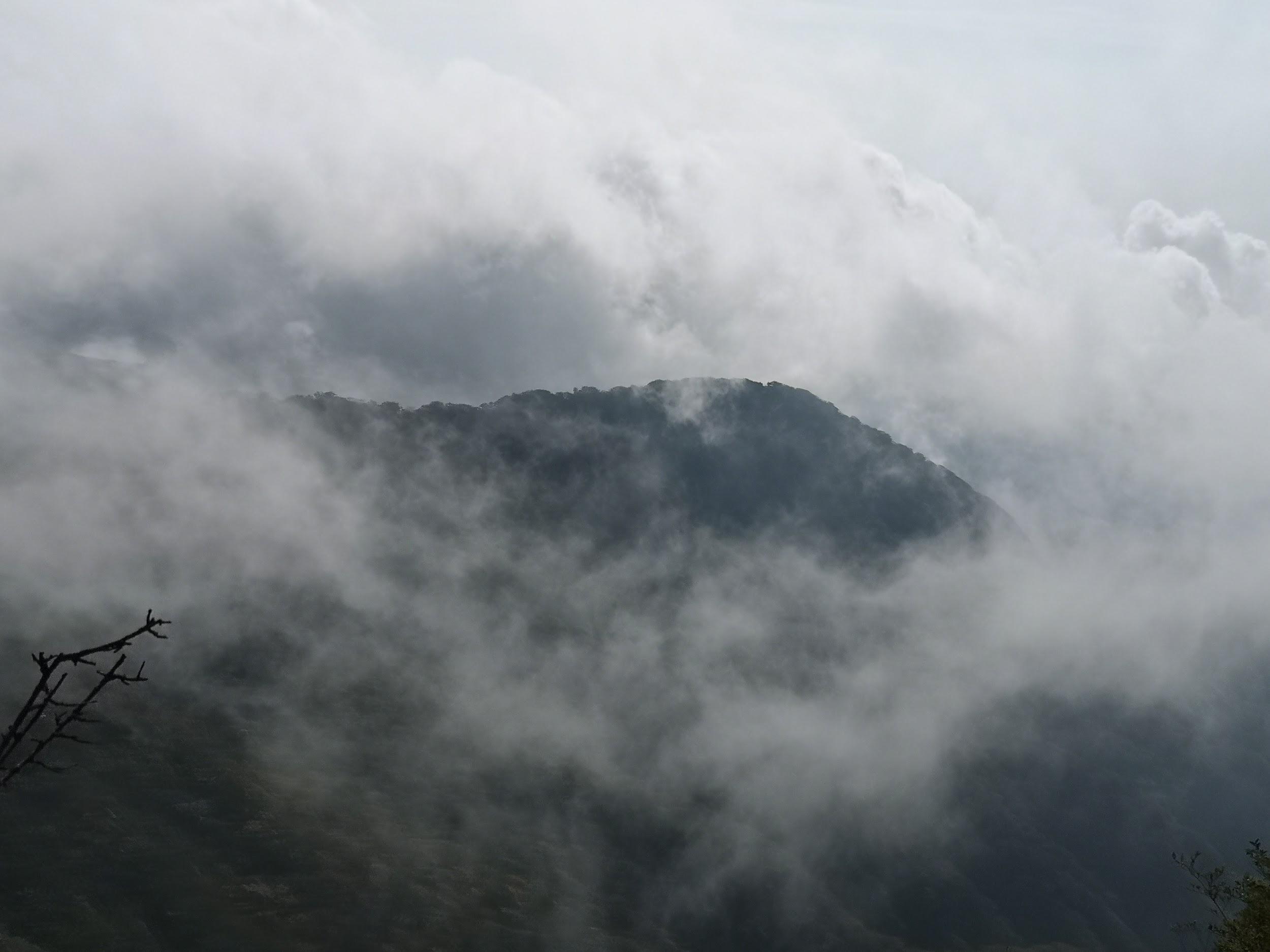 I arrived at the top of Mt Ihai 位牌 (meaning “mortuary tablet” although there were none at the top) at quarter to one, and very behind schedule. There were 2 other people at the top, about to head down. They kindly offered me some tasty “age-senbei” or fried rice crackers, which I enjoyed on the train ride back. From the top, looking Westwards, I could see Mt Fuji and Mt Gozen – according to the sign, the connecting ridge is quite dangerous. The weather was much better now – blue skies with swirls of mist floating by. Southwards, I could make out an impressive valley, but not much else since there were still a lot of clouds in that direction. Originally, I had been planning to hike towards Mt Ashitaka, the peak that gives the whole mountain its name, but I realised that there was no way I could catch the last bus back – at 3h35 – if I took this longer way. If I missed my bus, I faced another two hours of walking to Mishima station on paved roads. So this time, I took the shorter route down.