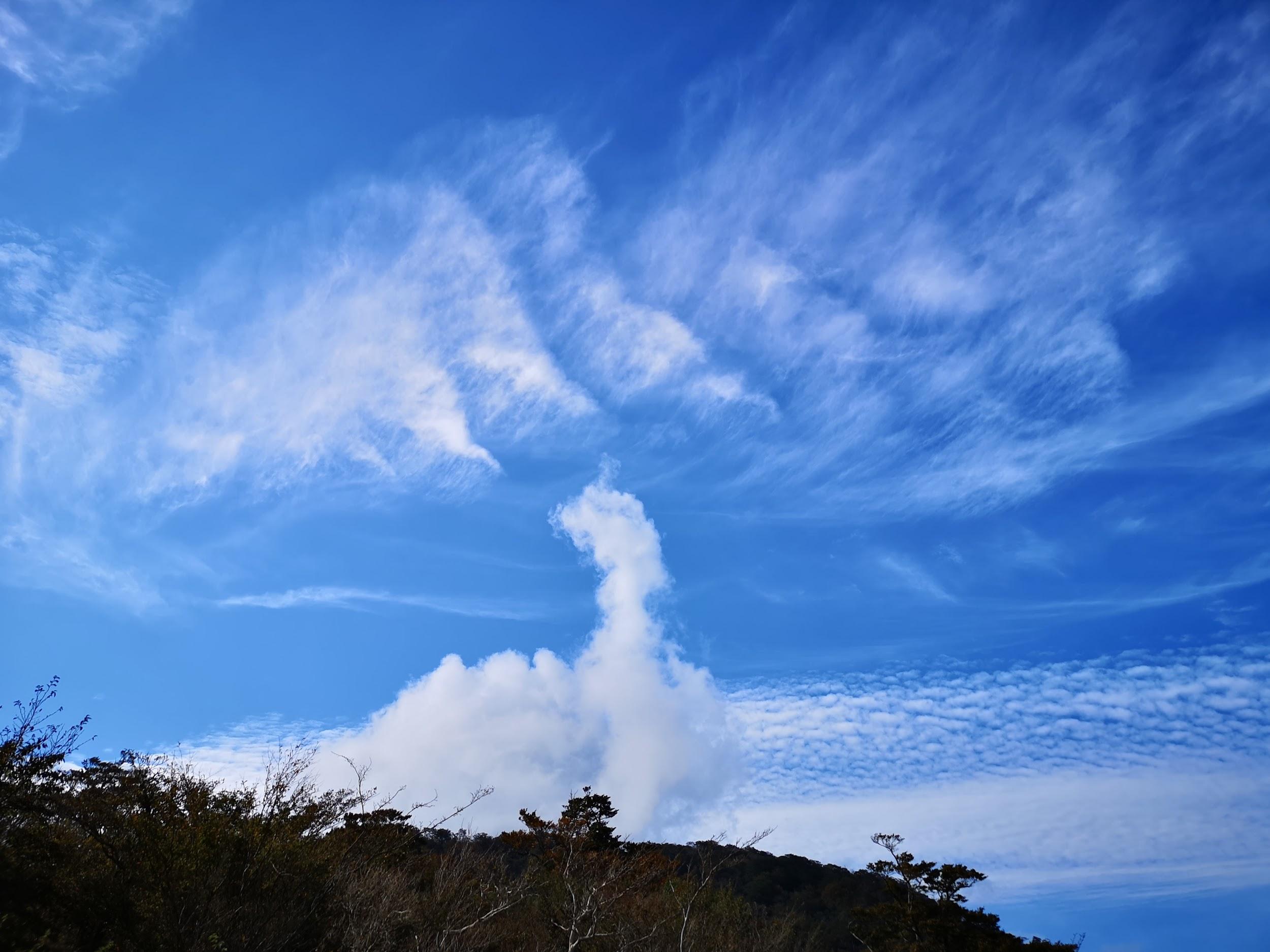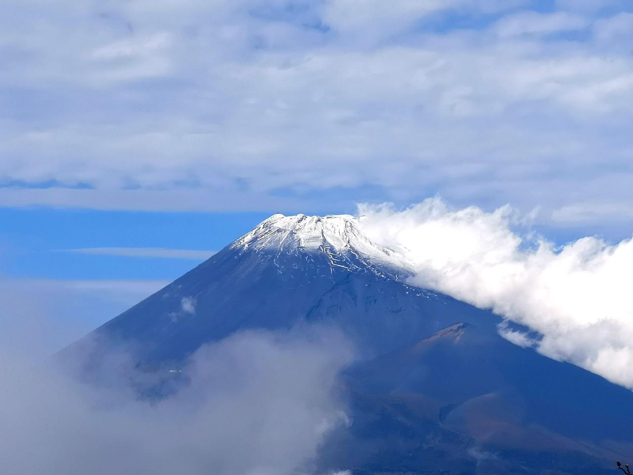 The panoramic view was stunning, one of the best I had seen in a while; I was glad I had woken up early today to travel so far. The high-altitude clouds that had appeared one hour ago were getting blown away by high-altitude winds, creating fantastic patterns in the sky above Fuji. On the south side was Mt Mikuni, covered in green forest; looking west, I could see Mt Fuji and Yamanaka Lake with the white peaks of the South Alps visible in the distance; to the north was Mt Ishiwari, with behind it, Mt Mitsutoge and Mt Mishotai, left and right respectively. It was too early for a lunch break, only 11am, so after enjoying the view, I set off again.