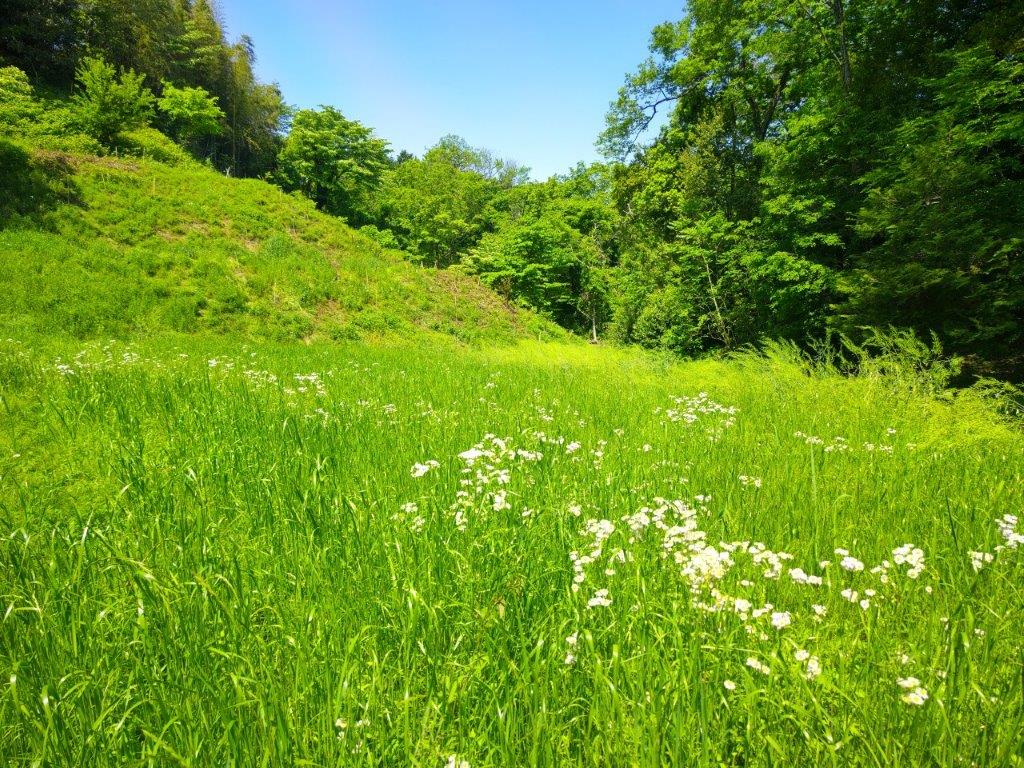 I was lucky to get the last free table under a large tree, although many benches were empty. It was nearly one o’clock so I decided to have an early lunch. I set off again a little past 1pm, now following the Oku-musashi Long Trail (奥武蔵ロングトレイル). After passing through a bamboo grove, I followed a winding path hugging the mountain side. Beyond a stream, the path started to climb, then became level at a clearing for the power line passing over Yugate. Shortly after crossing a second stream on a bridge made of two wooden planks, I arrived at Tsuchiyama Pass (土山峠), intersecting with my Fukuzawa hike.