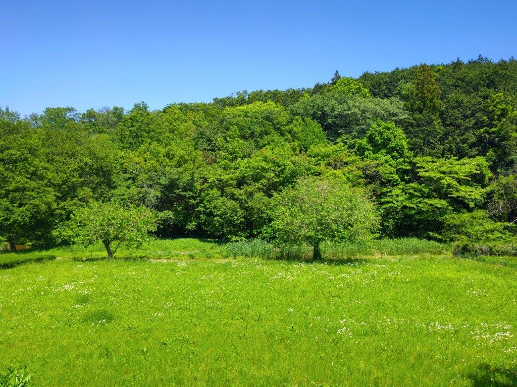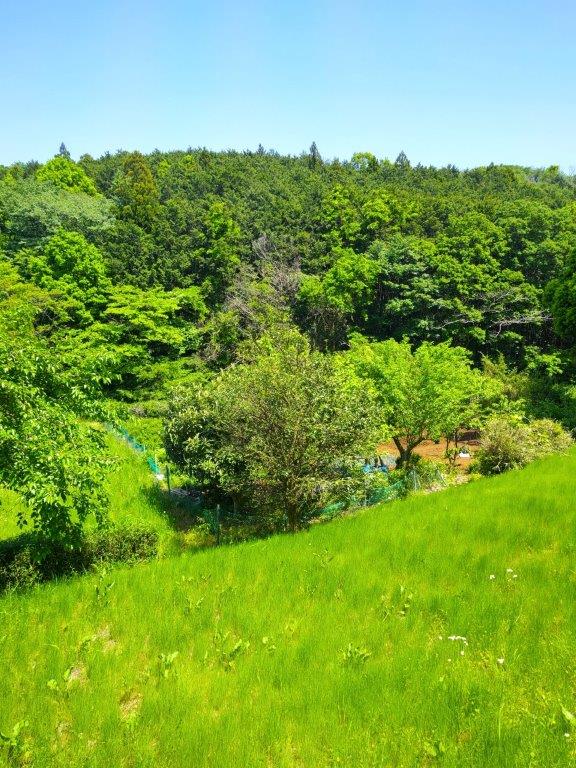 I was glad to get a view early on in the hike, although I had been past this spot before. Looking left, I could see the Hanno Alps directly opposite; further in the distance, I could just make out Mt Izugatake and Mt Buko, half-hidden by low clouds. I soon moved on, and after an up and down, arrived at the top of Mt Hashimoto (橋本山 321m) where a similar view awaited me on the west side. I quickly moved on, and after a short descent, I followed a wide track that led me to the fields and gardens of Yugate Village (ユガテ 290m); looking up, I could see a second set of power lines stretching across the sky.