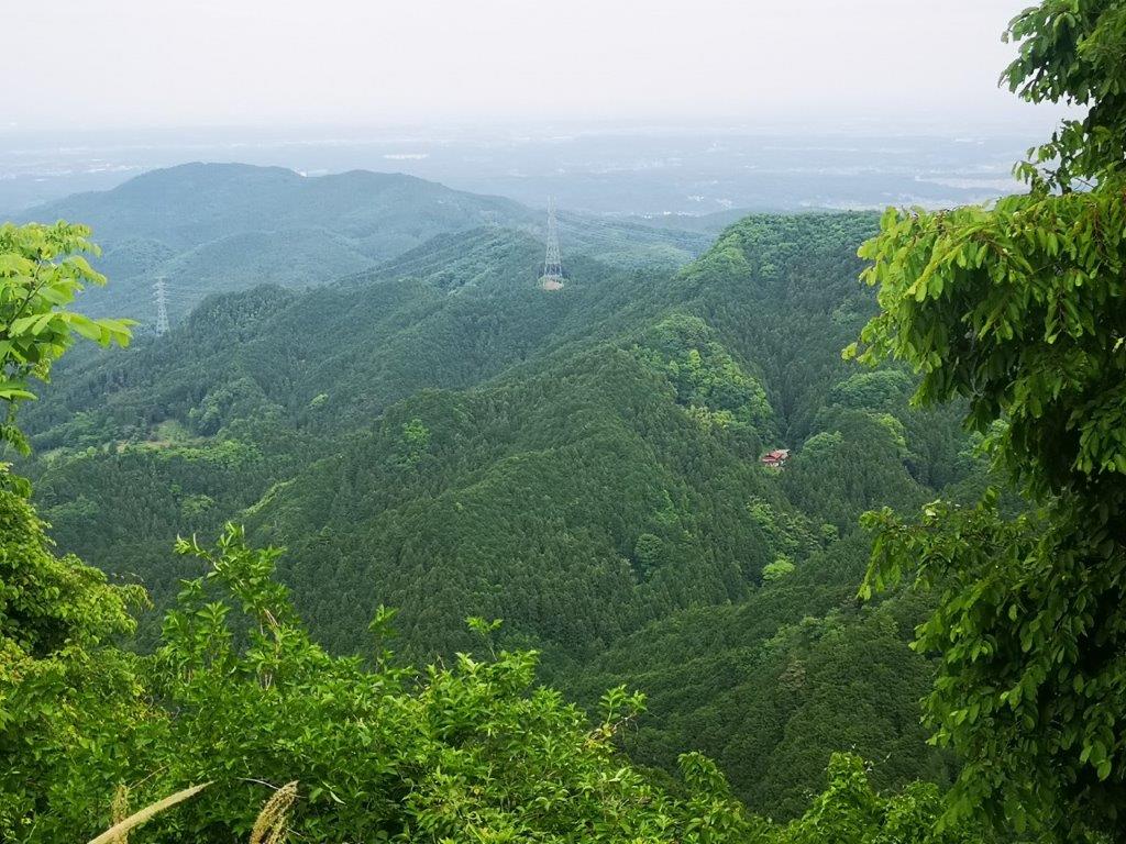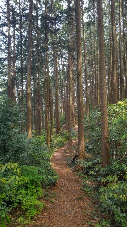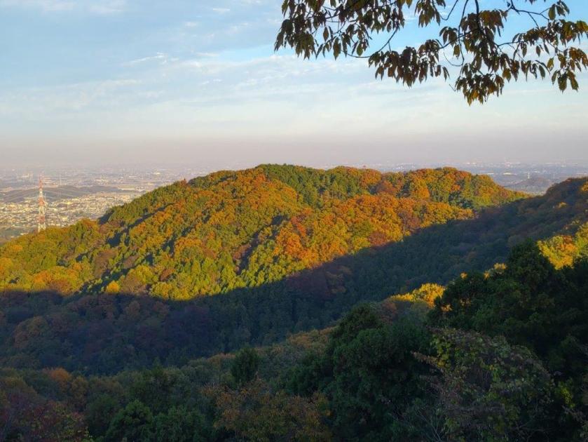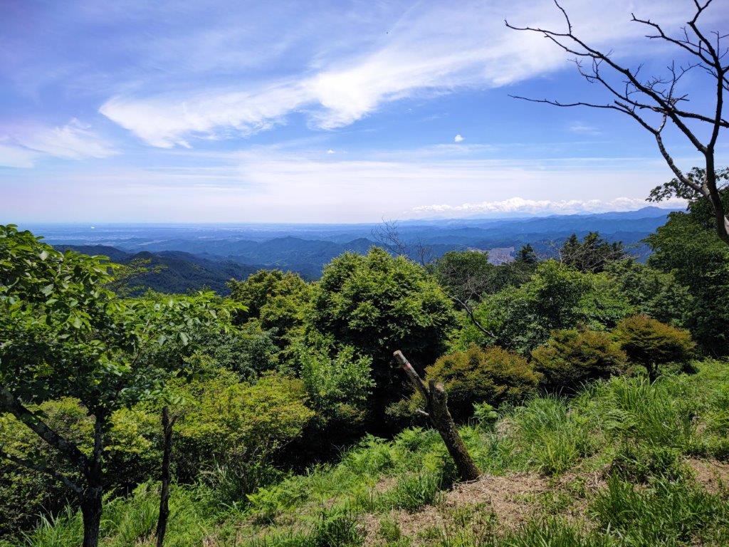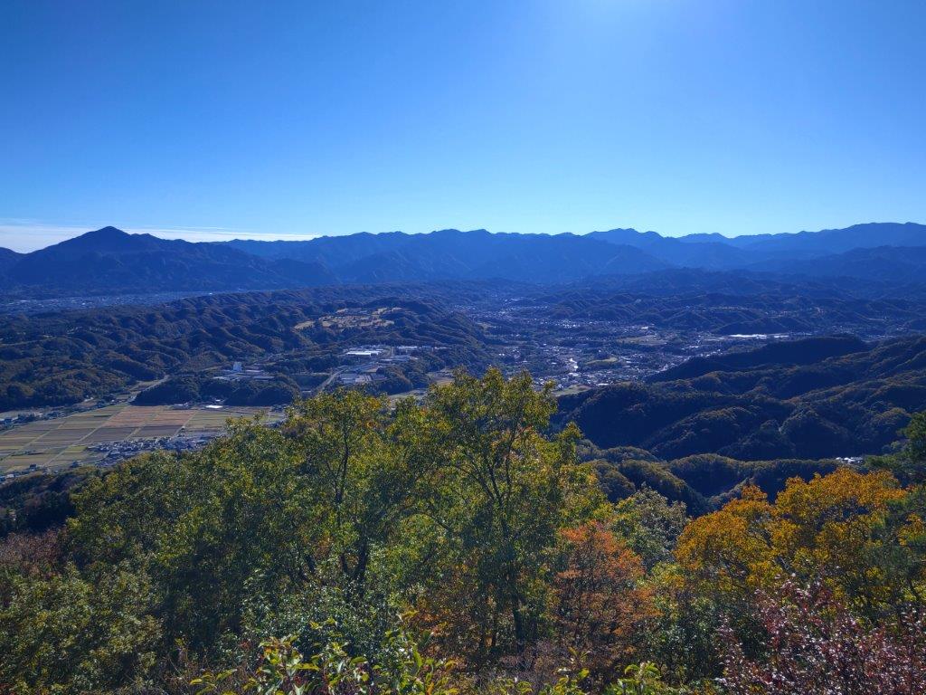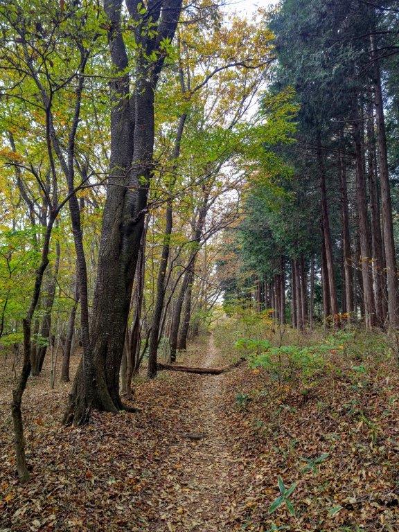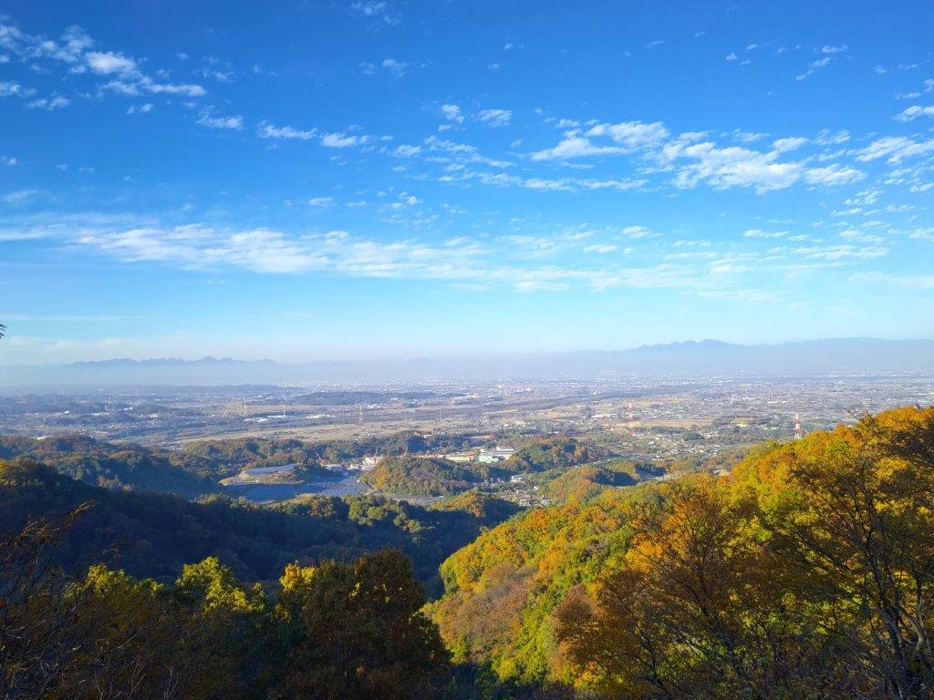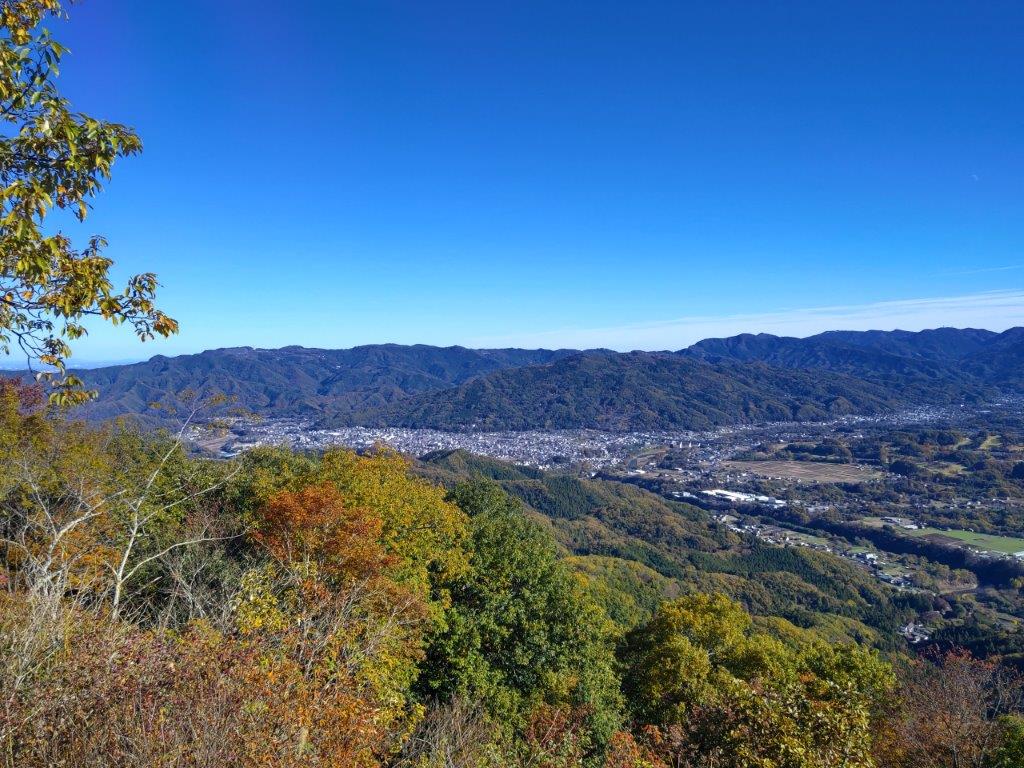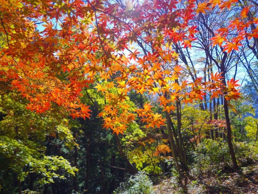 I found myself walking under coloured leaves, as soon as the last house was behind me. Shortly after, bamboo surrounded me on both sides, the tall stalks creating the effect on a tunnel. The path suddenly went straight up the mountain side, demanding a burst of effort to reach the ridgeline. On the right was an open space, turned into terraced fields; it was also the first viewpoint of the hike. On the east side, I could see the Kanto plain, its finer details lost in the haze. After some more climbing through mixed forest, I reached bench in the middle of the trees. Following the ridge a little further, I arrived at the day’s second viewpoint.