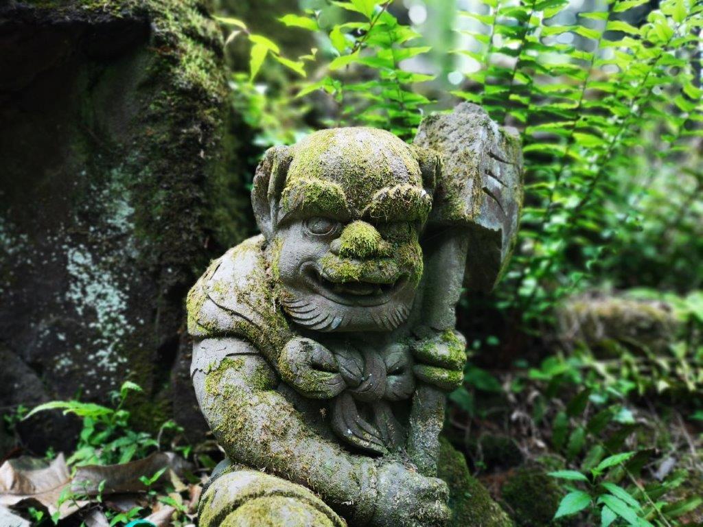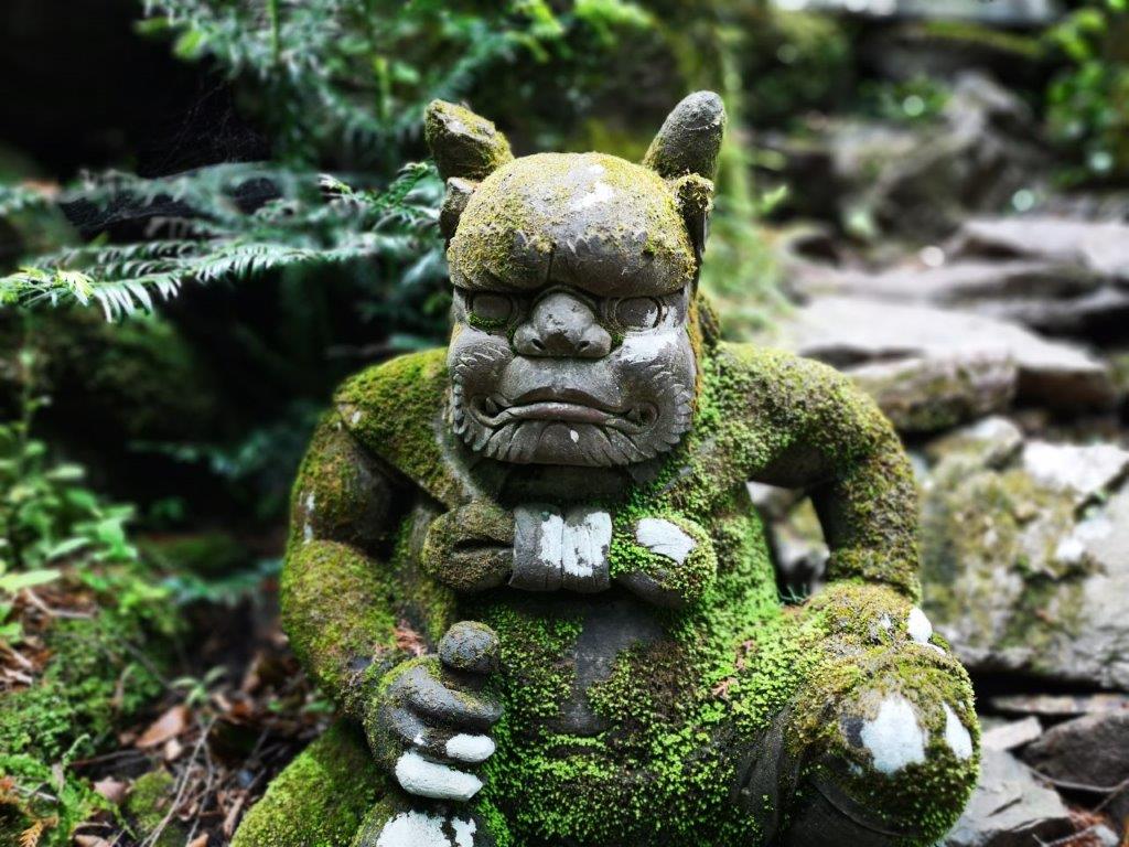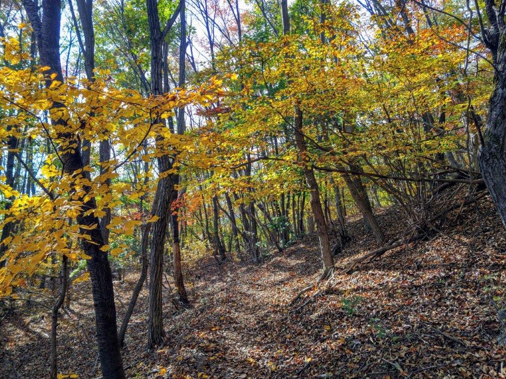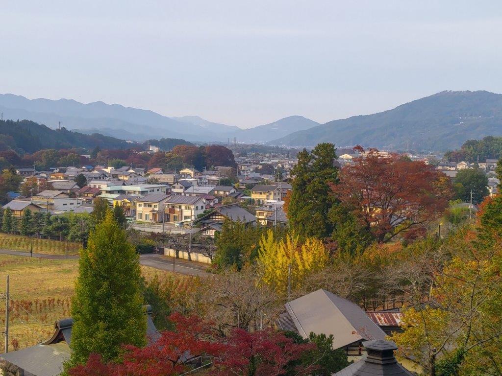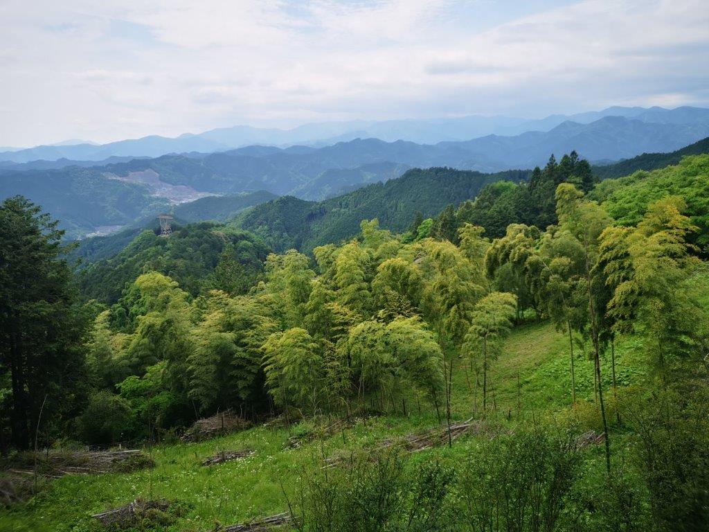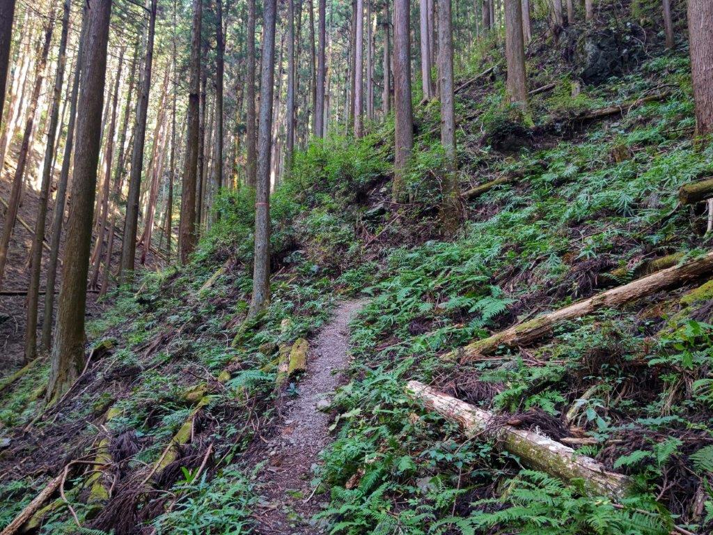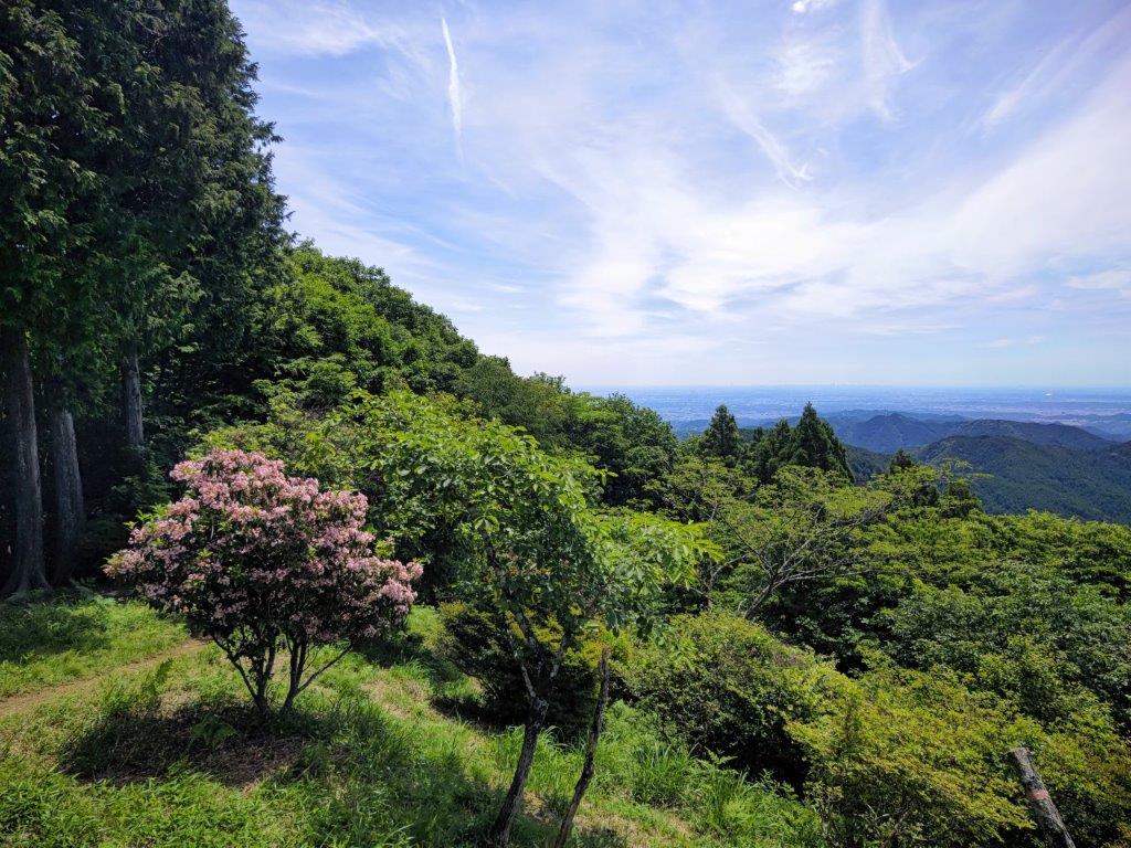 I found myself walking under coloured leaves, as soon as the last house was behind me. Shortly after, bamboo surrounded me on both sides, the tall stalks creating the effect on a tunnel. The path suddenly went straight up the mountain side, demanding a burst of effort to reach the ridgeline. On the right was an open space, turned into terraced fields; it was also the first viewpoint of the hike. On the east side, I could see the Kanto plain, its finer details lost in the haze. After some more climbing through mixed forest, I reached bench in the middle of the trees. Following the ridge a little further, I arrived at the day’s second viewpoint.