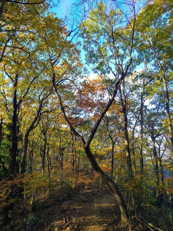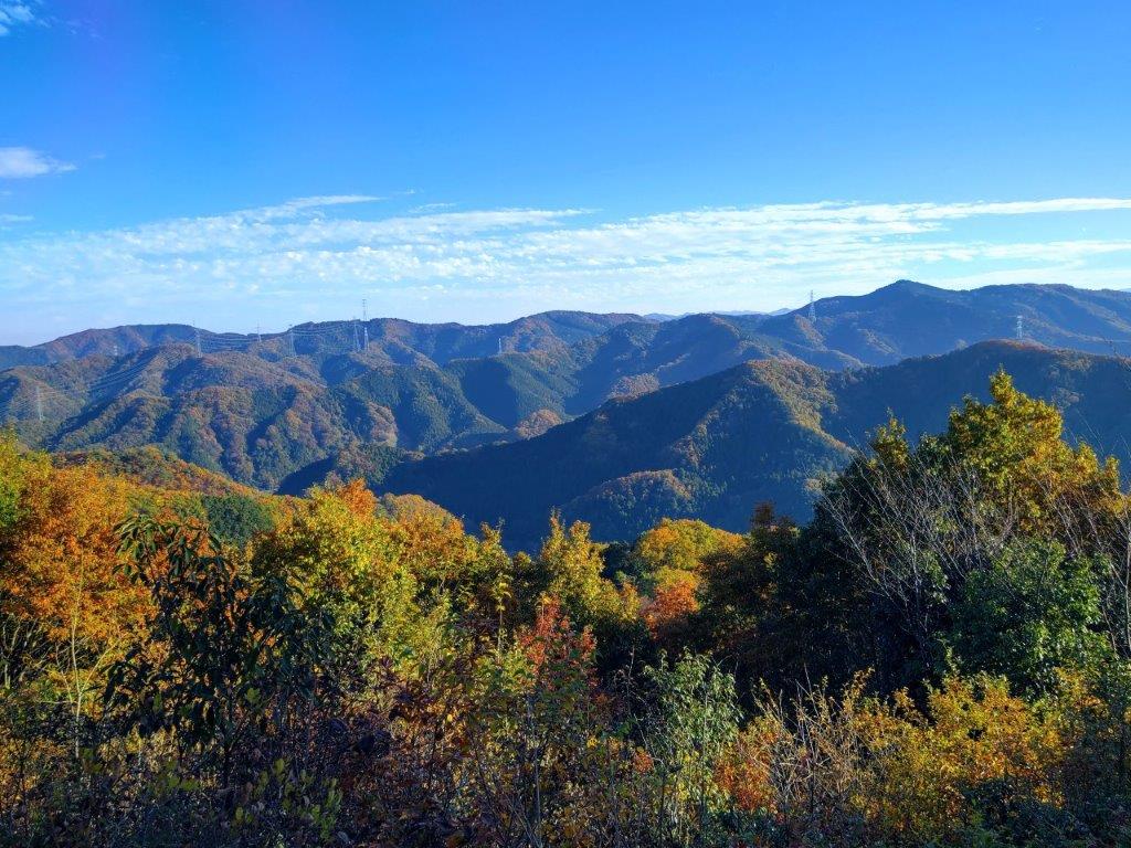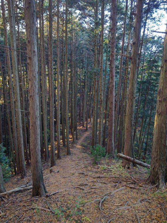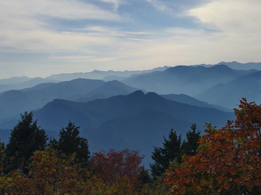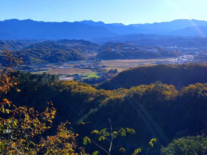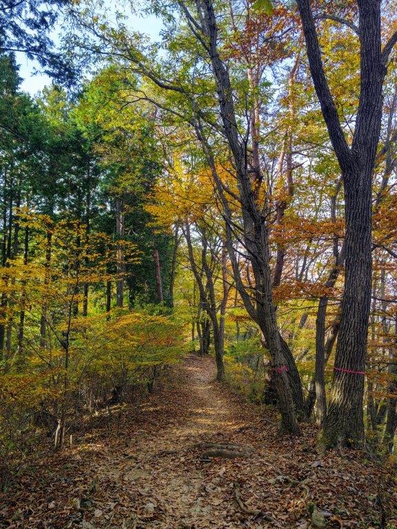 Looking north, I could see the peaks of the Mt Haruna volcano. After a short break, I set off again, passing a small shrine and its wooden Shinto gate (“torii“). The trail went down and up through the oaks, the overhead leaves golden in the afternoon sun. After a steep climb, I reached the third viewpoint, and second bench, of today’s hike just before 3pm. Looking north again, I could see both Mt Akagi and Mt Haruna. On the south side were the Nagatoro North Alps, with Mt Buko in the background. After another short break, I continued on my way.