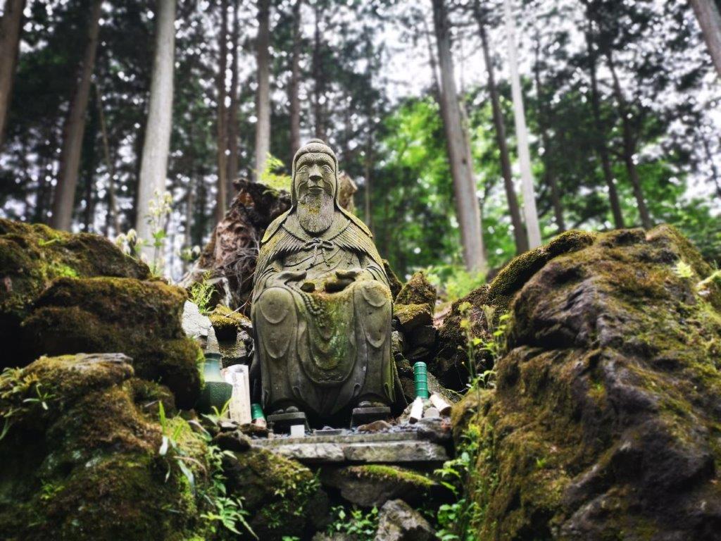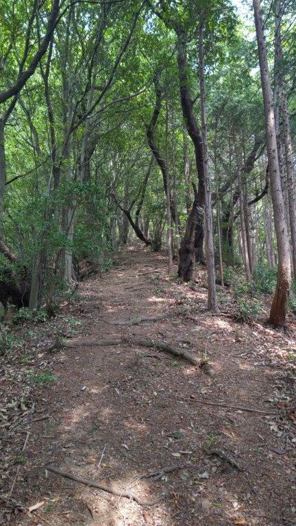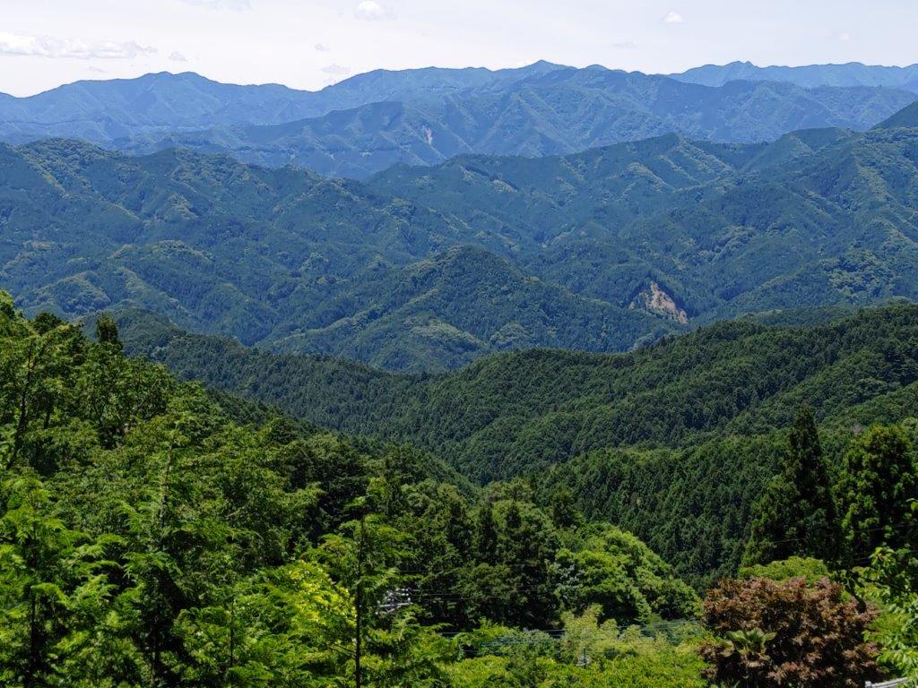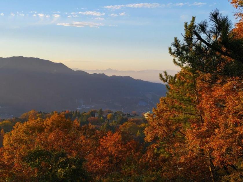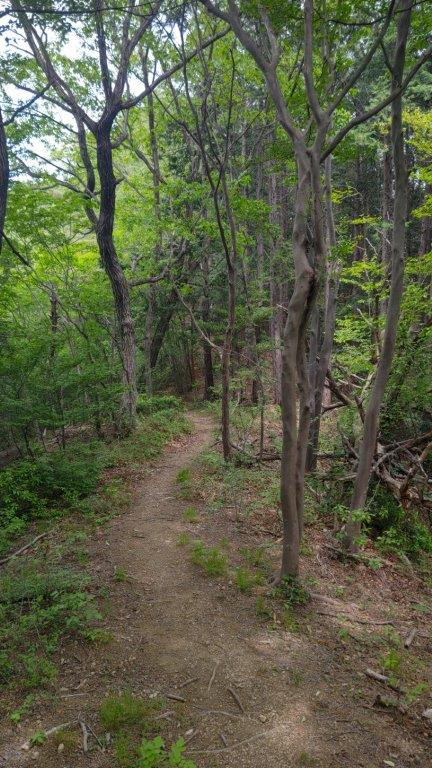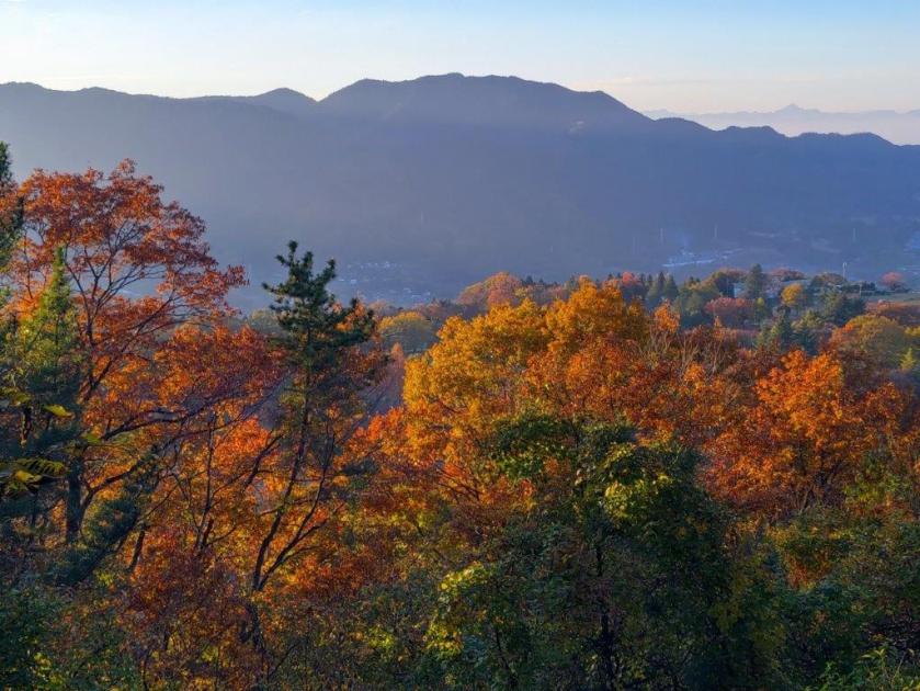 Looking north, I could see the peaks of the Mt Haruna volcano. After a short break, I set off again, passing a small shrine and its wooden Shinto gate (“torii“). The trail went down and up through the oaks, the overhead leaves golden in the afternoon sun. After a steep climb, I reached the third viewpoint, and second bench, of today’s hike just before 3pm. Looking north again, I could see both Mt Akagi and Mt Haruna. On the south side were the Nagatoro North Alps, with Mt Buko in the background. After another short break, I continued on my way.