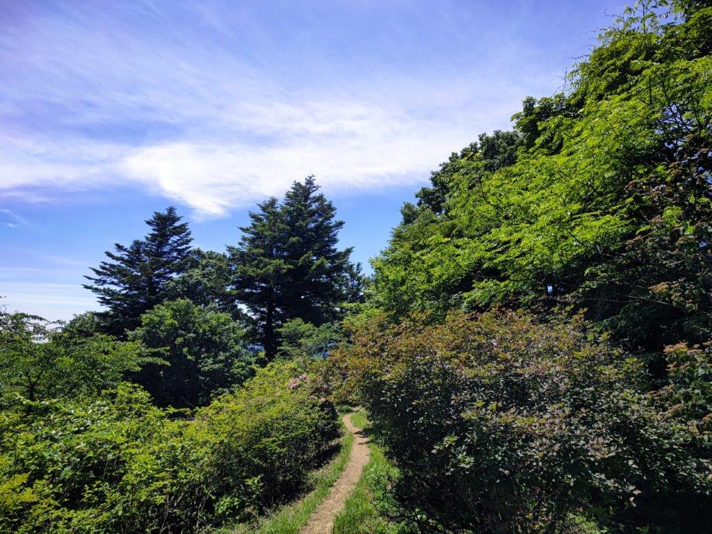 The trail continued up and down through lovely mixed forest. Half an hour later, I reached the fourth and final viewpoint. It was again on the east side, towards the Kanto plain, but this time I could observe most of the ridgeline I had just followed; in the very far distance, I could make out Mt Nantai and the snowy peak of Mt Nikko-Shirane. This spot also had a bench so I sat down to enjoy the last view of the day, the hills rust-coloured in the late afternoon light. I soon started to descend, anxious to get off the mountain before sunset.