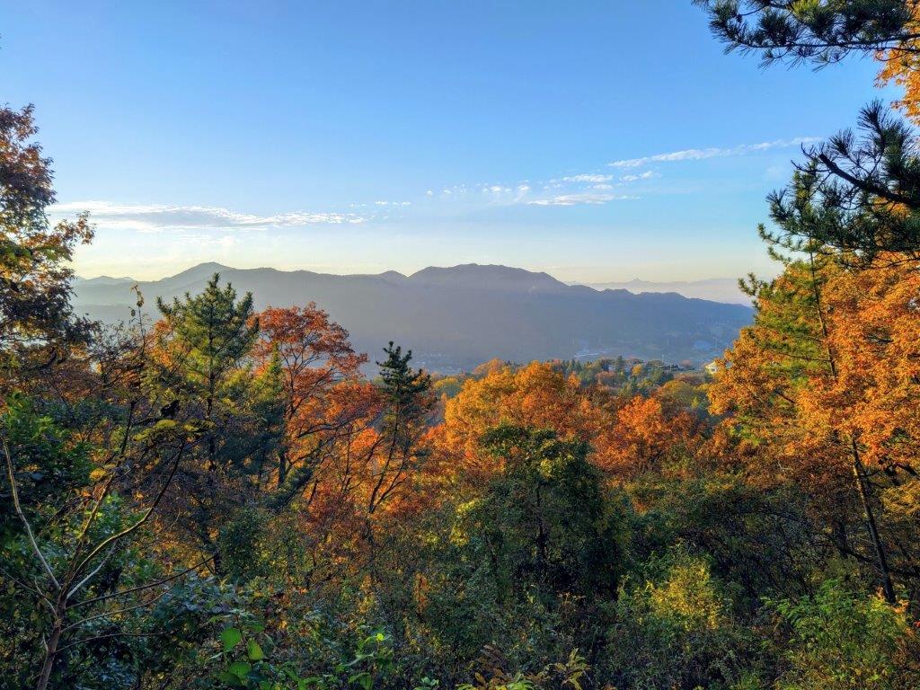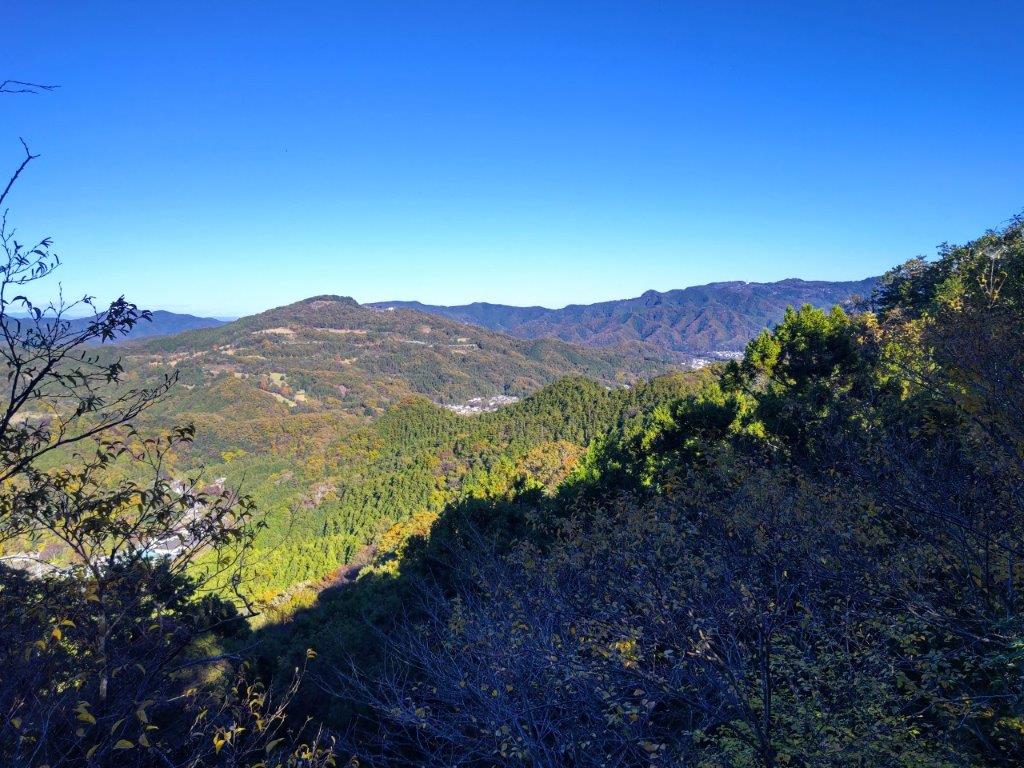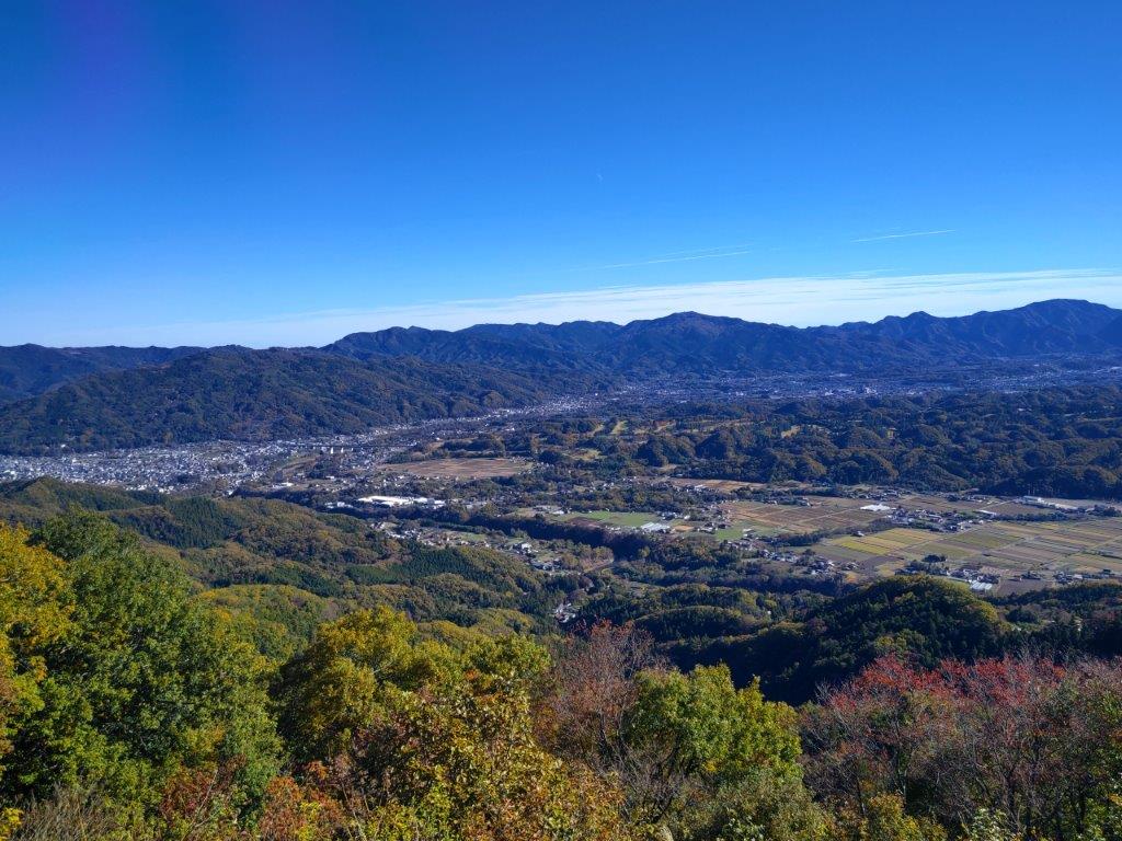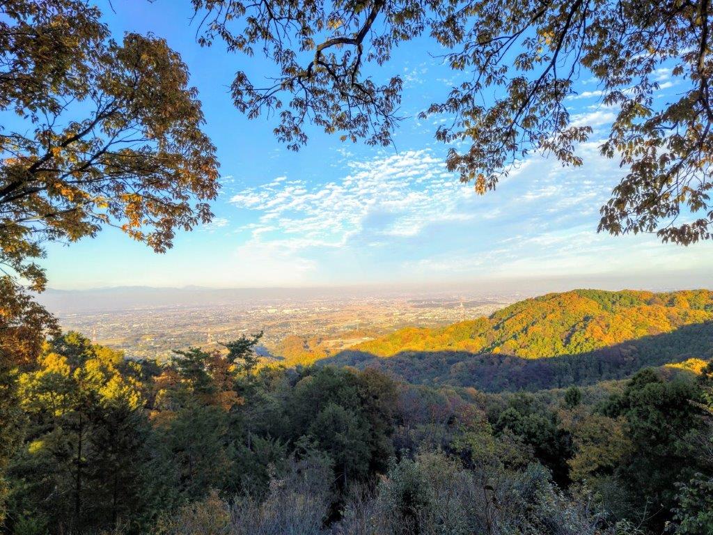 I found myself walking under coloured leaves, as soon as the last house was behind me. Shortly after, bamboo surrounded me on both sides, the tall stalks creating the effect on a tunnel. The path suddenly went straight up the mountain side, demanding a burst of effort to reach the ridgeline. On the right was an open space, turned into terraced fields; it was also the first viewpoint of the hike. On the east side, I could see the Kanto plain, its finer details lost in the haze. After some more climbing through mixed forest, I reached bench in the middle of the trees. Following the ridge a little further, I arrived at the day’s second viewpoint.