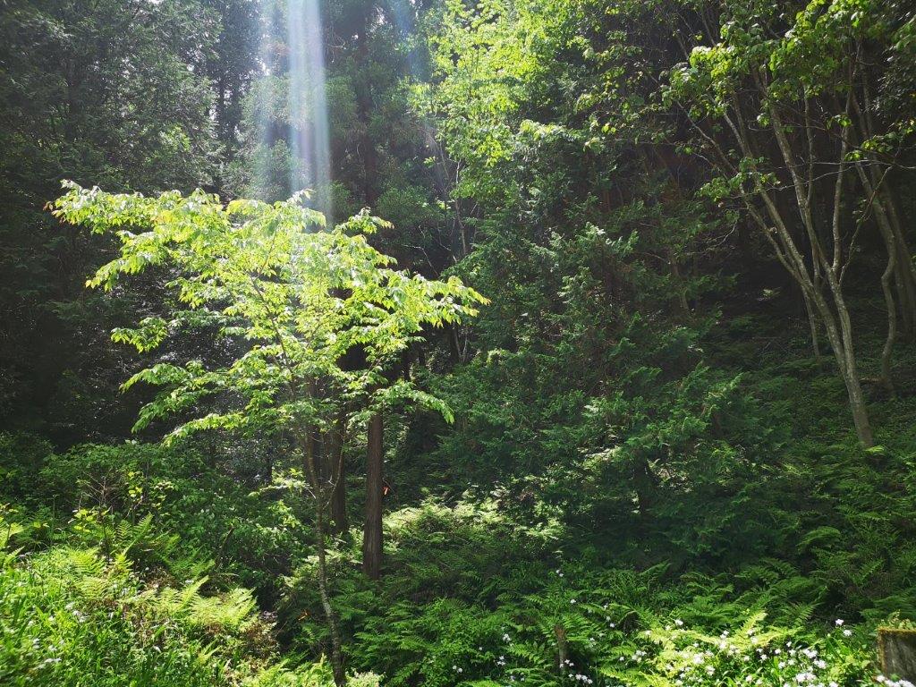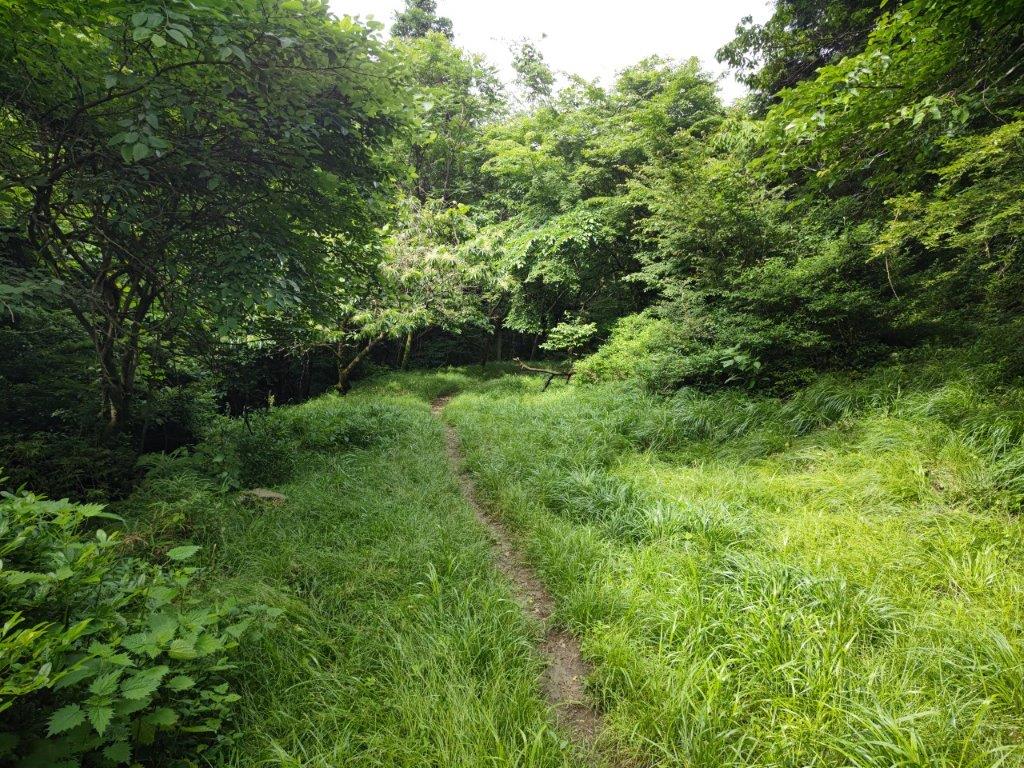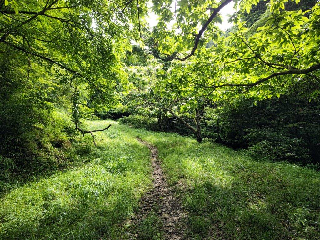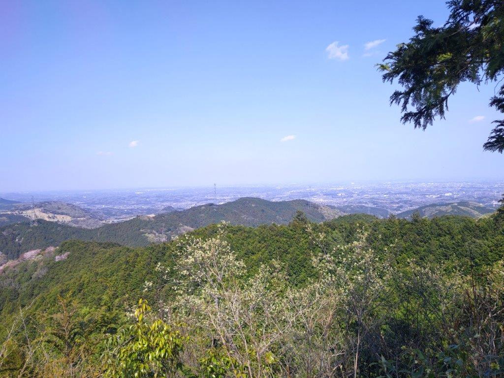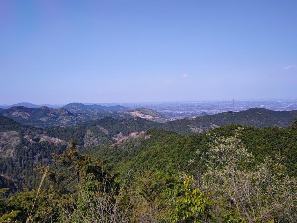 I found myself walking under coloured leaves, as soon as the last house was behind me. Shortly after, bamboo surrounded me on both sides, the tall stalks creating the effect on a tunnel. The path suddenly went straight up the mountain side, demanding a burst of effort to reach the ridgeline. On the right was an open space, turned into terraced fields; it was also the first viewpoint of the hike. On the east side, I could see the Kanto plain, its finer details lost in the haze. After some more climbing through mixed forest, I reached bench in the middle of the trees. Following the ridge a little further, I arrived at the day’s second viewpoint.