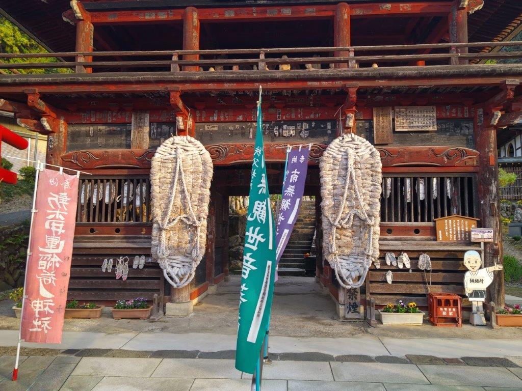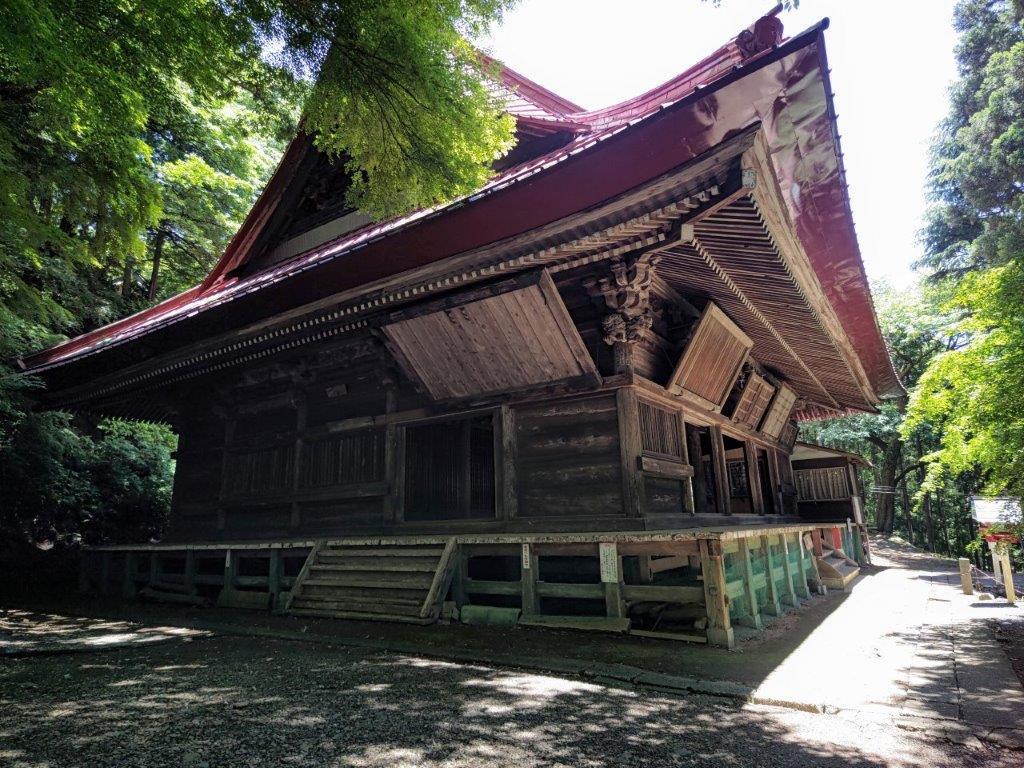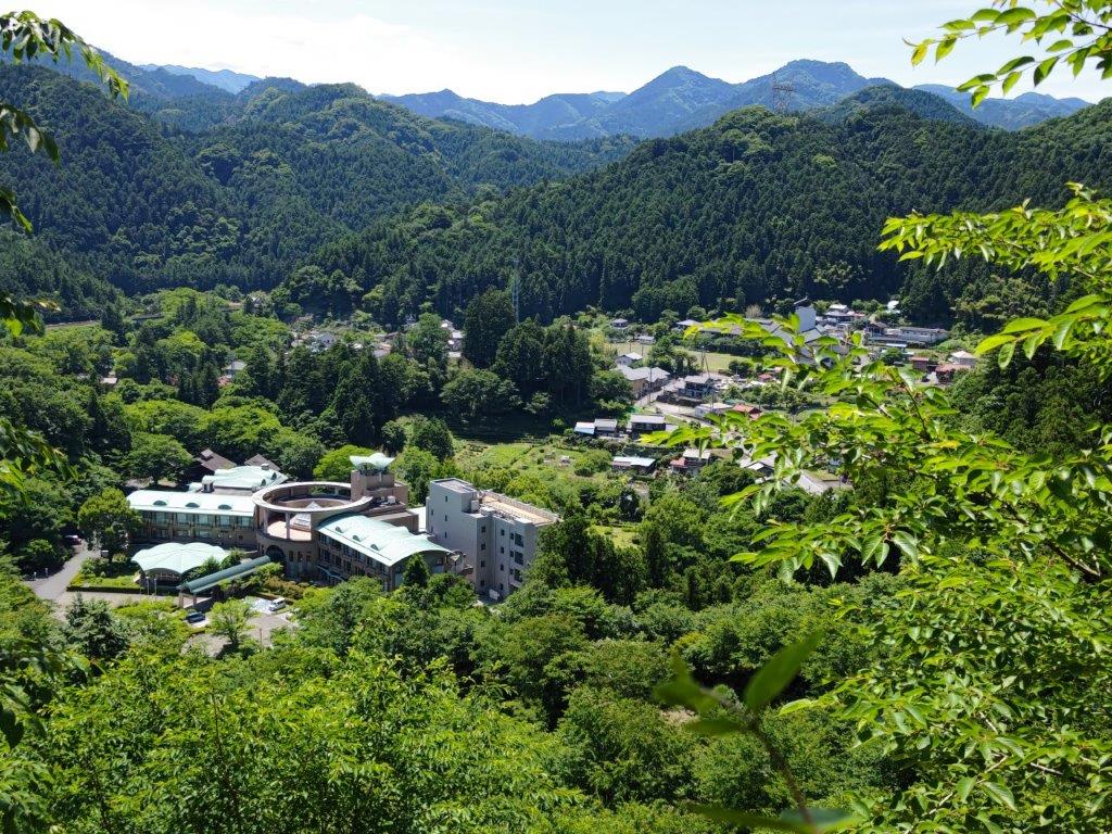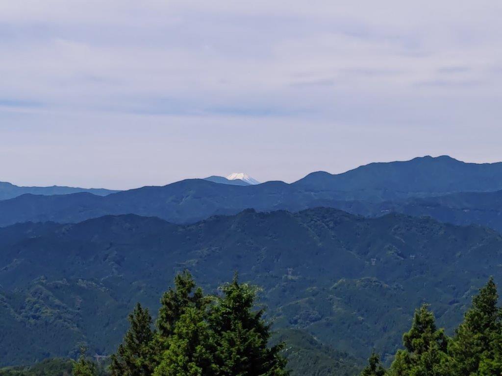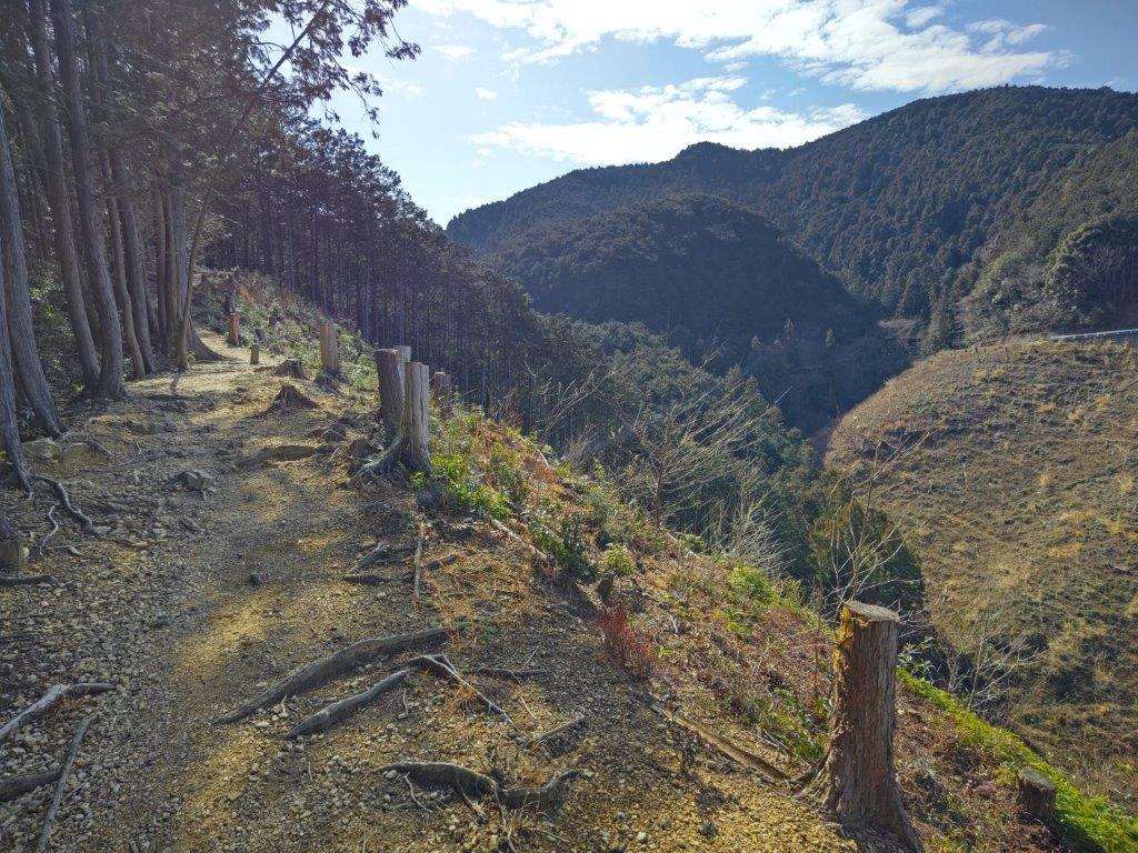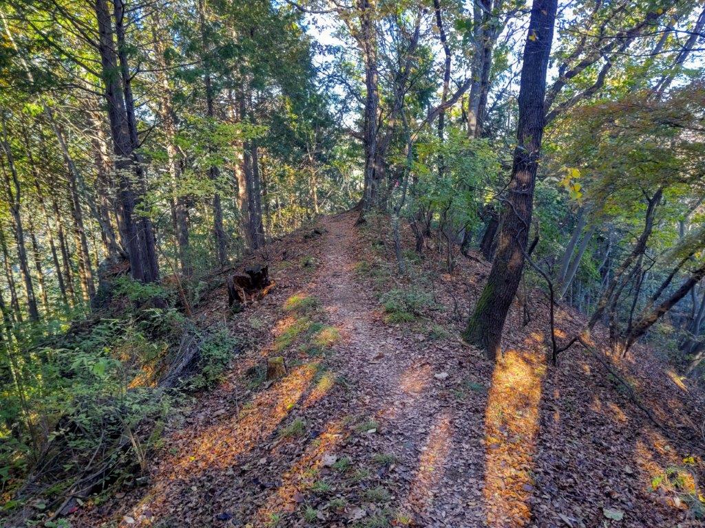 Looking north, I could see the peaks of the Mt Haruna volcano. After a short break, I set off again, passing a small shrine and its wooden Shinto gate (“torii“). The trail went down and up through the oaks, the overhead leaves golden in the afternoon sun. After a steep climb, I reached the third viewpoint, and second bench, of today’s hike just before 3pm. Looking north again, I could see both Mt Akagi and Mt Haruna. On the south side were the Nagatoro North Alps, with Mt Buko in the background. After another short break, I continued on my way.