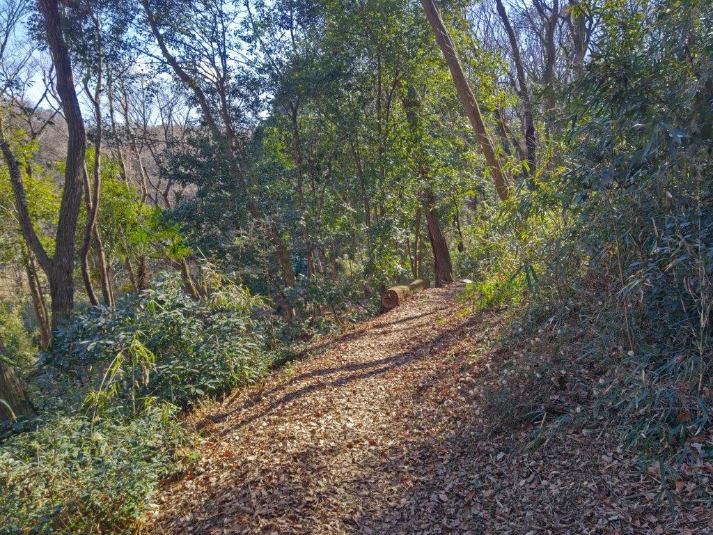 I was happy to be walking again in nature after a two-week break. After a short climb, I reached a level section; I sat down on a log in the sun to enjoy a late breakfast, while listening to the sound of birdsong. The trail then headed down a valley and I soon emerged onto a road, the same one I had followed on my previous visit. At a bend in the road, I rejoined the hiking trail, and at 11am, I arrived at Maezaka Pass (前坂峠). There, I turned right, heading southeast along the Hanno Alps (飯能アルプス) and the Oku-Musashi Long Trail.