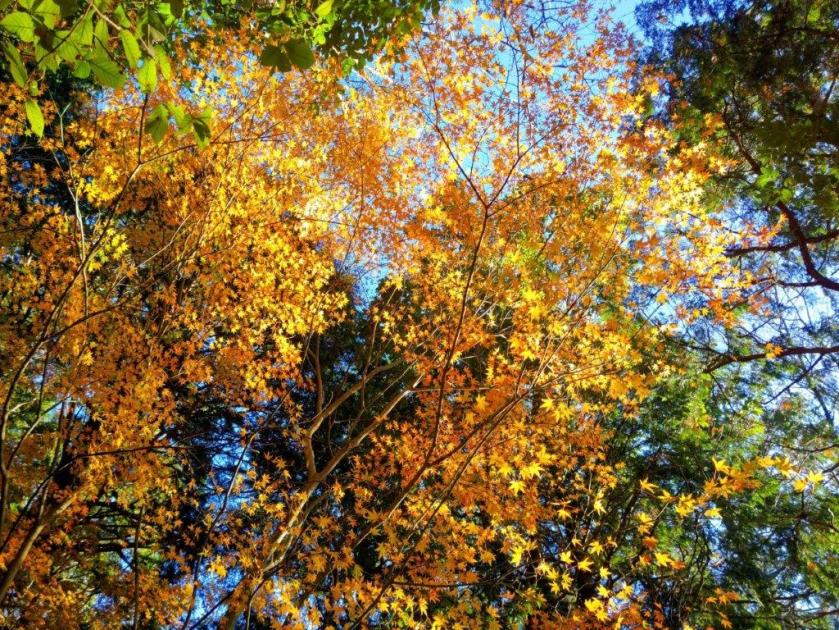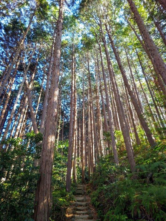 By this time of the day, the valley, oriented north-south, was in the shade. However, as I made my way up the mountain side, some sunlight finally filtered over the east ridge, lighting up the frothing water in a spectacular manner. After a while the trail merged with a forest road, and soon after, I reached my objective, Tarosugi (太郎杉), a giant cedar, 450 years old and 53m high. It’s also one of the 100 famous trees of Japan (3rd highest in the list, the highest being a tree in Akita, 58m). It stood to the right of the trail, in a small clearing at the top of a log staircase.