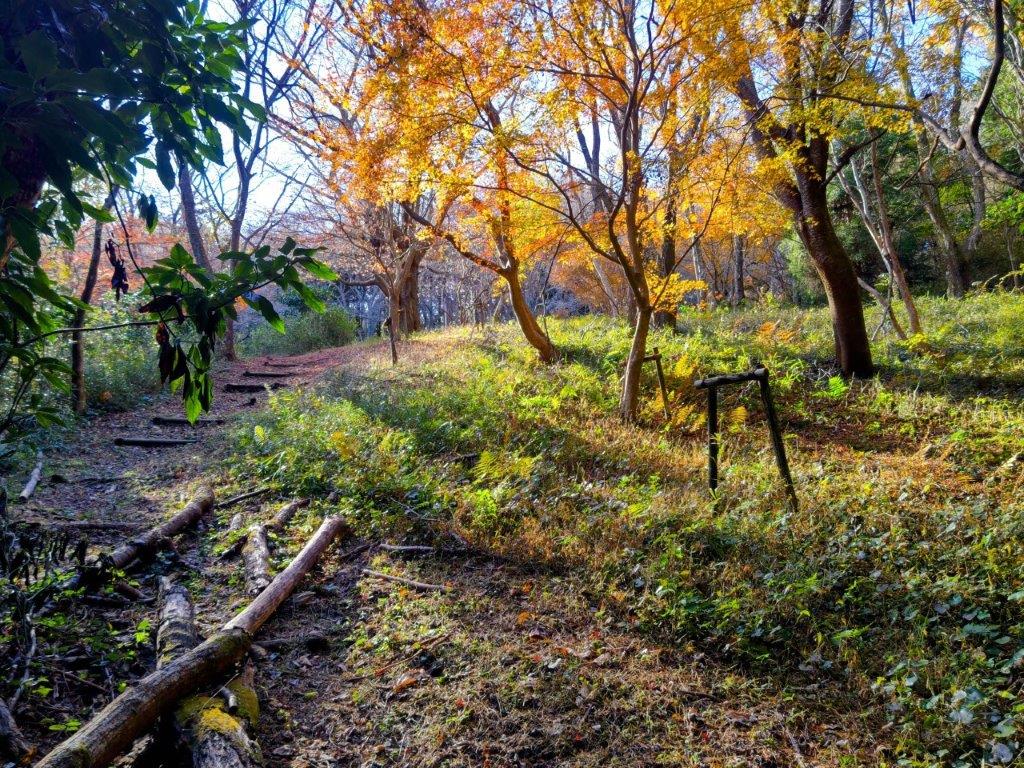 Since today was a leisurely hike and I had ample time till my return bus, I decided to make a short round trip to Namako rock (なまこ岩). Although the rock itself was nothing special, I enjoyed the walk up and down the narrow valley, alongside a rushing stream, surrounded by moss-covered rocks and mitsumata flowers (ミツマタ), slightly past their prime. At 1pm, I reached the Suishochi parking lot and headed down some steps leading from the road to a trail next to a river. I had good views of the fast-flowing water on the left side, bright green wasabi fields covering the opposite bank. After a short while, I crossed the river over a metal bridge. The trail then headed into the forest and hugged the steeped forested mountain ridge. At 1h30, I came to a wide-open space called Yuyu-no-mori (遊々の森).