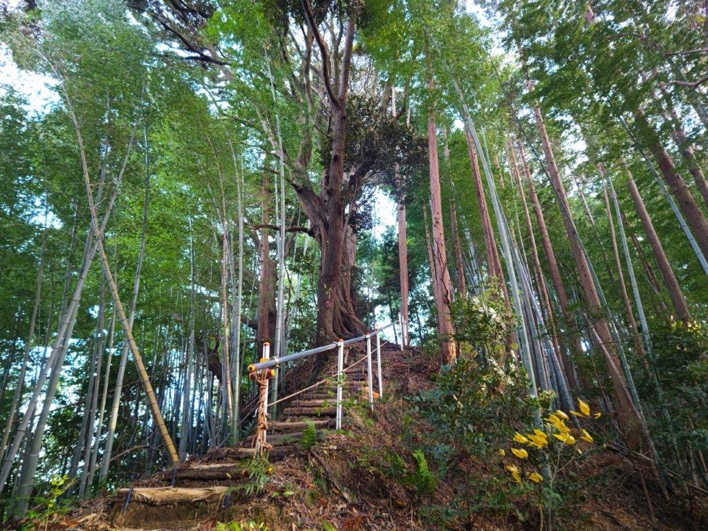 By this time of the day, the valley, oriented north-south, was in the shade. However, as I made my way up the mountain side, some sunlight finally filtered over the east ridge, lighting up the frothing water in a spectacular manner. After a while the trail merged with a forest road, and soon after, I reached my objective, Tarosugi (太郎杉), a giant cedar, 450 years old and 53m high. It’s also one of the 100 famous trees of Japan (3rd highest in the list, the highest being a tree in Akita, 58m). It stood to the right of the trail, in a small clearing at the top of a log staircase.