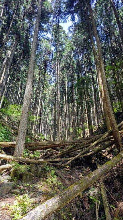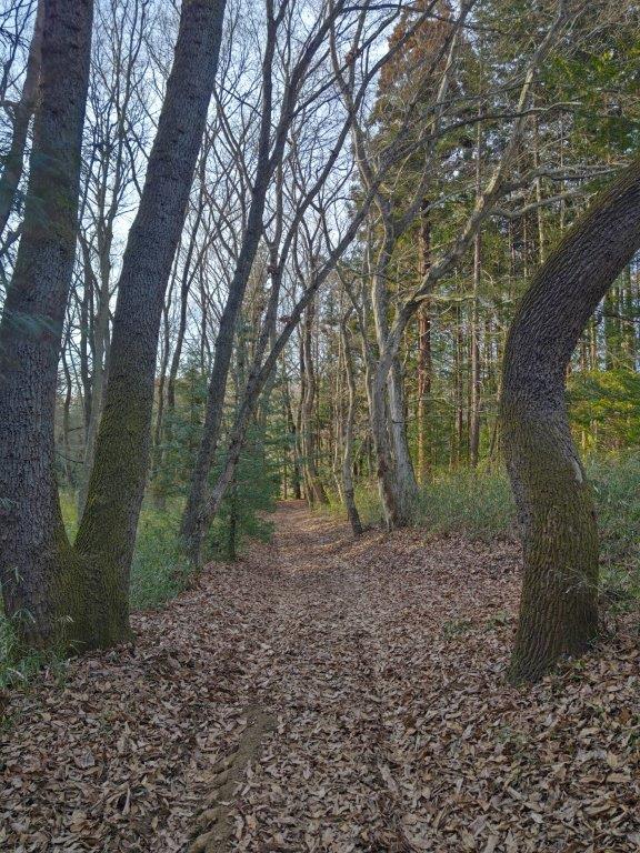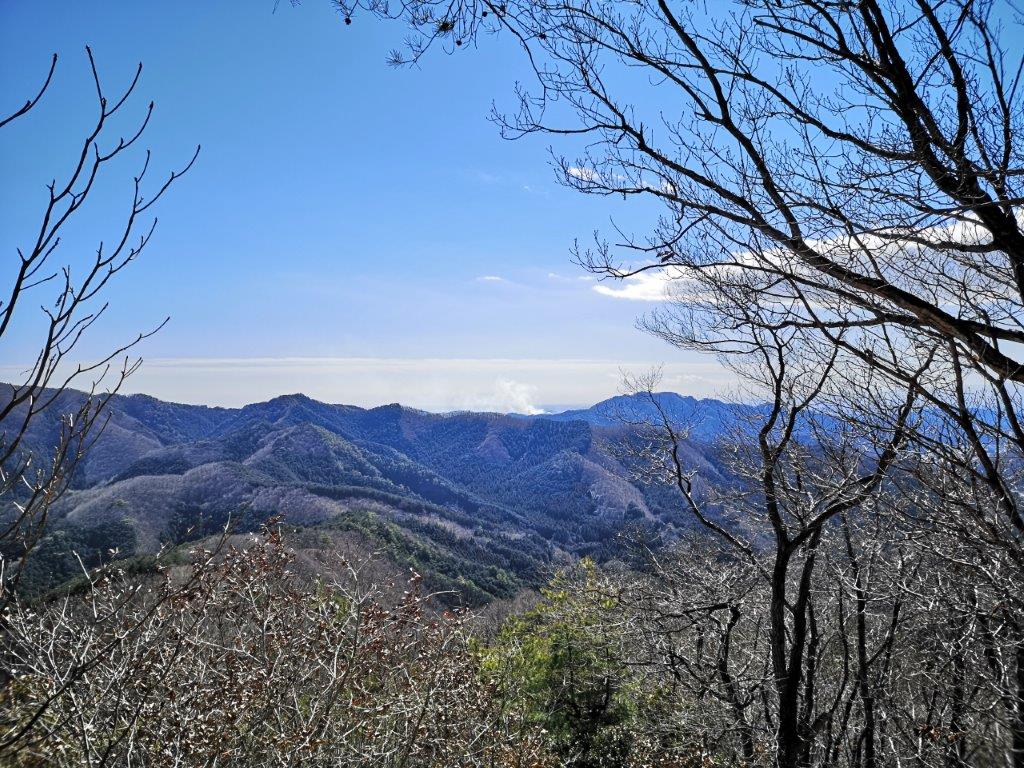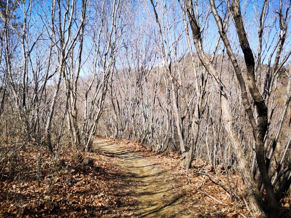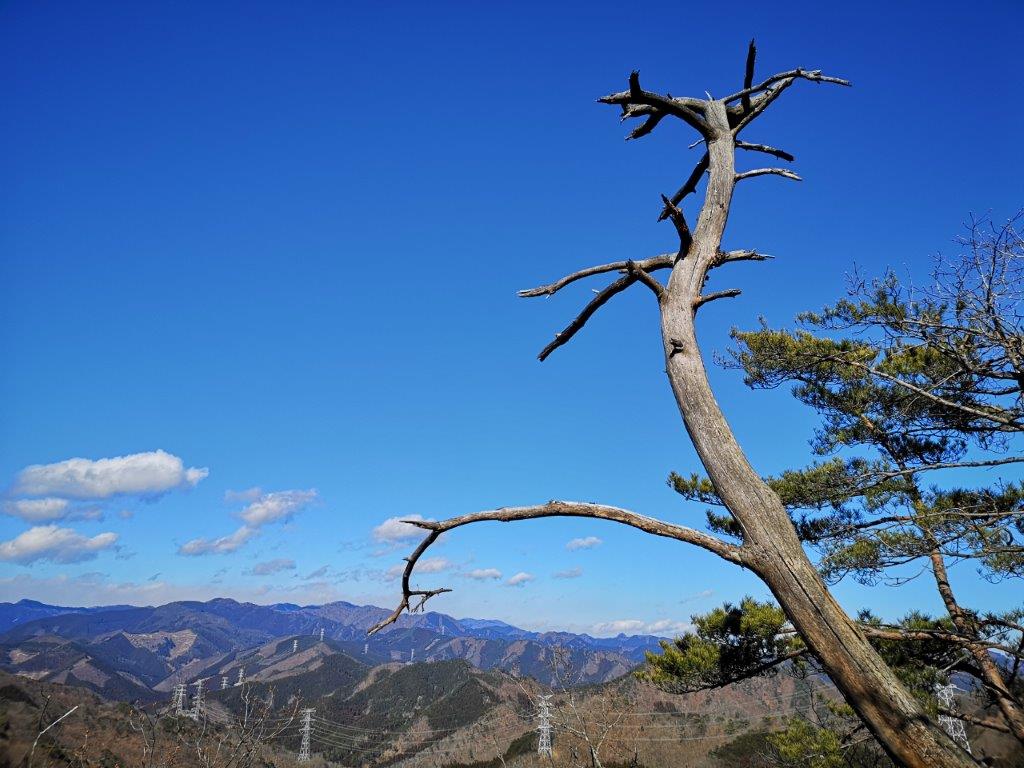 I was grateful to get a good view so early in the hike: looking south, I could see Umijiri Bridge spanning Ojika River, and in the back, Mt Keicho, one of the summits of Mt Takahara; on the north side, was Yunishikawa Lake, with Mt Takase rising behind it; in the far distance was Mt Arakai. I soon continue along a well-defined path, passing an open shelter on the left side. I was surrounded by the bright green of new Spring, but as I gradually gained altitude, I reentered an area of bare branches, creating fantastical shapes against the blue sky. Branches swaying in the light breeze created the only sounds, as birds had not yet returned from their migratory trips.