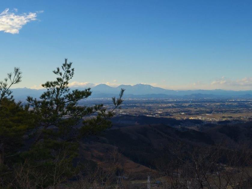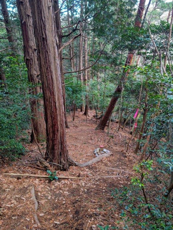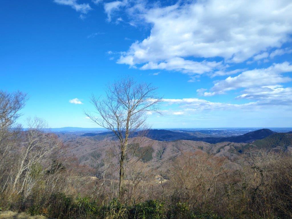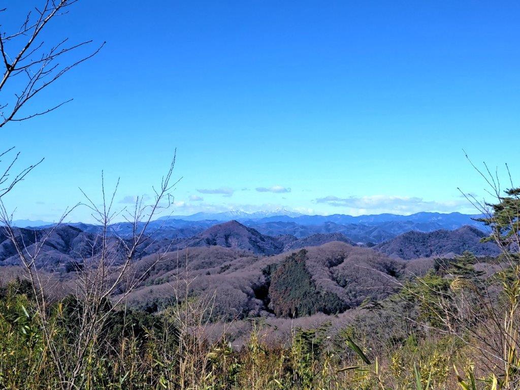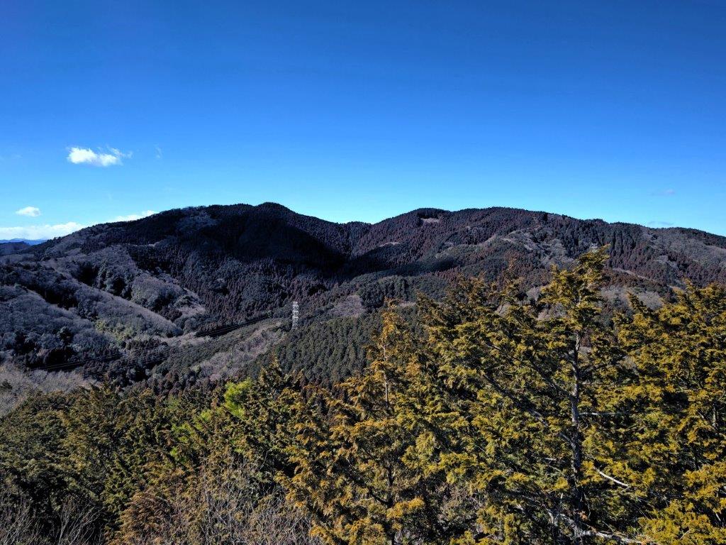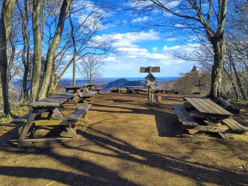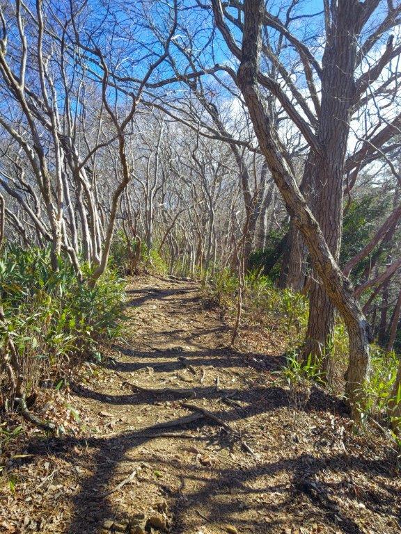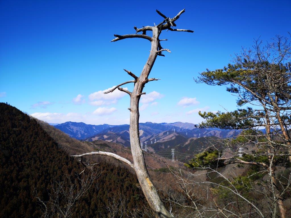 I took a moment to enjoy the view of the mountains of Tochigi, the only recognisable peak being Mt Gassan on the right side. One of the interesting aspects of this hike is the sight the of the wooden figures of the 7 Lucky Gods (“shichifukujin” 七福神) placed along the trail. I now passed Daikokuten (大黒天), the God of Wealth, one of the more popular ones. A few minutes later, just before 2pm, I reached an open shelter at the top of Mt Katsuro (葛老山 かつろうやま katsurou-yama), a 100 famous mountain of tochigi. Through the branches on the west side, I could see Mt Tashiro; on the north side, I had a double lake view, Yunishigawa lake on the left side, and Ikari lake on the right side; to the northeast, I had a good view of Mt Hiruga. I sat next to the statue of Jurojin (寿老人), the God of Longevity, for a late lunch.