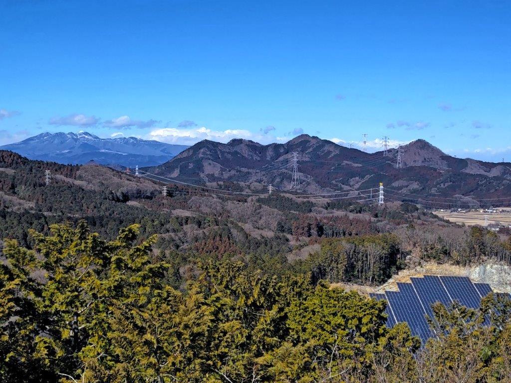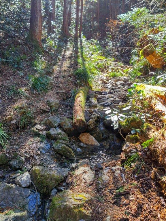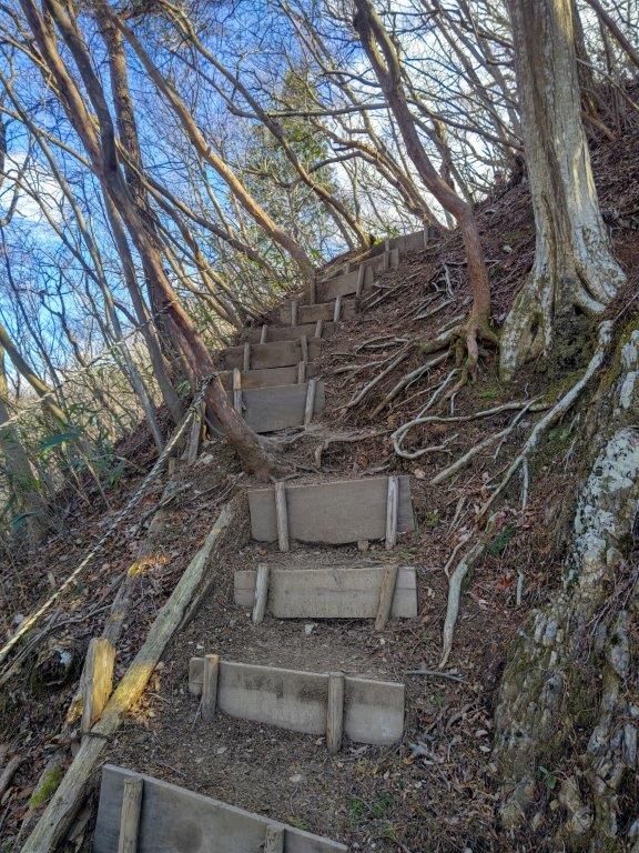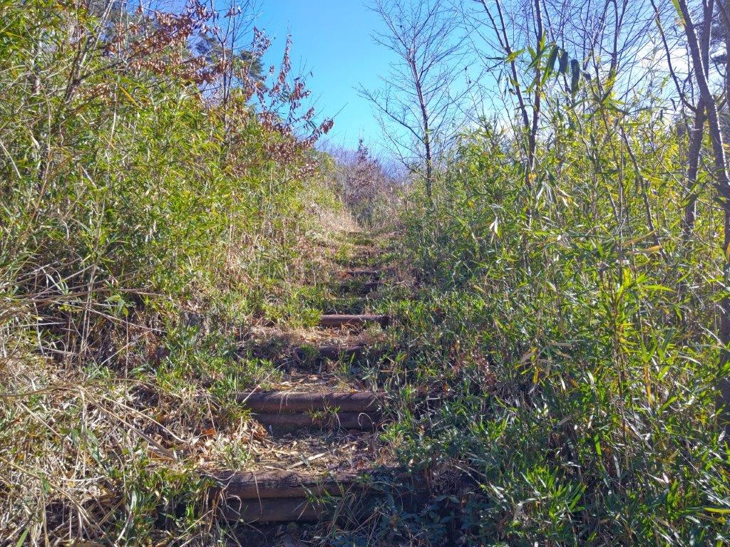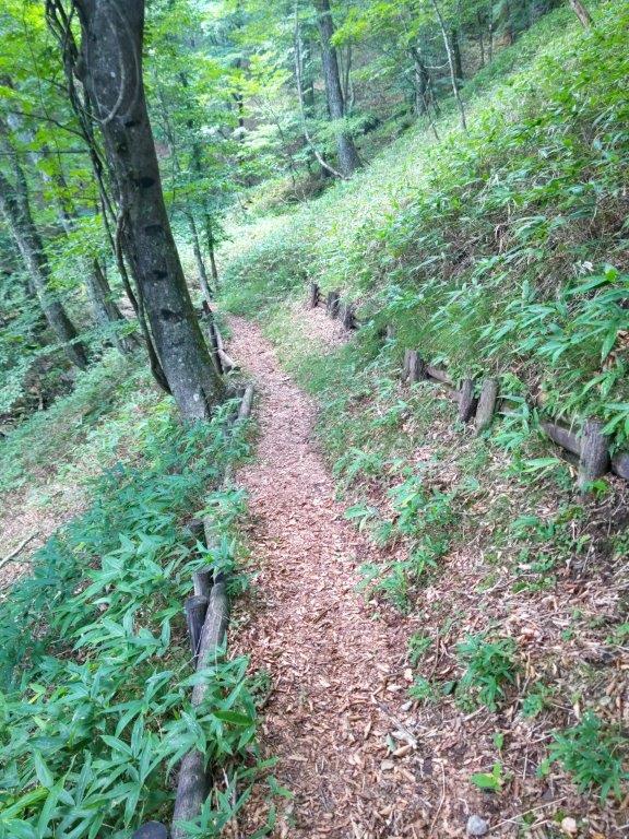 As I stepped off the train, I was surrounded by darkness, since Yunishigawa-onsen station (湯西川温泉駅) is located inside a tunnel running under today’s mountain. After riding an elevator to the surface, I got ready inside the Yunishigawa-onsen Roadside station, and at 12h30, started up the hiking trail at the far side of the parking area. After half an hour of climbing via a series of log staircases, I reached an electric pylon with views on both sides.