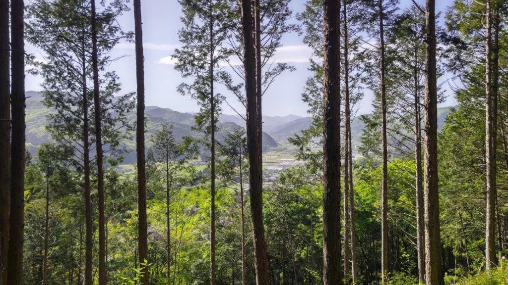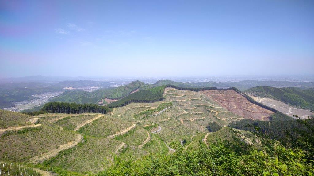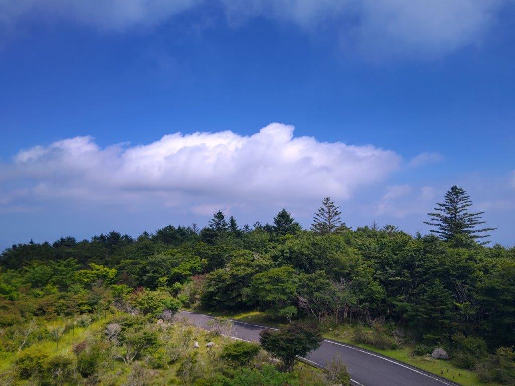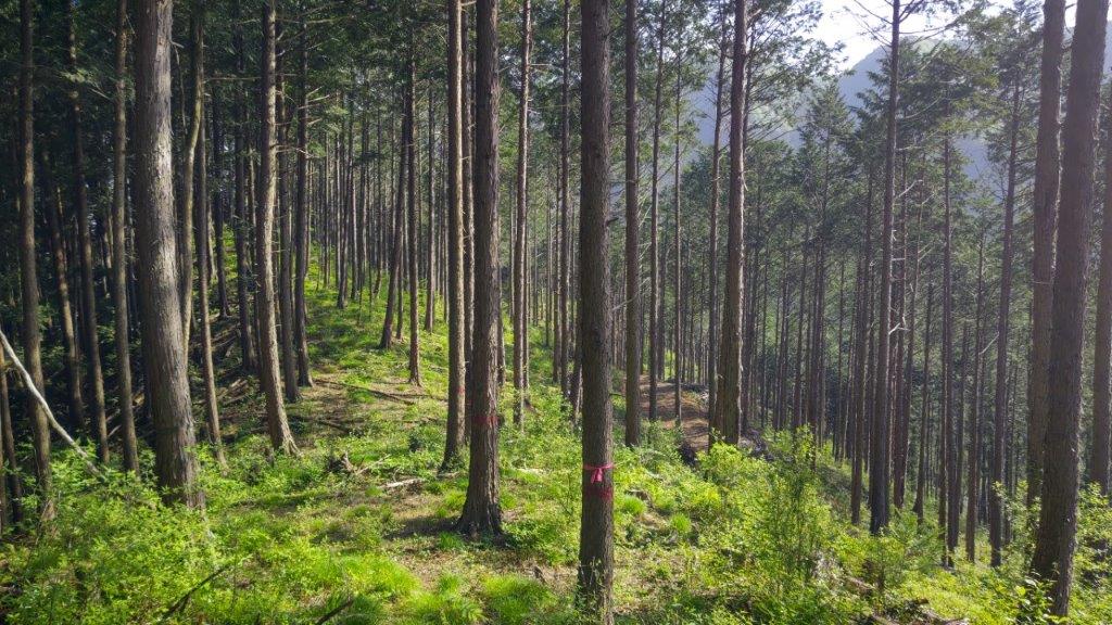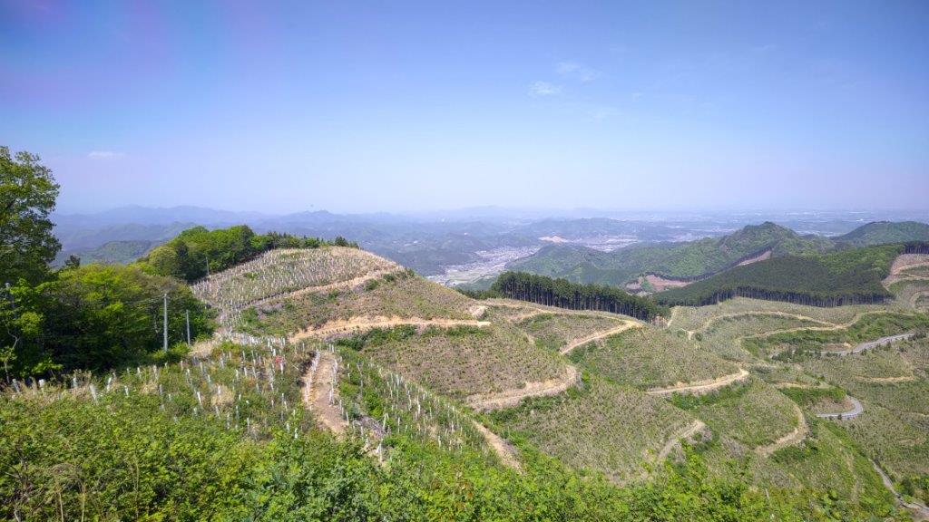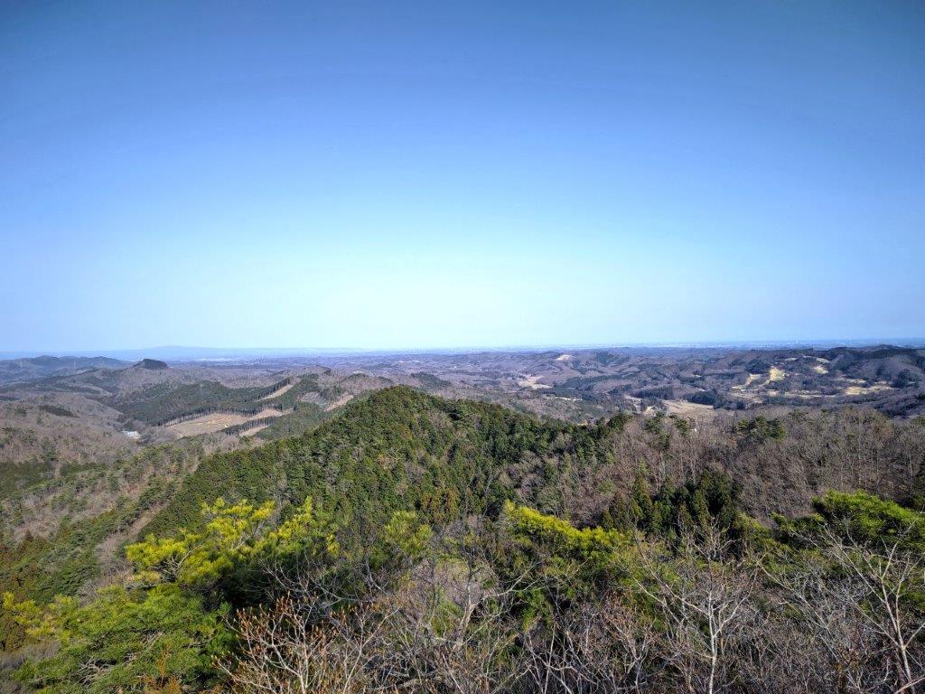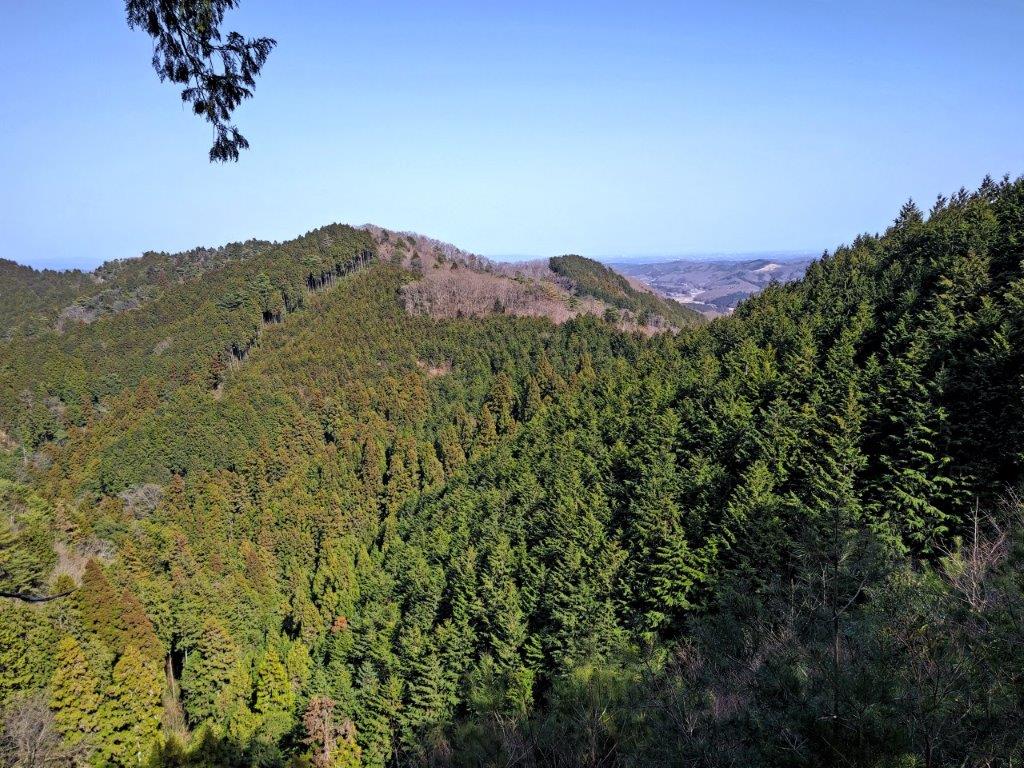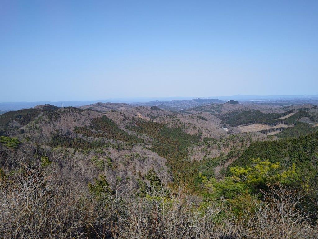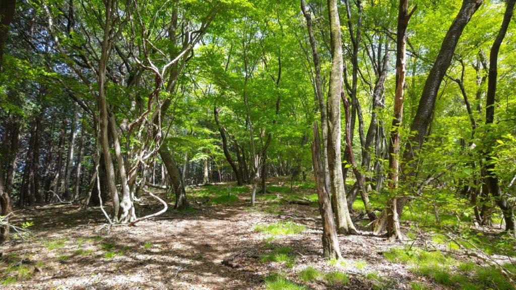 Here and there, I glimpsed distant snowy peaks through the branches, and was glad I had chosen to visit in this season. Although it was officially the start of the Golden Week, I saw only one other hiker on the mountain, perhaps because most people prefer to visit in May, when the whole mountain is covered in new green. At a bend on the east side, I glimpsed the white ski runs of Hunter Mountain, open till the end of Golden Week. I was now following a nearly level trail heading westwards through silent forest. Shortly after reaching the summit ridge, a view on the south side opened up above some green larches.