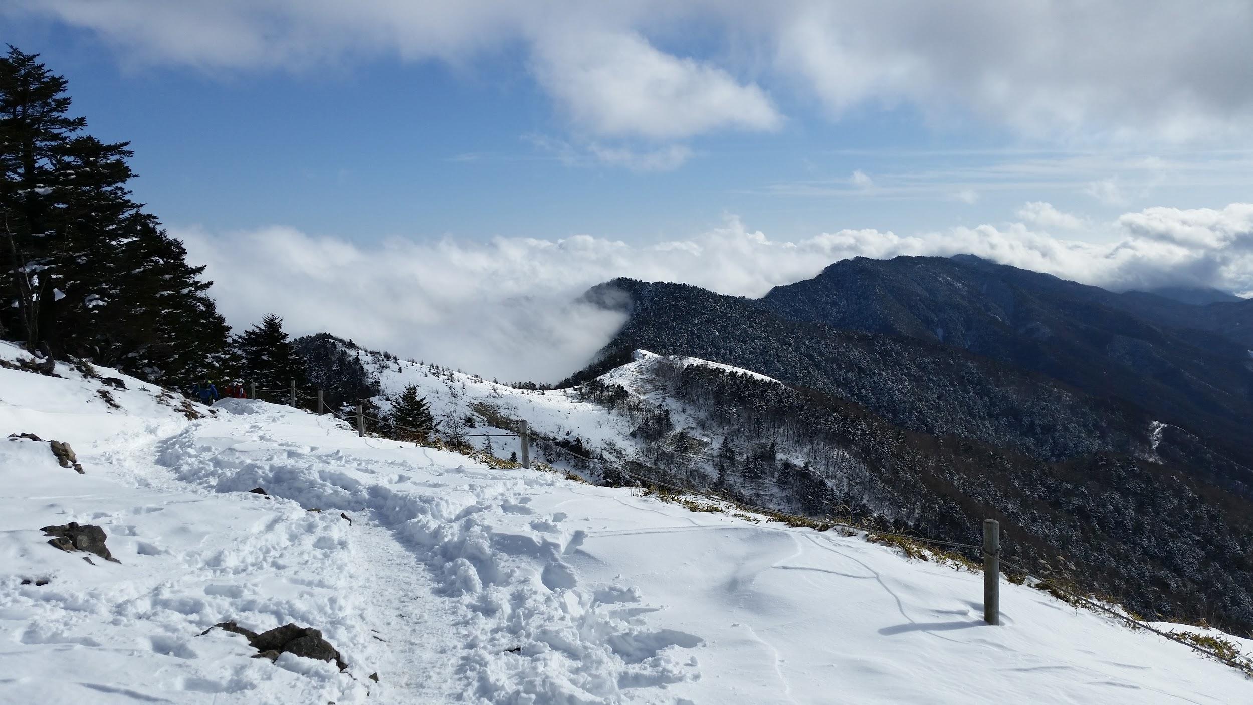 After a quick bite, I set off downhill just after 11am, towards a saddle where the Seinen Hut was located, just 20 minutes away. The last part was full of giant boulders, and it took some time since I had to step carefully from boulder to boulder, following painted yellow arrows. After that, I was climbing again through forest. Suddenly, I was above the treeline at around 2600m; there was a sharp drop on my left, and an impressive rocky outcrop towering in front of me.