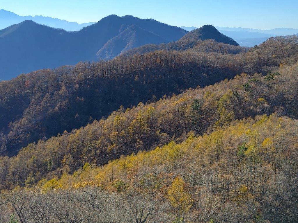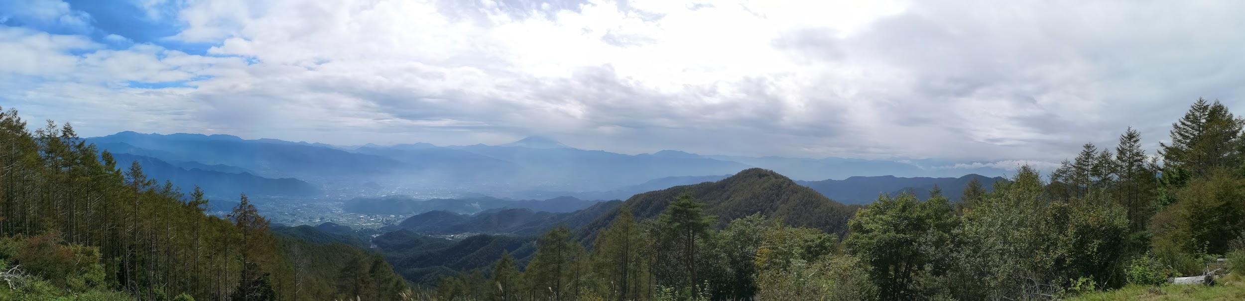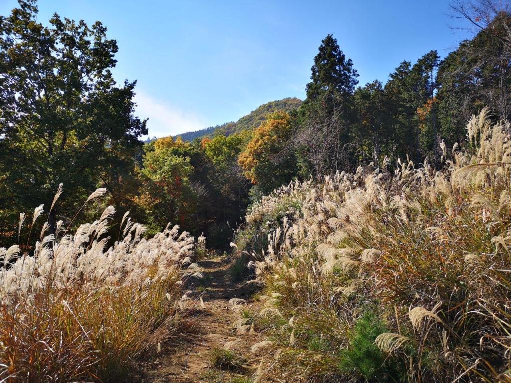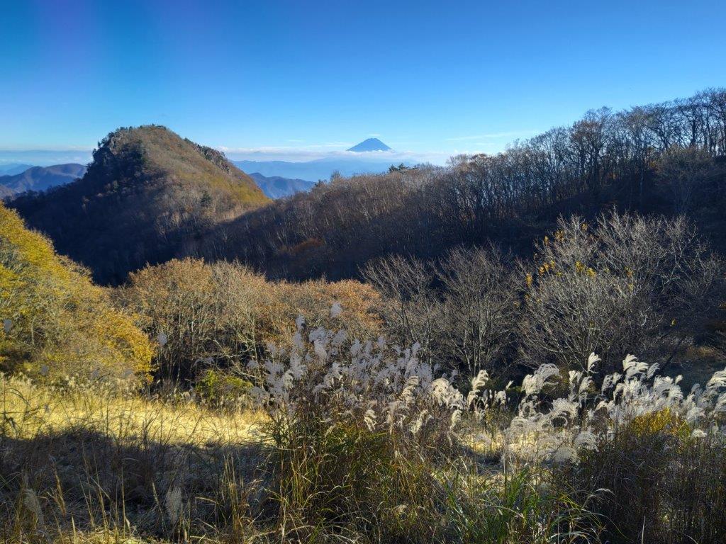 I was glad to get such a wide view so soon on the hike. On the left side, I could see Kurofuji, its cone-shaped summit not visible from this angle, and on the right side, was Mt Kinpu again, its rocky flanks now visible from this higher elevation. I followed a path for a few minutes westwards and off the main trail, to get a view of the South Alps, hazy blue in the far distance and with golden yellow Japanese Pampas grass (“susuki”) in the foreground. I made my way back through the “susuki” field and turned right up a dirt road. I soon reached a cleared area at the edge of the forest with a view on the north and east sides.