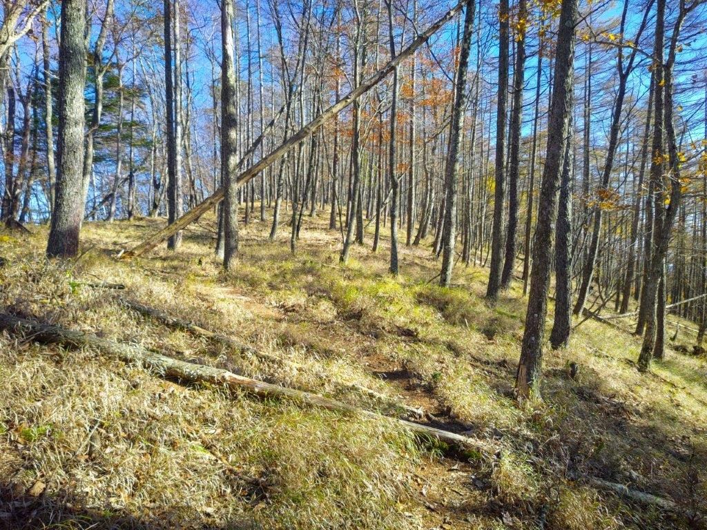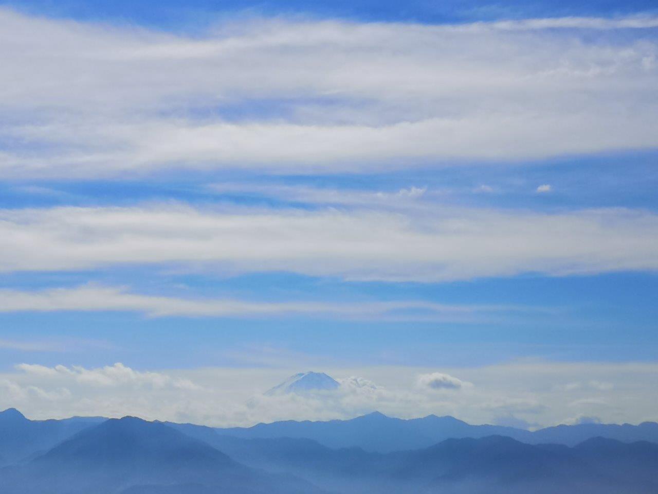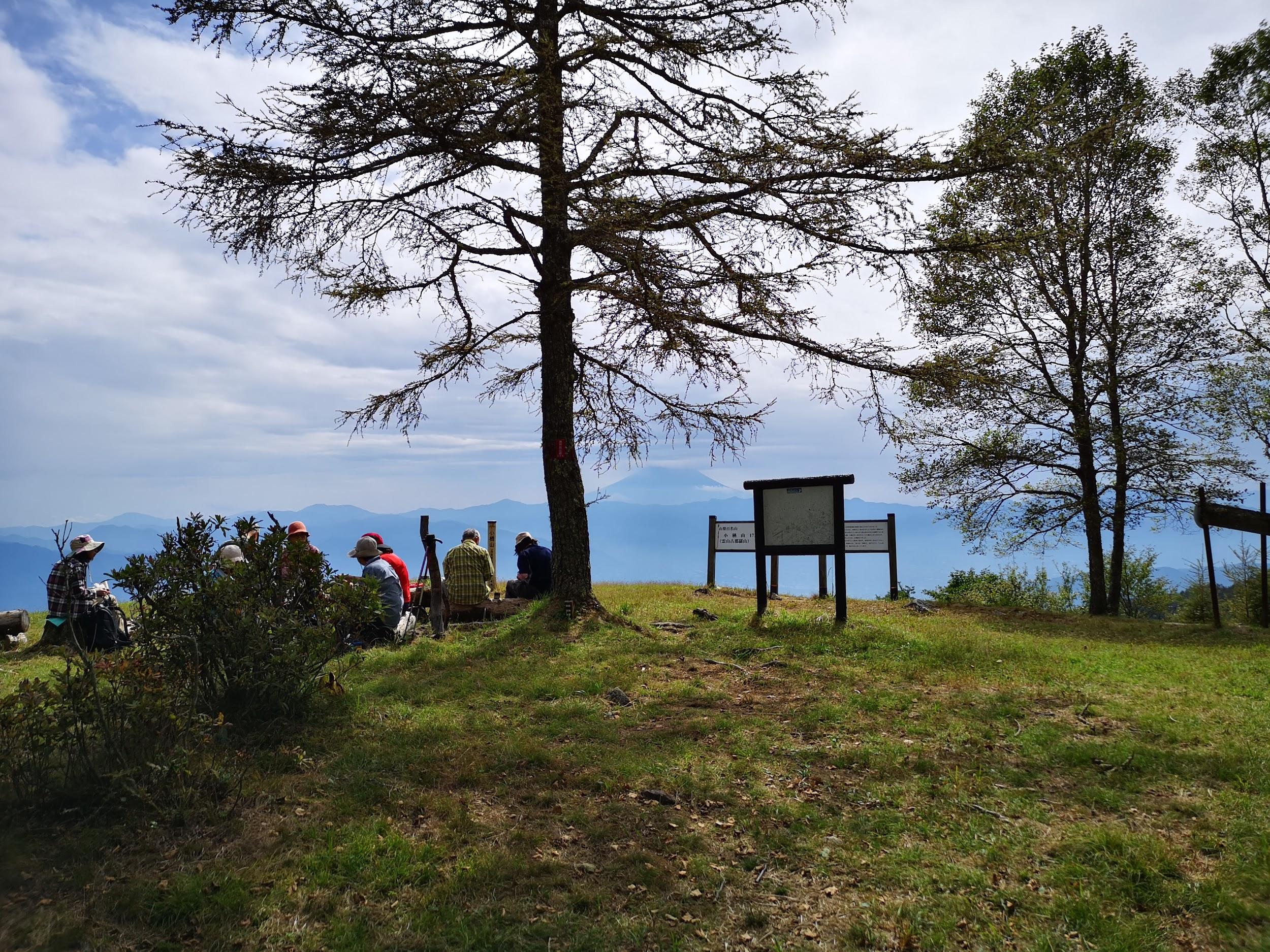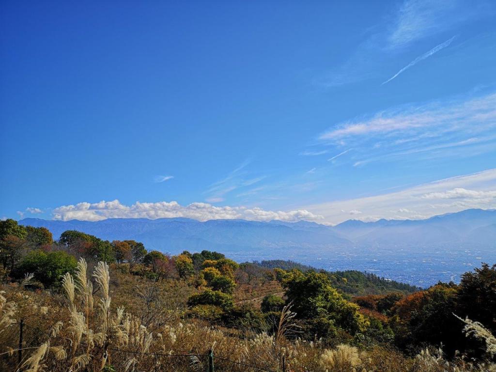 I was glad to get such a wide view so soon on the hike. On the left side, I could see Kurofuji, its cone-shaped summit not visible from this angle, and on the right side, was Mt Kinpu again, its rocky flanks now visible from this higher elevation. I followed a path for a few minutes westwards and off the main trail, to get a view of the South Alps, hazy blue in the far distance and with golden yellow Japanese Pampas grass (“susuki”) in the foreground. I made my way back through the “susuki” field and turned right up a dirt road. I soon reached a cleared area at the edge of the forest with a view on the north and east sides.