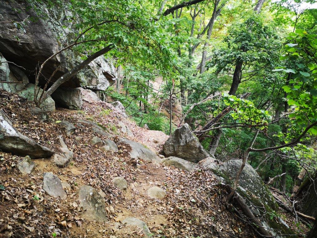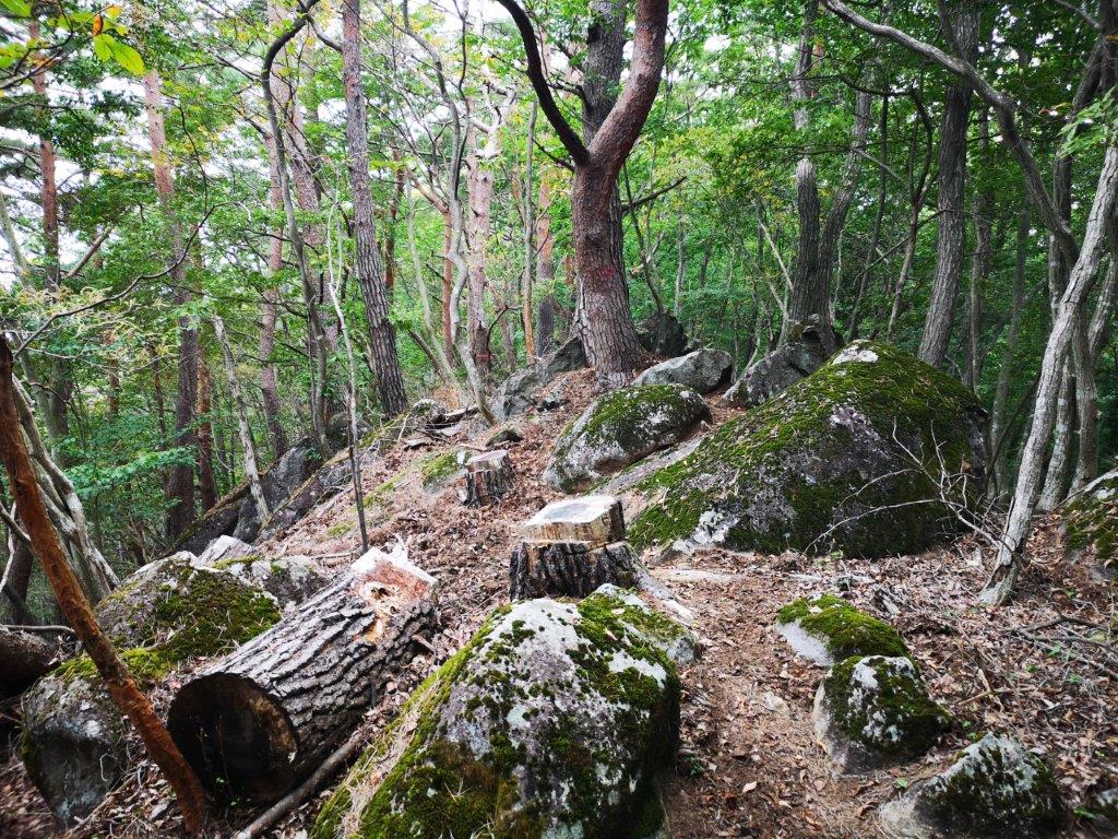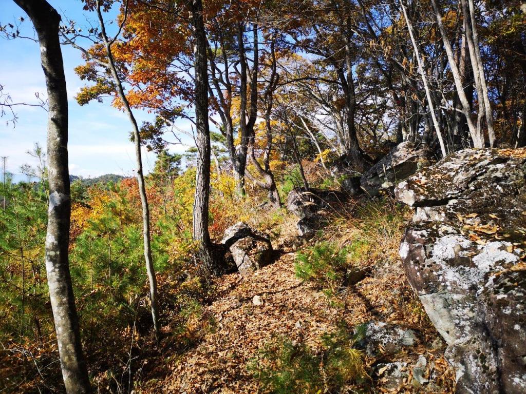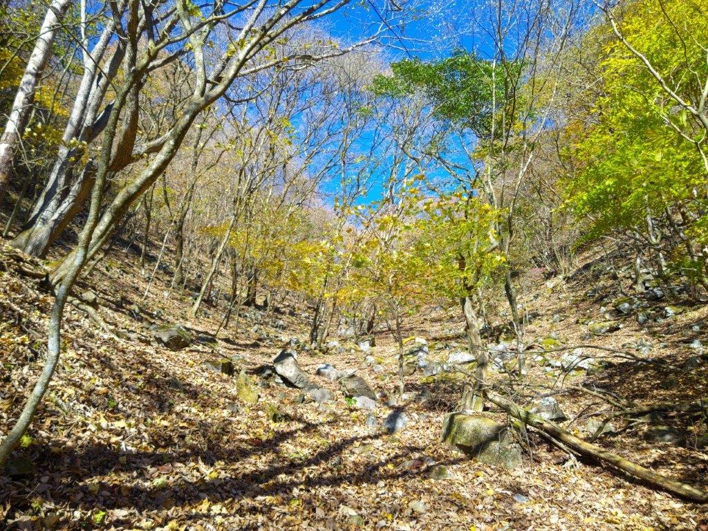 I sped through the sightseeing spots around the ropeway and up the trail for today’s first peak, taking care in the rocky sections and making good use of the safety chains; luckily, the thin pre-autumn leaves crowds meant I could make good time, and at 2h30, I reached the summit of Mt Rakanji (羅漢寺山 らかんじやま rakanjiyama) also known as Mt Yasaburo (弥三郎岳 やさぶろうだけ yasaburoyama), a famous 100 mountain of Yamanashi. I took a moment to enjoy the alpine-like scenery of white smooth rocks and pine trees, as well as the 360° view from the top; Mt Fuji now had a cloud perched on its summit crater in lieu of snow. I then retraced my steps back to the ropeway area and headed down a half-hidden path on the south side.