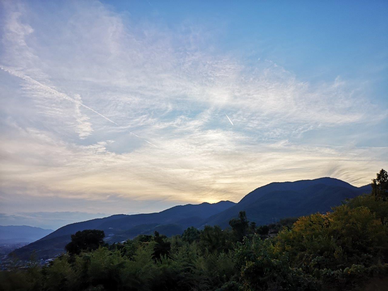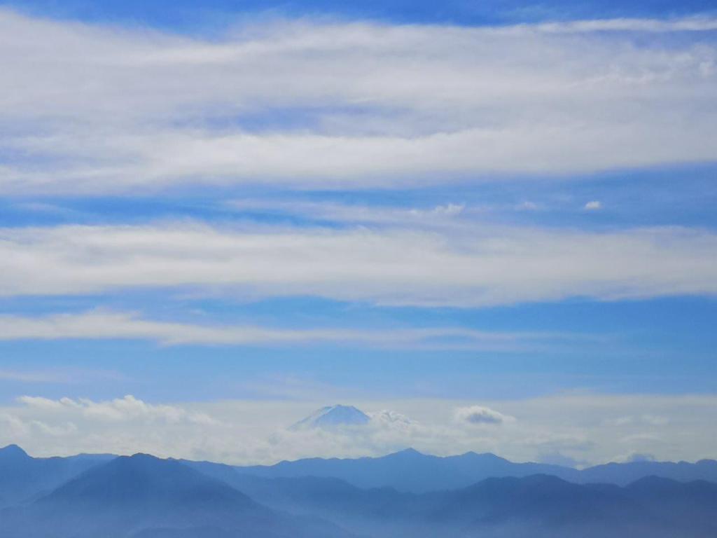I was delighted to get a view of the peak I had been standing on a short while ago, allowing me to appreciate its steep and rugged shape. I had now fallen behind schedule so I retraced my steps to the main trail without a break. It took me just 15 minutes to reach another turn-off, this time to the right. A few seconds later, I reached the Mt Shiro (白山 900m) viewpoint, a minor peak with a view of the South Alps, now partially hidden by clouds, as well as the Kurofuji Volcanic group, its highest peaks wrapped in mist. I continued on my way, following the level path through mixed forest as it hugged the mountain side, the late afternoon gloom gradually increasing.