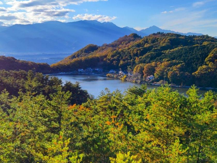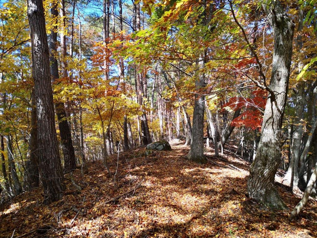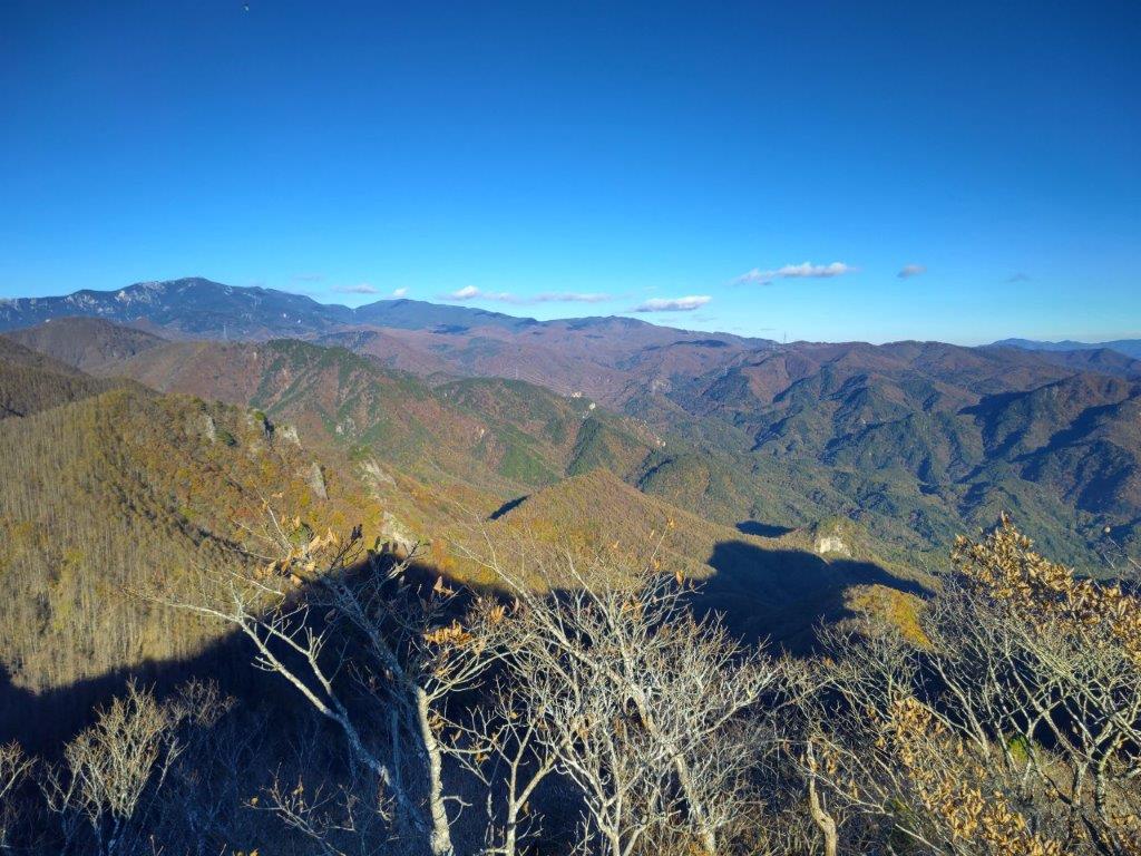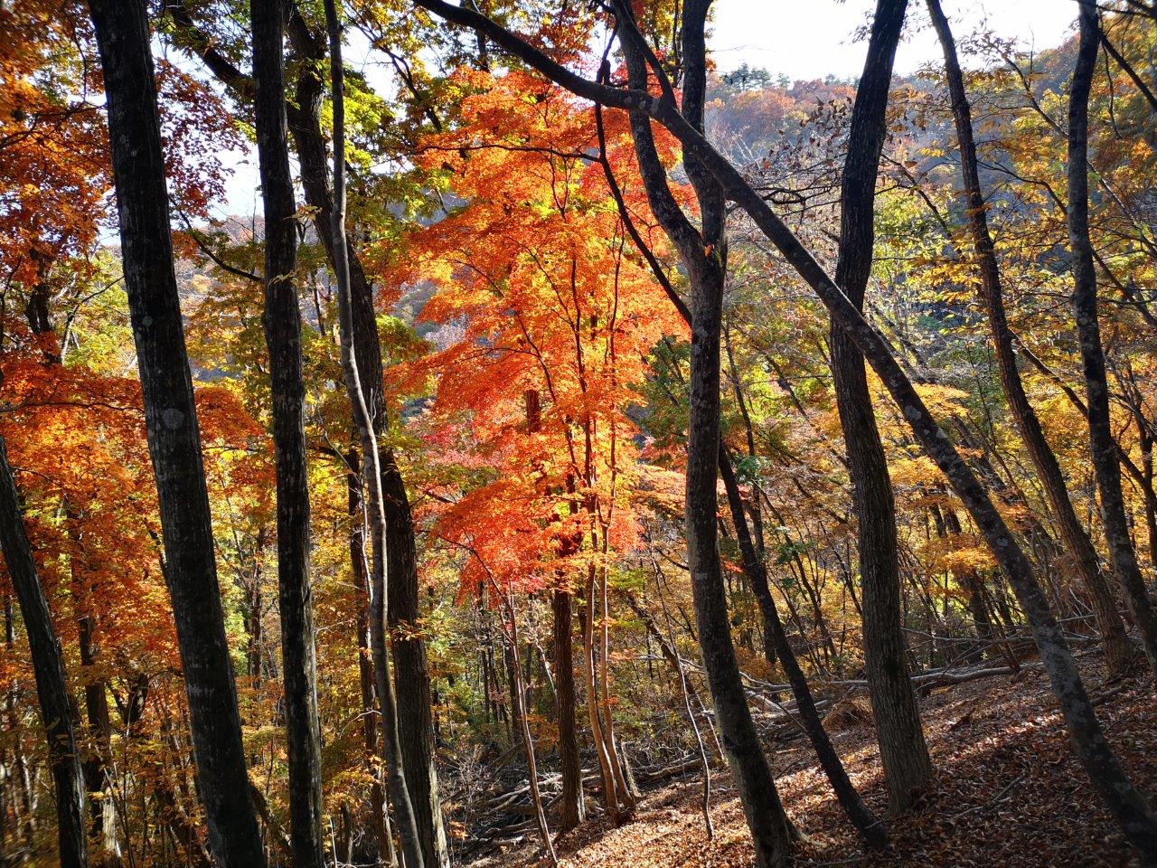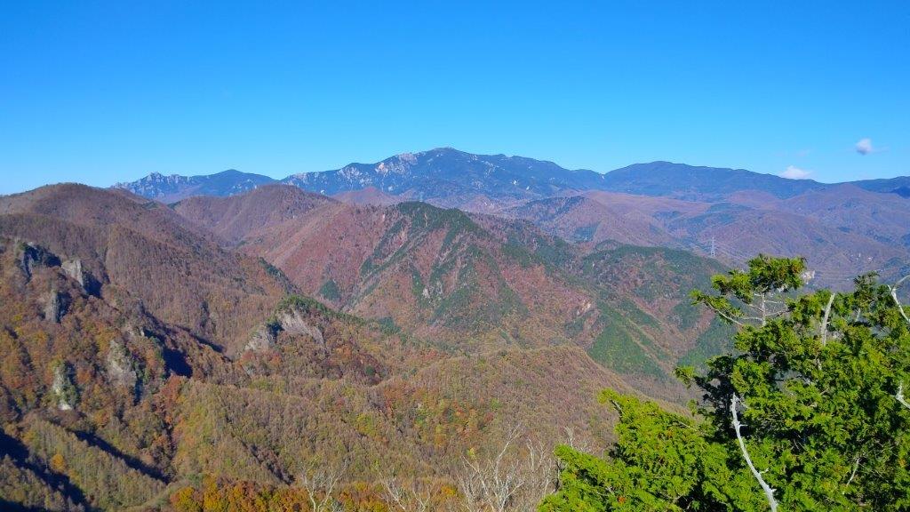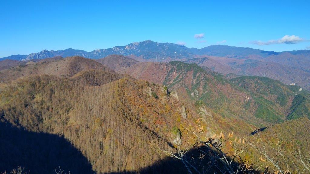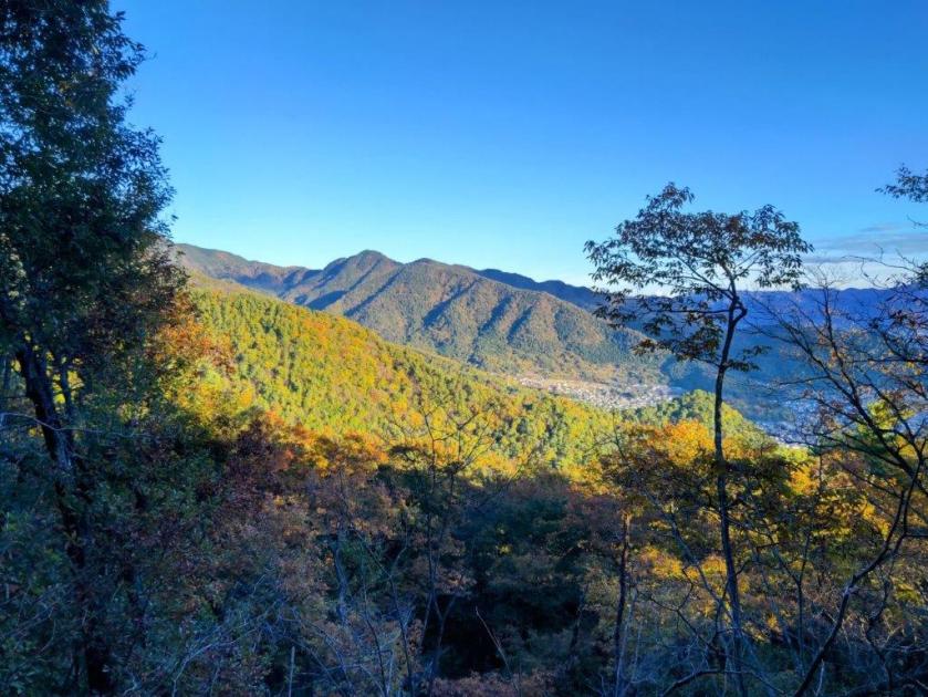 I was pleasantly surprised to get such a wide view on this side of the mountain, which now included Mt Tachioka at the very left and Lake Nosen at the very right. Mt Kinpu rose prominently in the background, the second highest peak in the Chichibu-Tama-Kai National Park and a 100 famous mountain of Japan. Since it was nearly 1h30, I found a suitable tree stump to sit on for a late lunch break. As forecast, the clouds had spread across the sky from the south, providing some welcome shade on a warm Autumn day. I set off again along a winding track sticking close to the level ridgeline, and just before 2pm, exited the forest just below the Panorama-dai Station (パノラマ台駅) of the Shosenkyo ropeway.