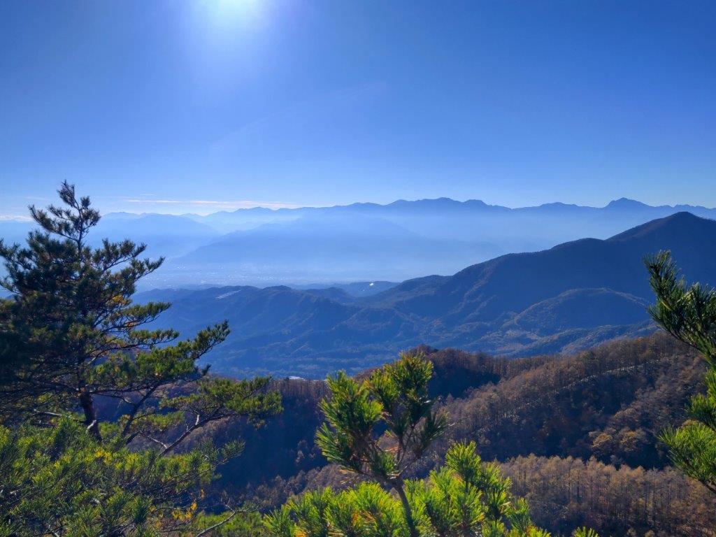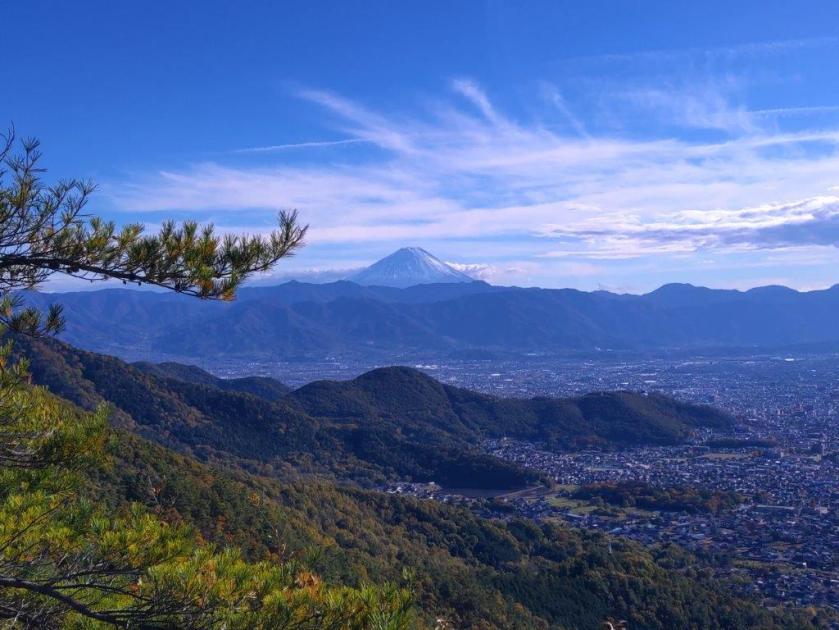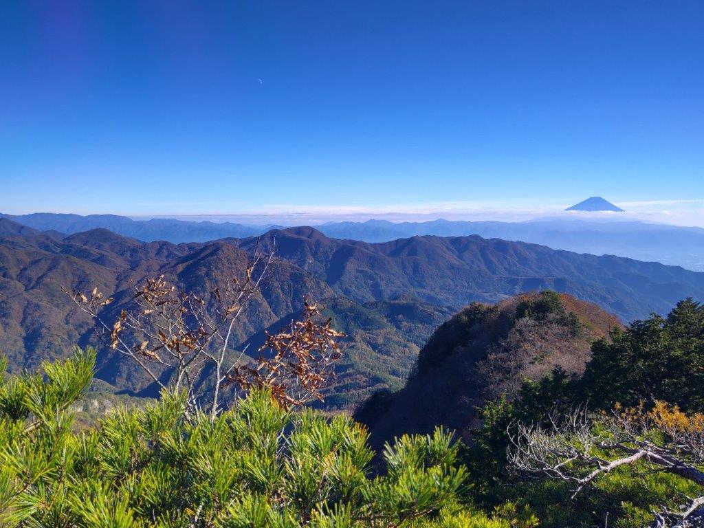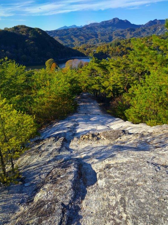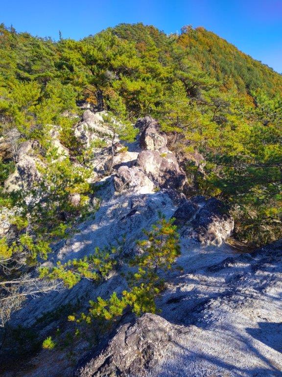 I was happy to leave the crowds behind although I now found myself walking all alone through forest in the middle of the afternoon. Fortunately the path was easy to follow, and at 3pm, I arrived at the turn-off on the left side for today’s next peak. It took me about ten minutes of climbing to reach an exposed rocky area with a view of the ridge leading to Mt Rakanji. A few more minutes brought me to another such place but with a view southwards of Mt Fuji and the Kofu basin. Finally, after a couple more minutes of walking through the smooth white boulders and gnarly pines, I arrived at the top of Mt Shirosuna (白砂山 しろすなやま shirosunayama), aptly translated as white sand mountain.
