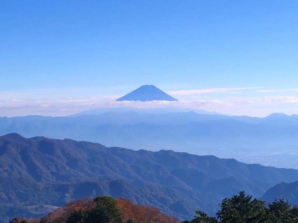 I couldn’t resist making the short round-trip, especially since the sun was shining and the trail seemed easy to walk. After a 10-minute walk through tall cedars, I arrived at an open space with a view of Mt Fuji framed by pines to the south; looking north, I could make out the broad summit ridge of Mt Kinpu, recognisable by the manmade boulder formation protruding from its highest point. After a short break to enjoy the peaceful surroundings, I retraced my steps to the base of the shrine, and a short distance away, turned right up a road signposted for today’s mountain. After a few bends, I reached the end of the paved road and entered an open space with a view to the northeast.