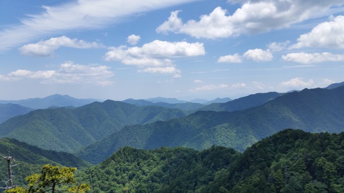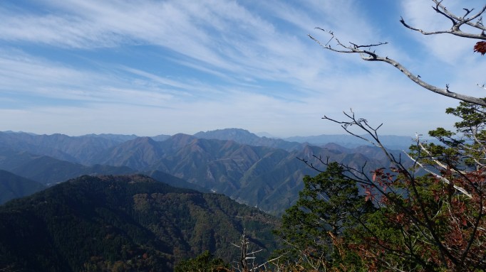 I continued along the ridgeline, circling the source of the Kiryu river, clockwise. Soon, I was walking South along an easy trail, and I arrived at Mt Kumataka 熊鷹山 less than an hour later. There was a small observation tower with a 360° view of the surrounding mountains. I could make out Mt Koshin and Mt Kesamaru to the North, where there was some sun, and Mt Akagi under a dark cloud to the West. In the East, it seemed like it was raining.