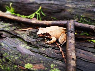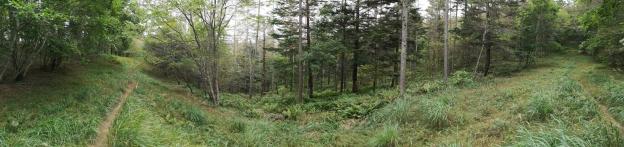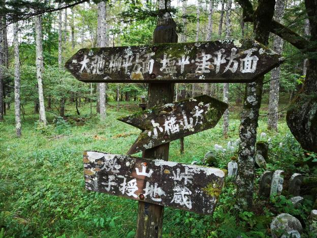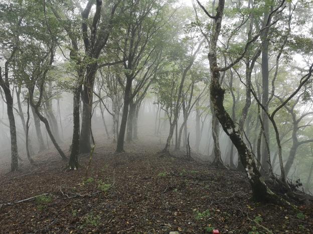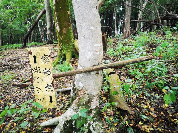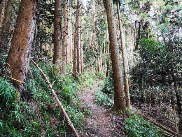 Around 1h30, I emerged onto a road, but I soon turned left onto a small trail to Johotsuganji Temple. At this point, I had left the Fureai no Michi. After about ten minutes, I arrived at a small cave at the base of a cliff. It contained some Buddhist statues, and from the croaks I was hearing, some frogs as well! The trail continued up the mountain, along a ridge crisscrossed with tree roots, making it a little difficult to follow. Before reaching the highest point, the path turned right and followed the side of the valley. Here the path showed signs of maintenance, and was much easier to follow. Around 2pm I reached an old bench, a good place for a break and a late lunch. There was no view, but the surrounding was very peaceful save for the chirping of birds. The path continued, along a level ridge extending northwards.