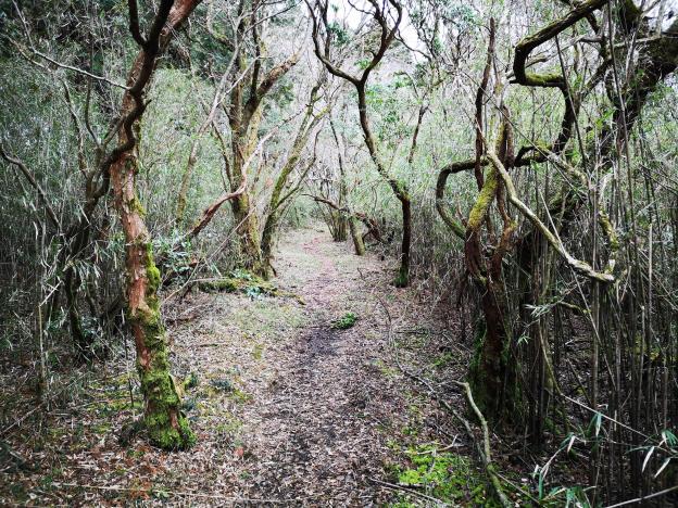 After a delicious meal of cold soba and tempura or “tenmorisoba” at Sobanosato Magino, I continued on my way at about 2h30. The next two hours were again mostly along small roads. They were interrupted by two short sections of lovely forest walking. Occasionally I had some good views of the surrounding hills. There were a couple of observation towers, but the views must have been better decades ago, when the trees weren’t so high.