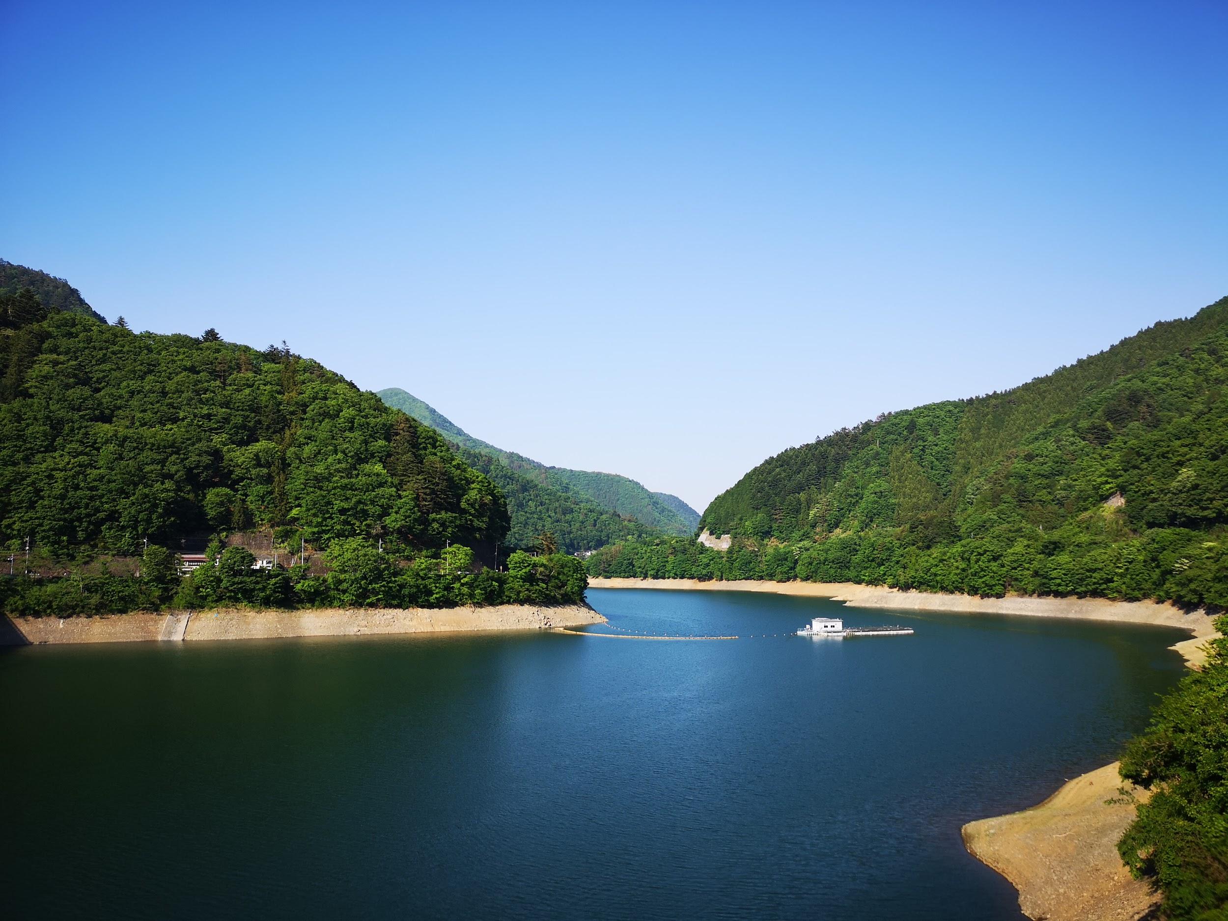 Soon, Okutama lake came into view and, after a couple of ups and downs, I finally emerged onto a road circling the lake, nearly two hours after I had started down. Here, my plan was to take something called a floating bridge “ukihashi” 浮橋 across the lake, but I was informed via a sign that it was closed at the moment. Nonetheless, I decided to check it out. While following the road, I saw a green snake. After some prodding with a branch, I realised that it was dead, despite looking very much alive. Apparently, it had been hit by a vehicle moving at high speed, and only suffered a “nick” to a part of the body, which was enough to kill it.