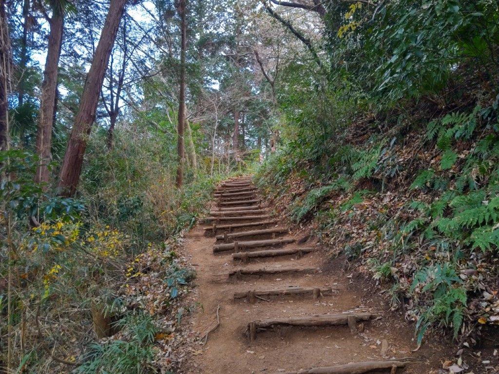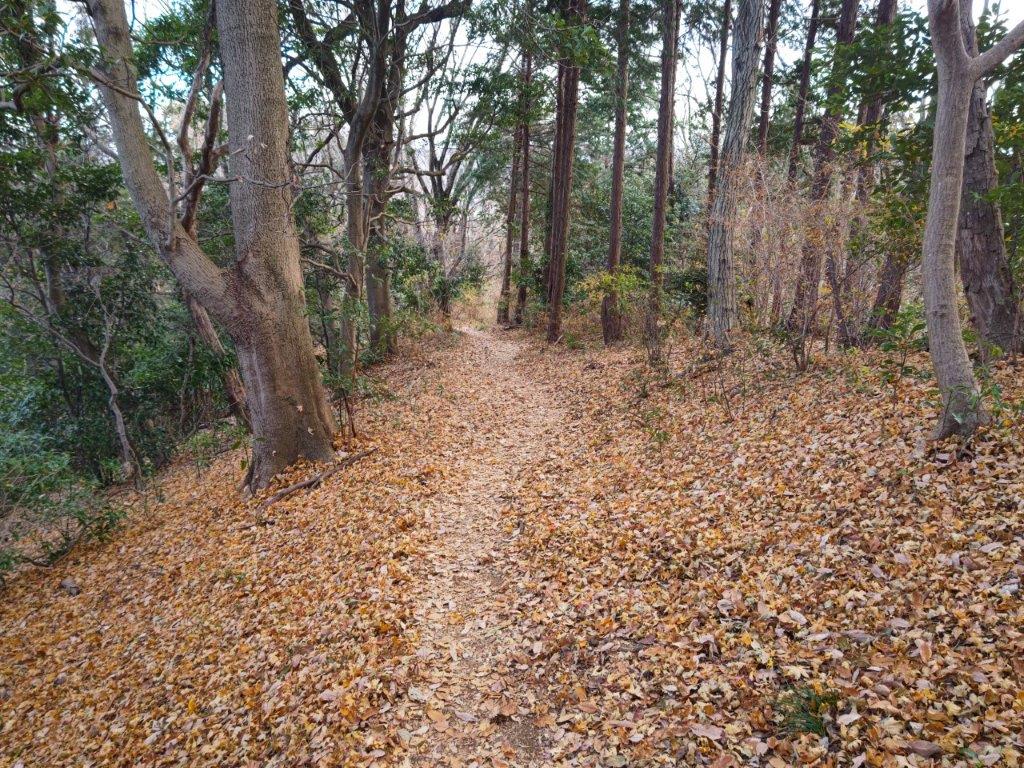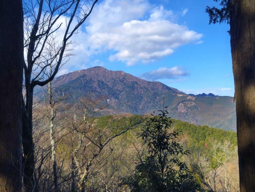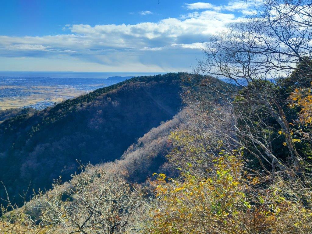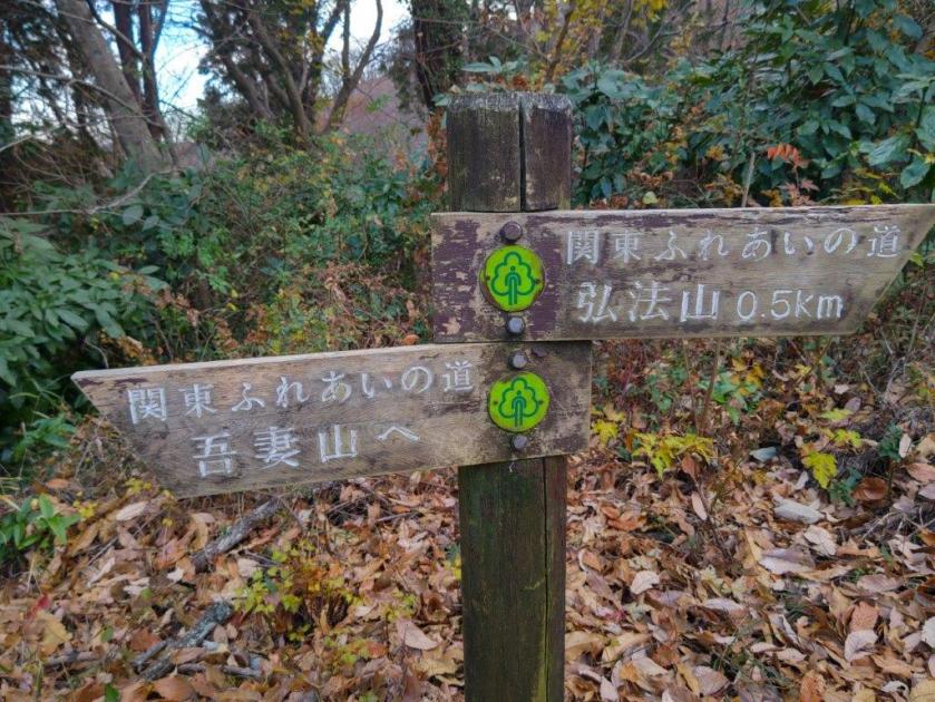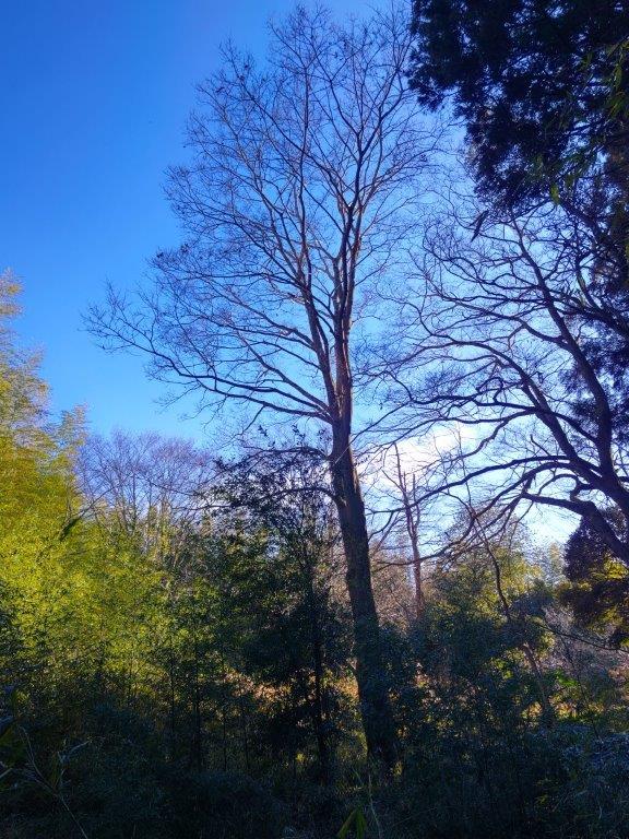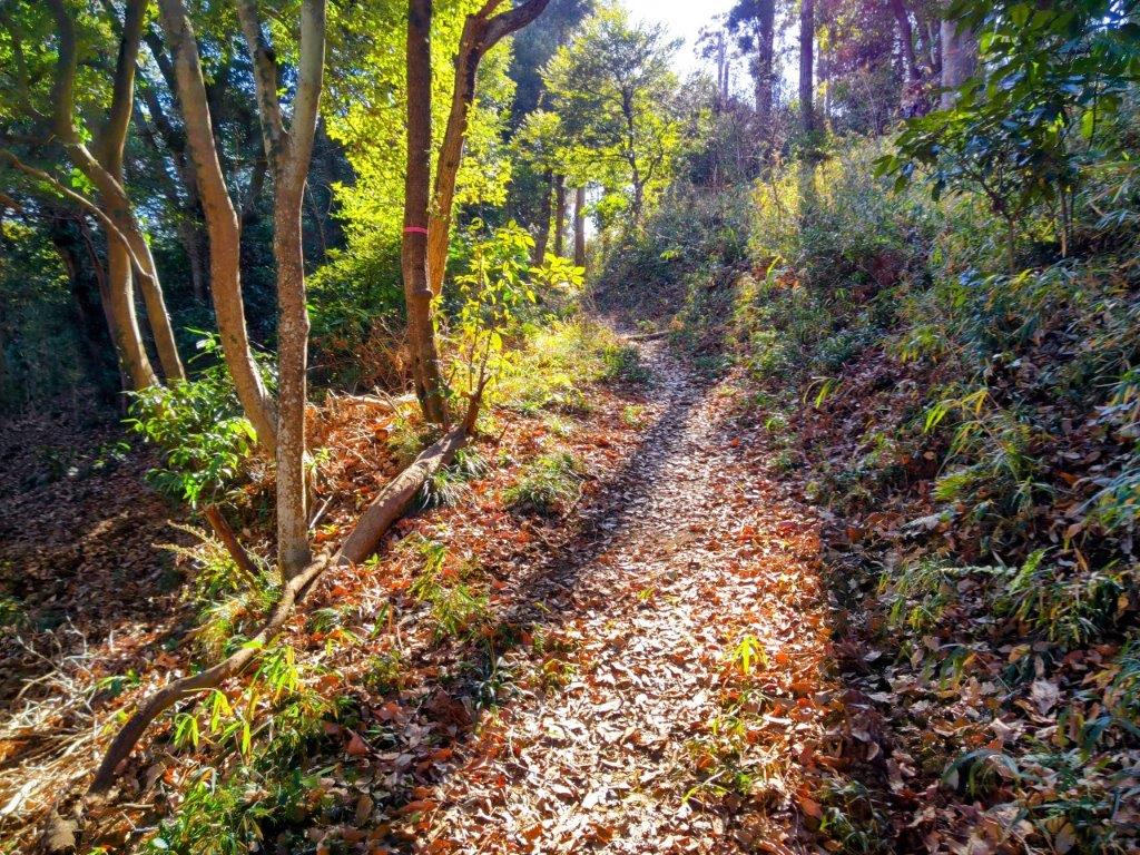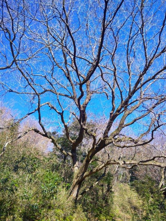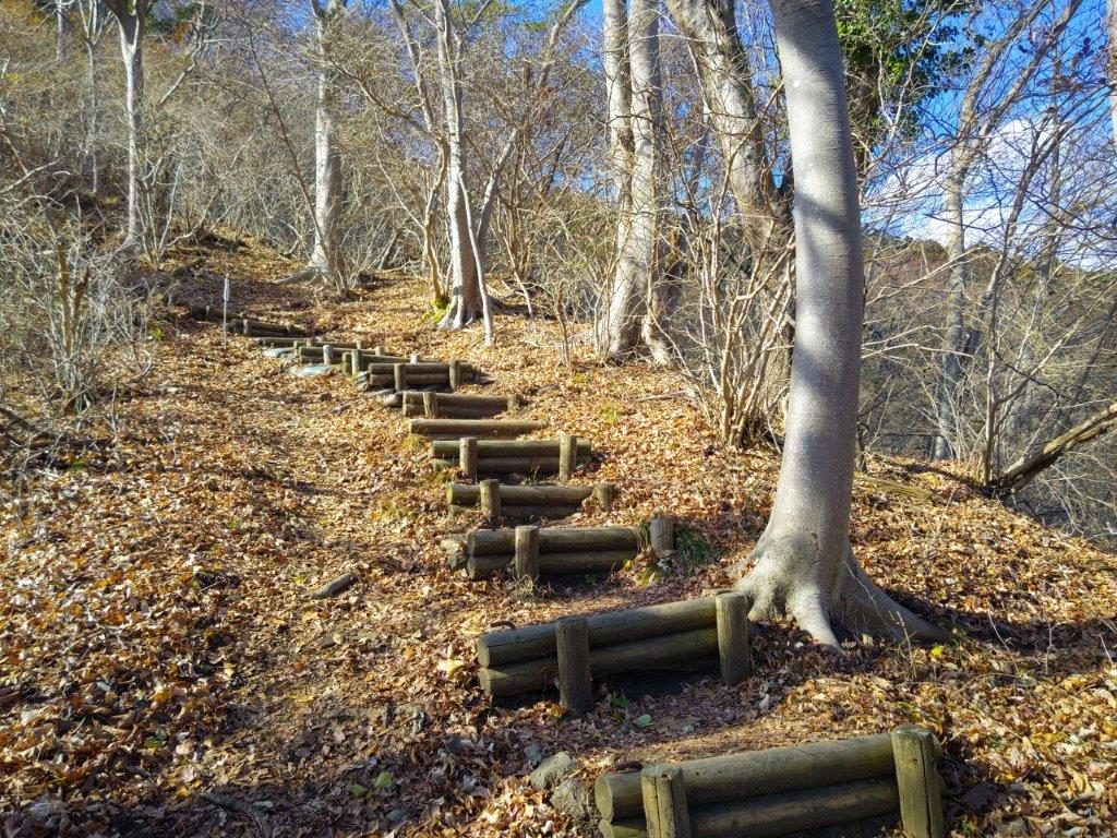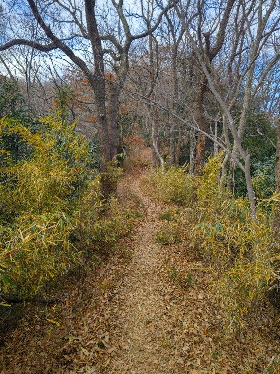 I found myself walking among tall beeches, their tops already bare of leaves, drawing attention to their white trunks. After recrossing the dry riverbed, I reached a paved road where I turned right and soon passed the gated entrance for the road for Fujiyama Twin Terrace, closed to private cars. A little further, I arrived at a sign for today’s mountain, pointing to a faint trail heading up the left side of the dry riverbed. Here, I was glad I could see my position on the Japanwilds digital map since the trail was at times hard to follow. At 1pm, I turned right onto a ridge, the path merging with a signposted trail leading to the summit.