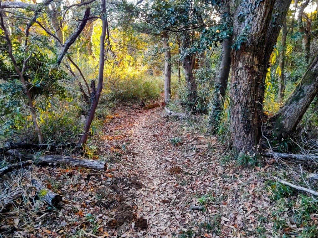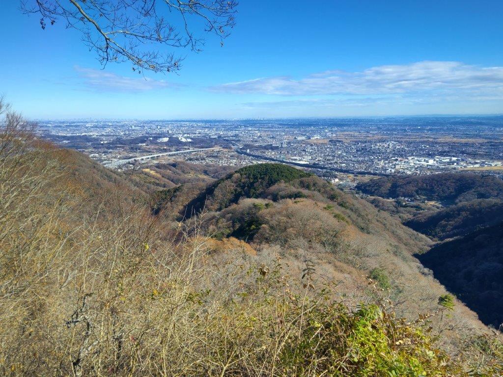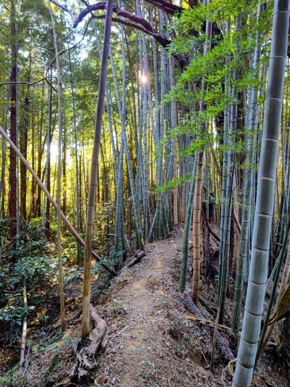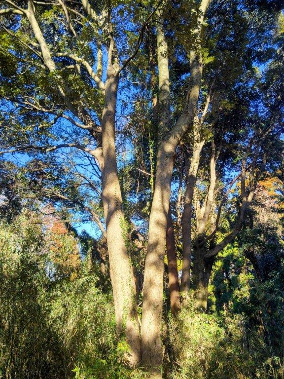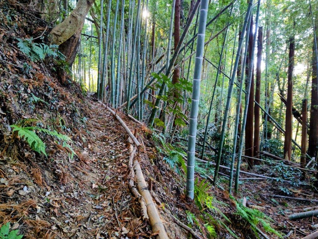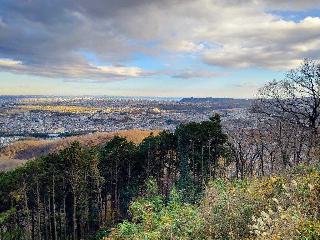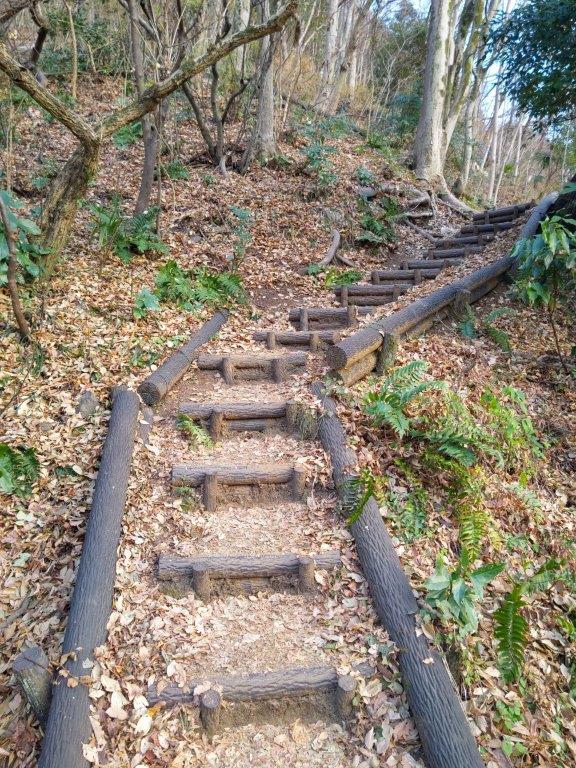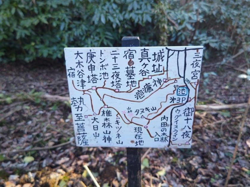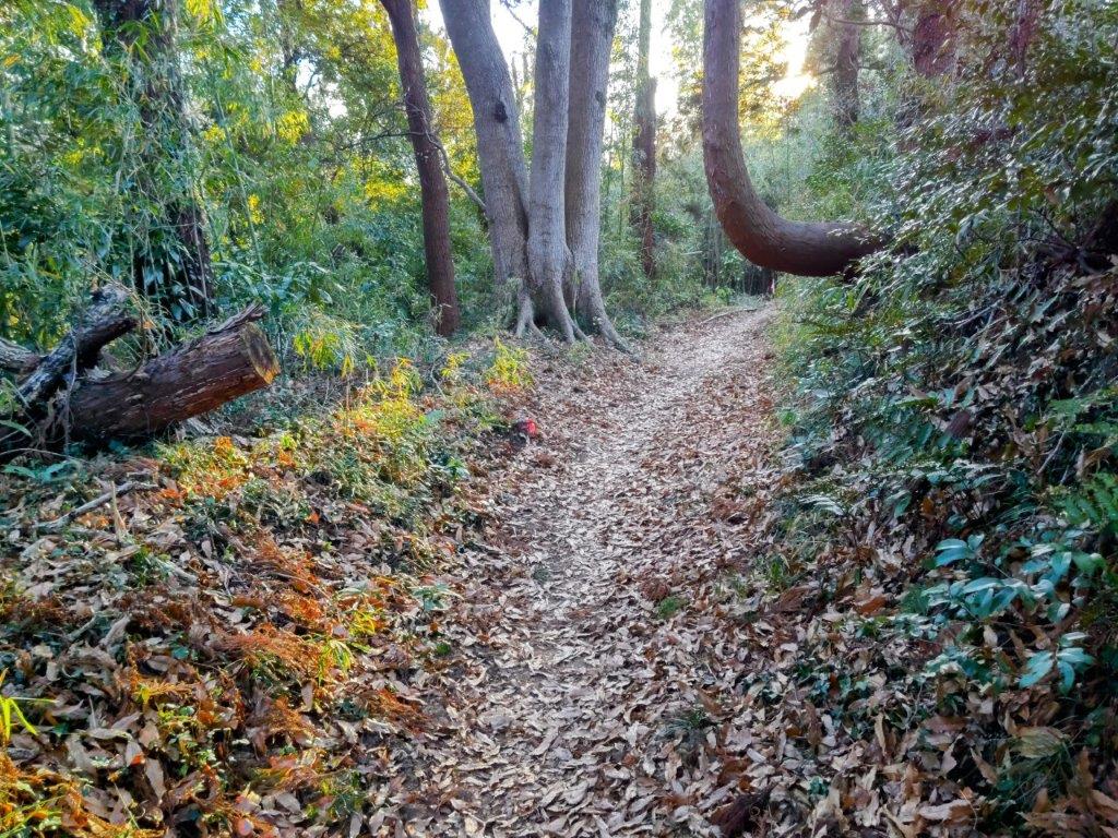 I found myself walking among tall beeches, their tops already bare of leaves, drawing attention to their white trunks. After recrossing the dry riverbed, I reached a paved road where I turned right and soon passed the gated entrance for the road for Fujiyama Twin Terrace, closed to private cars. A little further, I arrived at a sign for today’s mountain, pointing to a faint trail heading up the left side of the dry riverbed. Here, I was glad I could see my position on the Japanwilds digital map since the trail was at times hard to follow. At 1pm, I turned right onto a ridge, the path merging with a signposted trail leading to the summit.