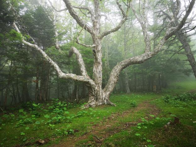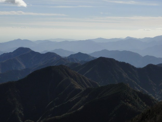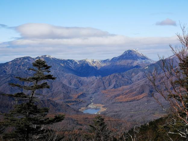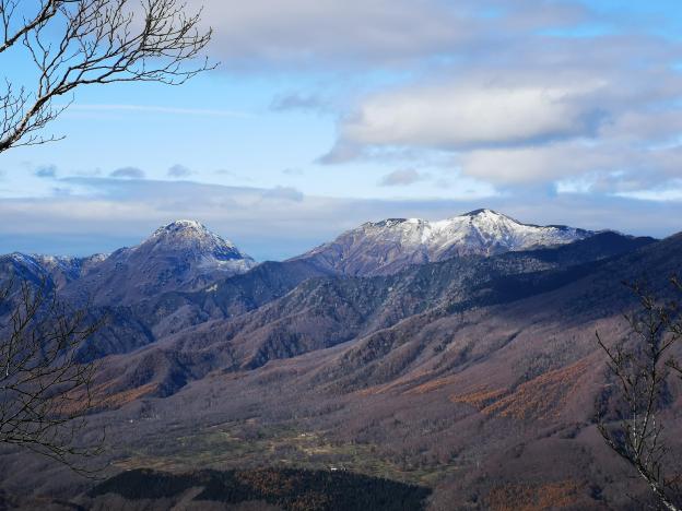 It was a thirty-minute walk along the road, till I reached a turn-off for a forest road closed to cars, and yet another half and hour to reach the start of the hiking trail. Autumn was late this year, and the needles of the fiery larch trees were still tumbling to the ground. I finally started climbing at 10h30. Very soon, the trees changed to white birch. After one hour of steep climbing, I reached the top of the ridge – actually the crater rim since it’s a volcano – and my first views. Looking back, I could see the entire Togakushi highland, as well as Mt Takatsuma and Mt Izuna. In the distance, I could see the Northern Alps, Mt Yatsugatake and Mt Asama, with plumes of smoke drifting up. Unfortunately, I couldn’t make out Mt Fuji – it should have been visible but it was perhaps too late in the day. Looking forward, I could see Mt Amakazari, Mt Hiuchi and Mt Myoko, the latter two with a dusting of snow on the top.